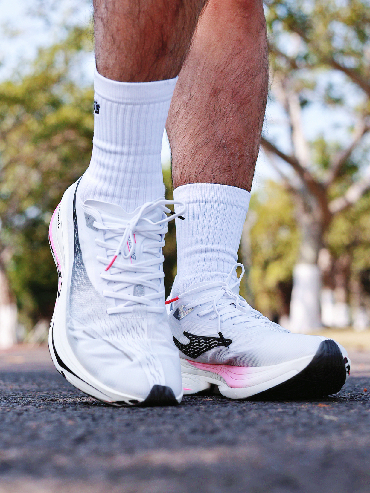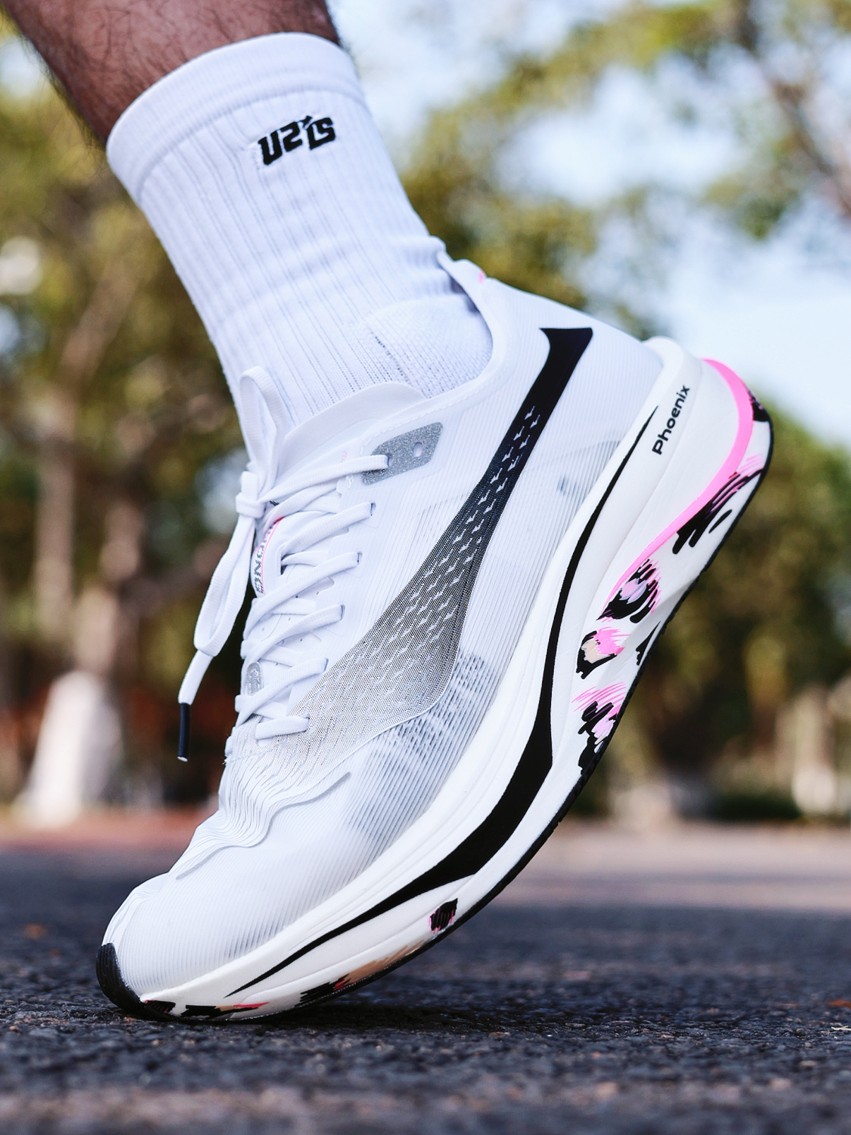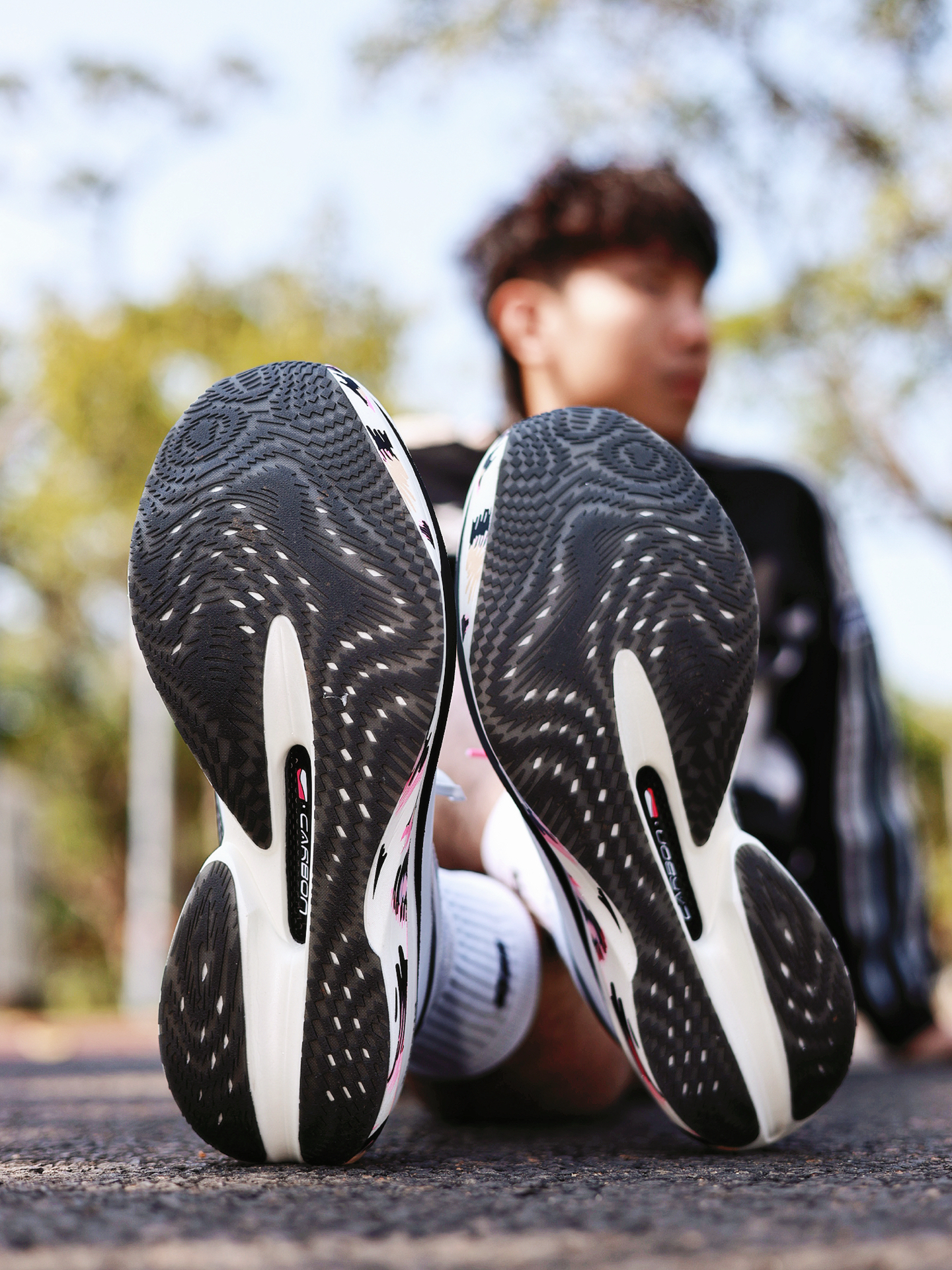 这双飞鸿刚上脚,第一眼就被颜值拿捏了✨!白银主色调搭粉黑泼墨底,清爽又带点潮酷细节,日常穿也不违和。 摸上去鸿羽鞋面薄得像层透气膜,脚塞进去刚好贴合不挤脚,脚宽星人终于不用愁挤脚问题啦😌。系鞋带时能感觉到包裹感很稳,不会松松垮垮晃脚。 开跑那刻碳板直接发力🚀:薄底路感巨清晰,每步蹬地都有“轻弹助推”的反馈,5mm落差落地像踩在“会借力的软支撑”上,完全没硬邦邦的硌脚感。看这鞋底纹路,止滑力比普...