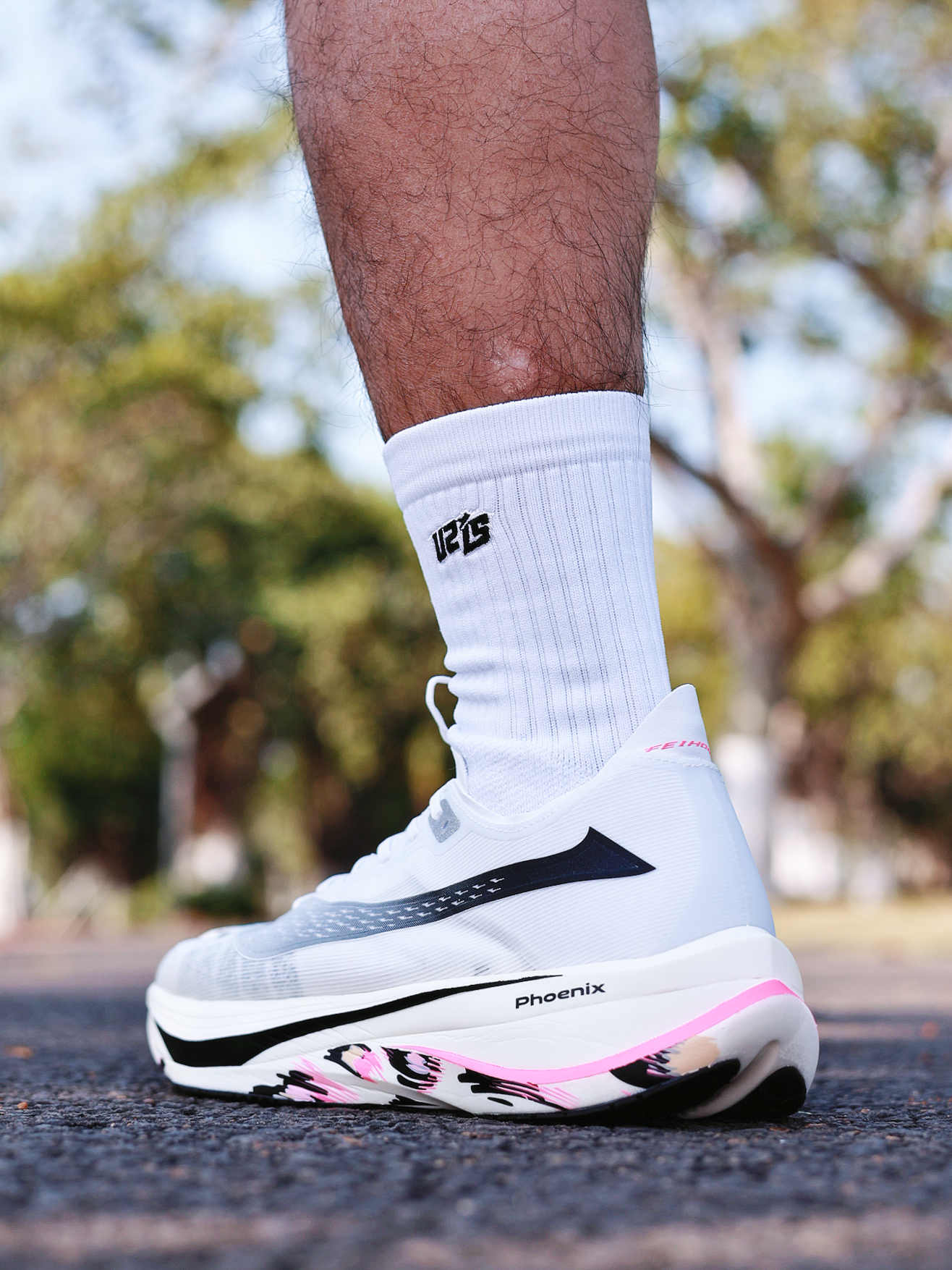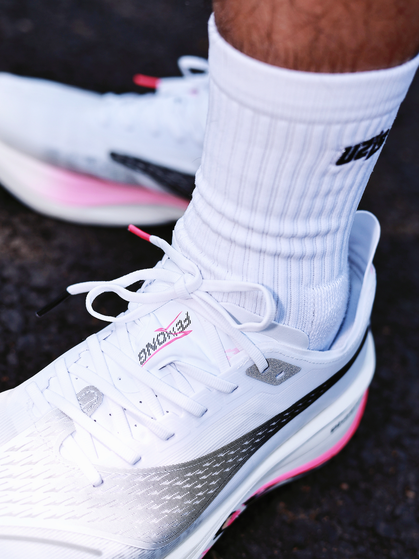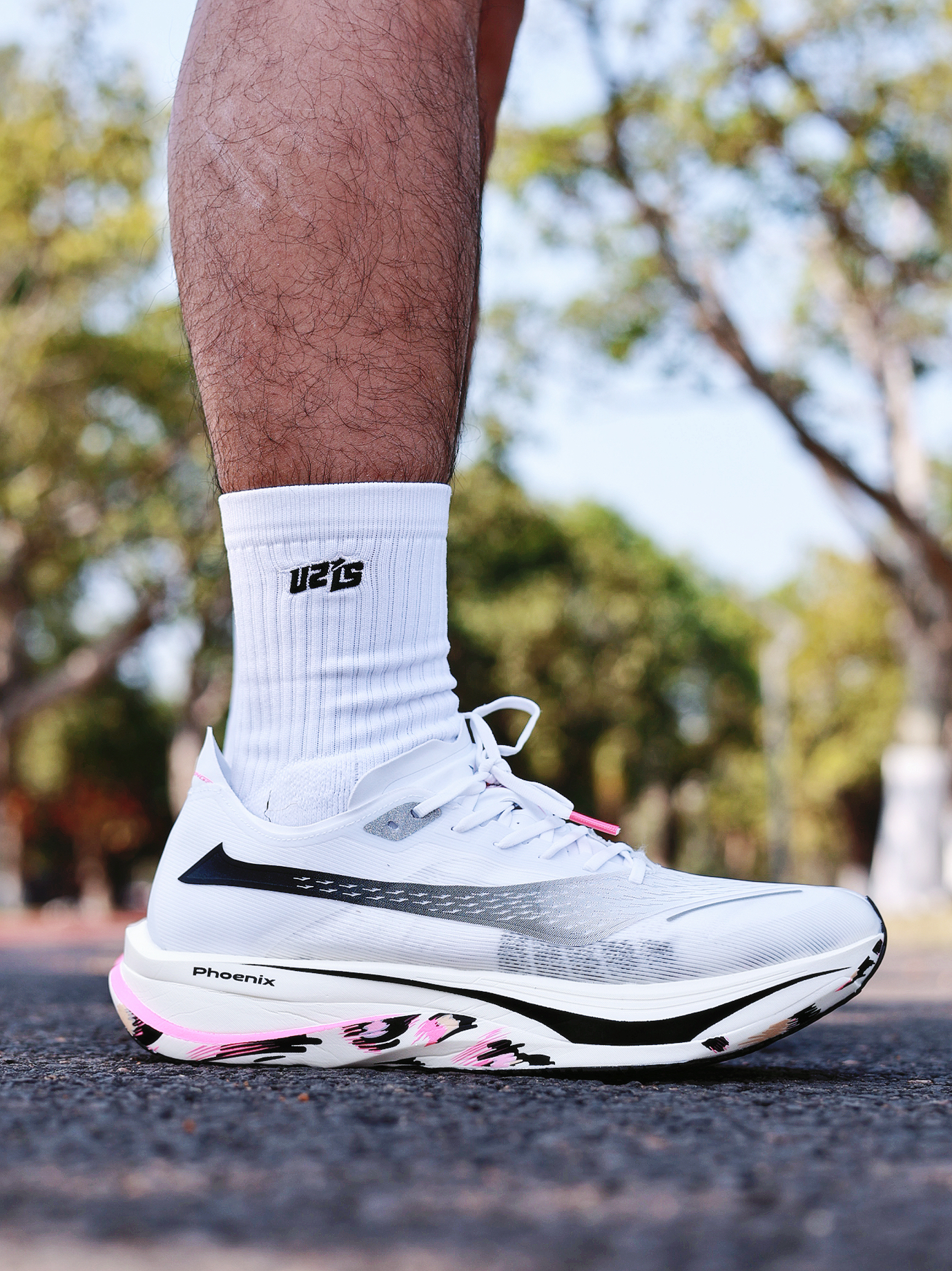 这双飞鸿刚上脚,第一眼就被颜值拿捏了✨!白银主色调搭粉黑泼墨底,清爽又带点潮酷细节,日常穿也不违和。 摸上去鸿羽鞋面薄得像层透气膜,脚塞进去刚好贴合不挤脚,脚宽星人终于不用愁挤脚问题啦😌。系鞋带时能感觉到包裹感很稳,不会松松垮垮晃脚。 开跑那刻碳板直接发力🚀:薄底路感巨清晰,每步蹬地都有“轻弹助推”的反馈,5mm落差落地像踩在“会借力的软支撑”上,完全没硬邦邦的硌脚感。看这鞋底纹路,止滑力比普...