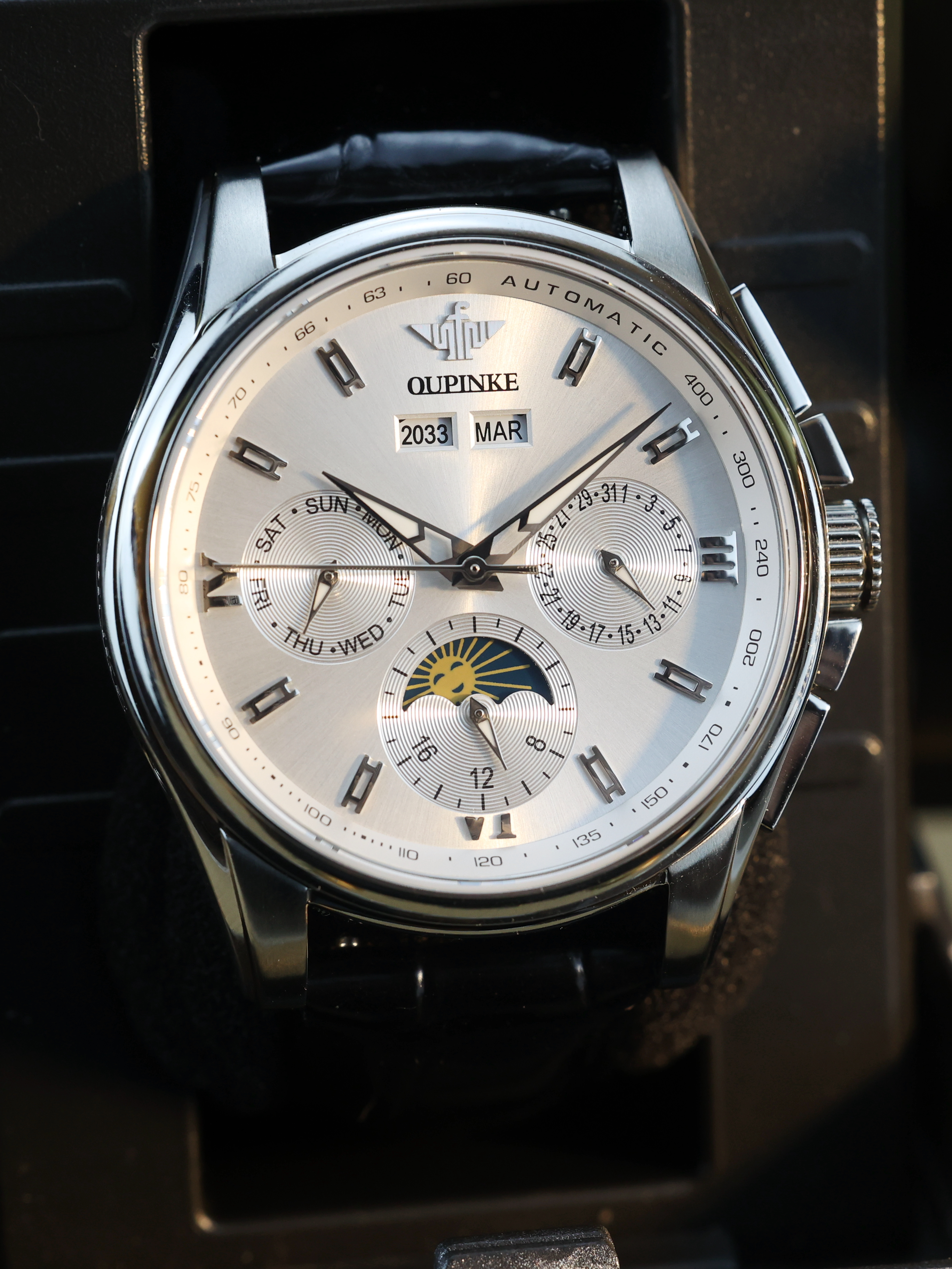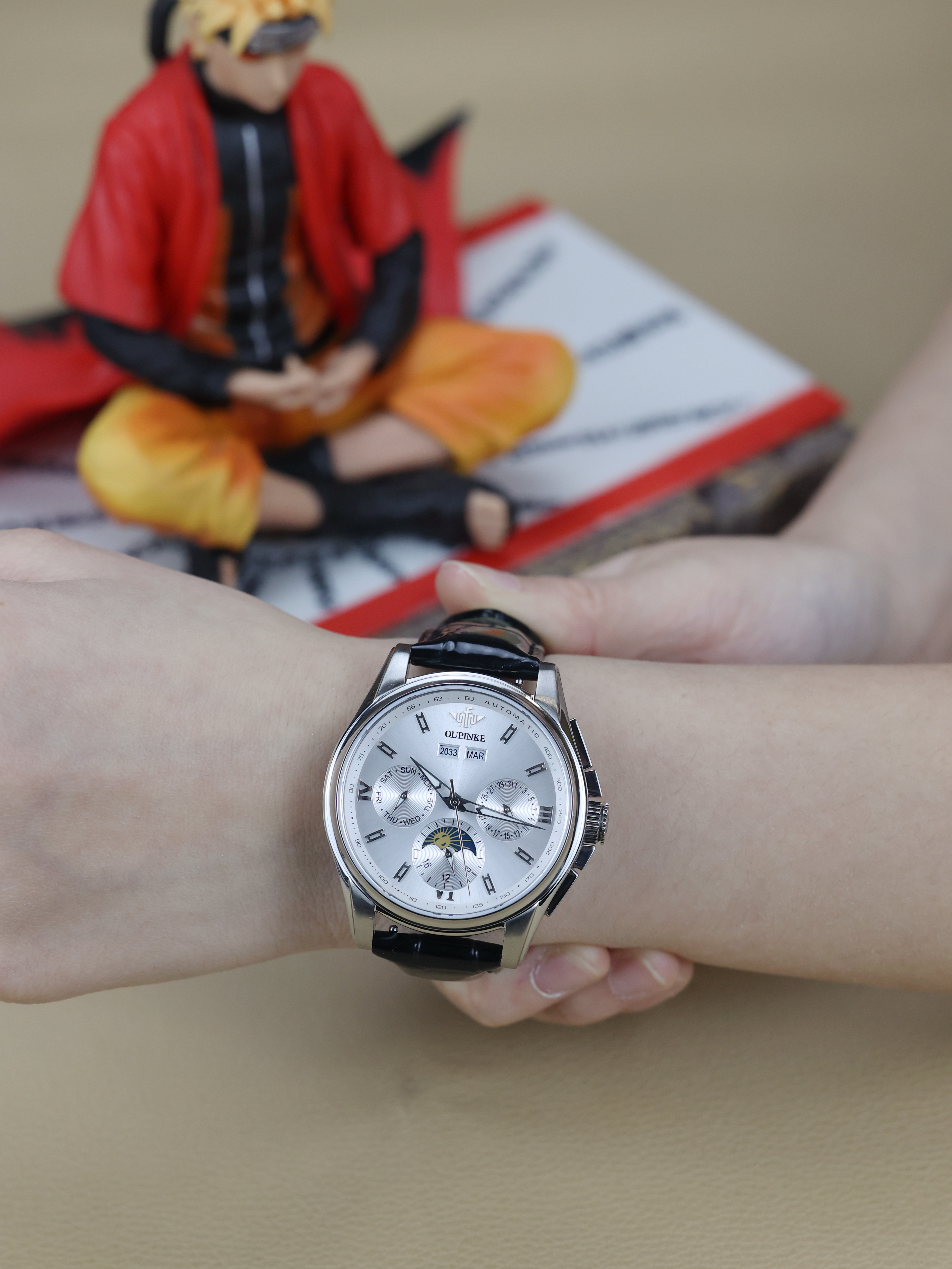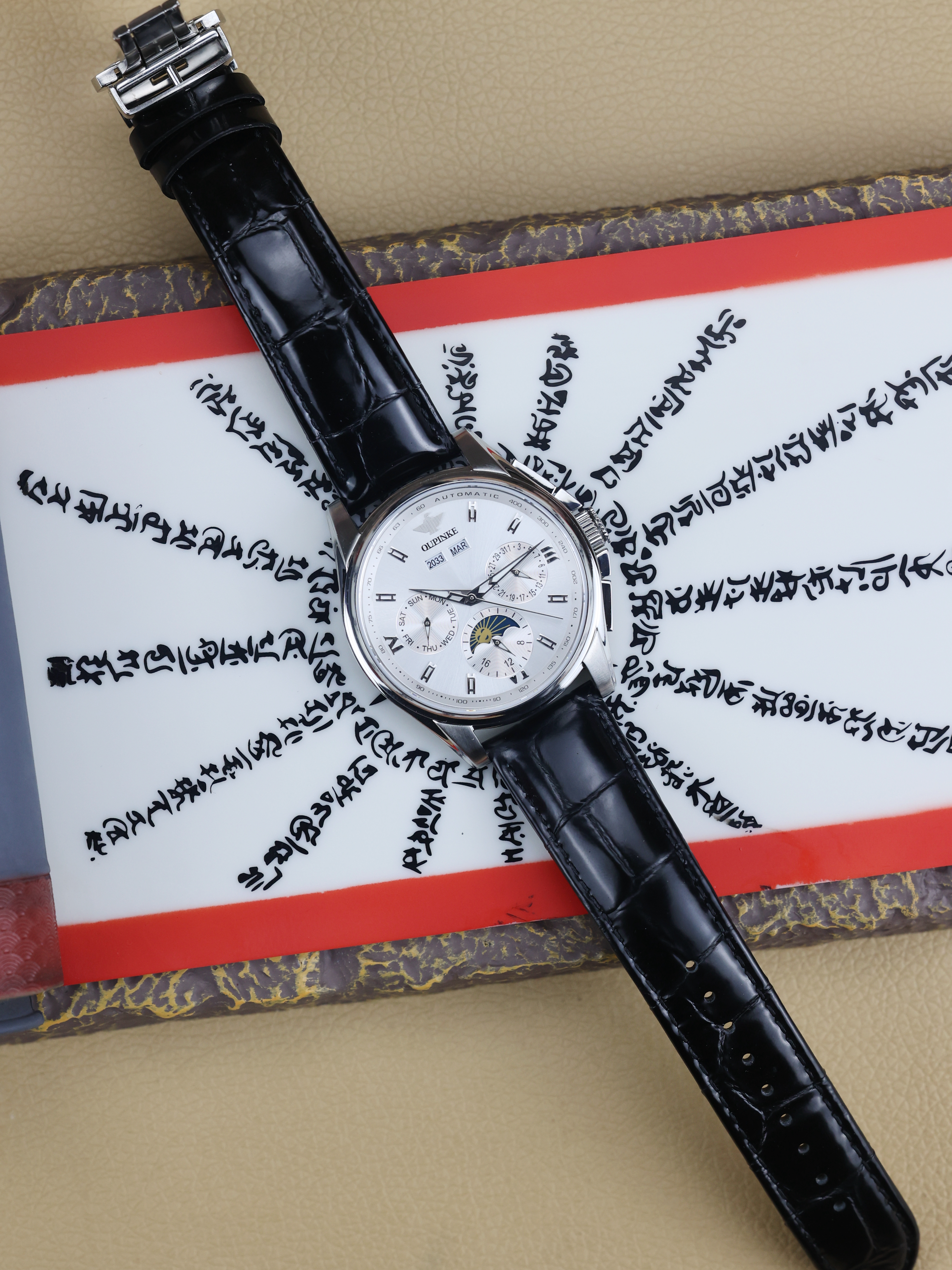 本篇笔记关联了OUPINKE/欧品客 时尚多功能双日历夜光机械男士腕表 P-G3189-MH 【礼盒装】本白黑皮带 等商品,为用户提供真实的使用体验和购买参考。