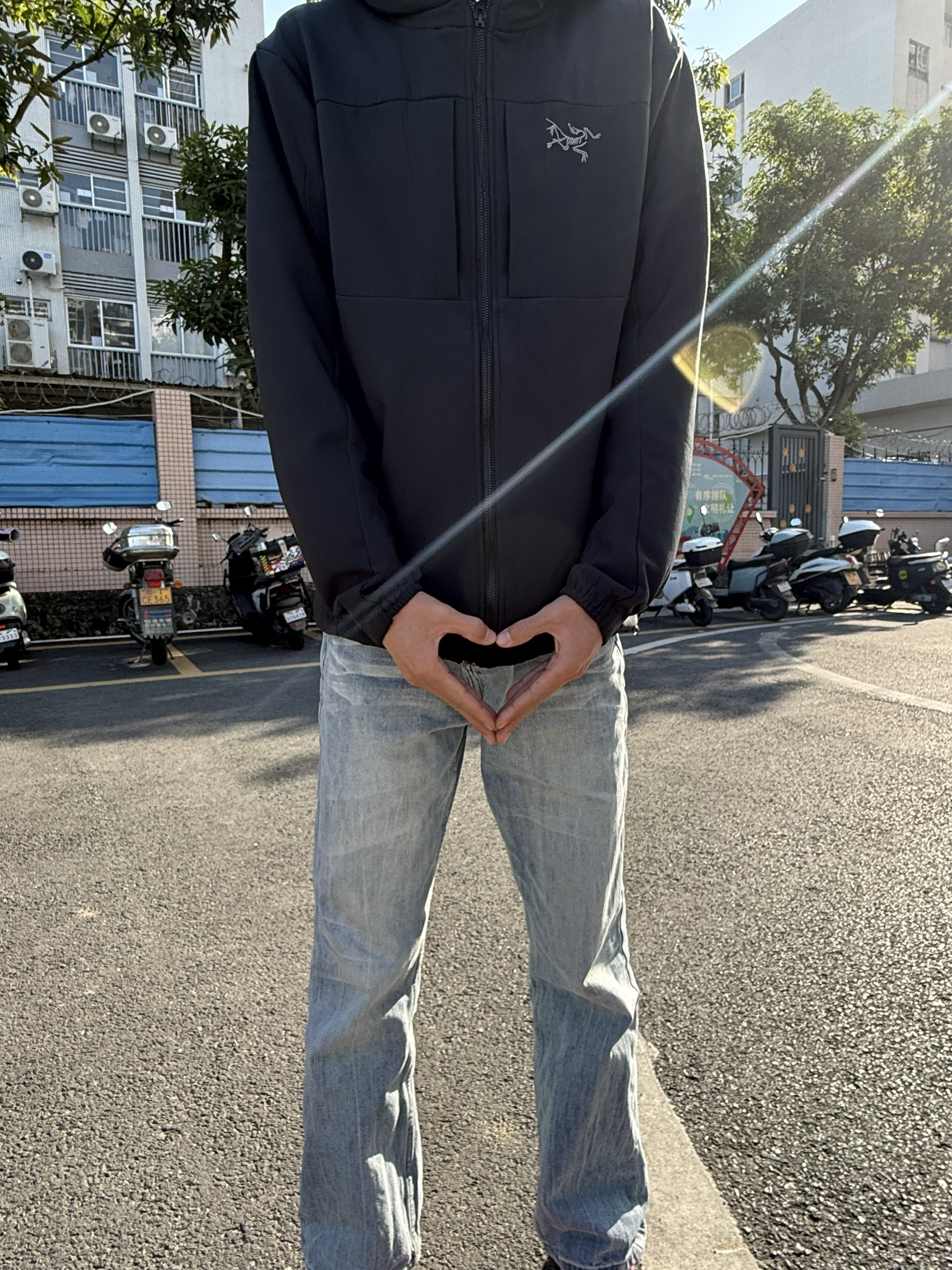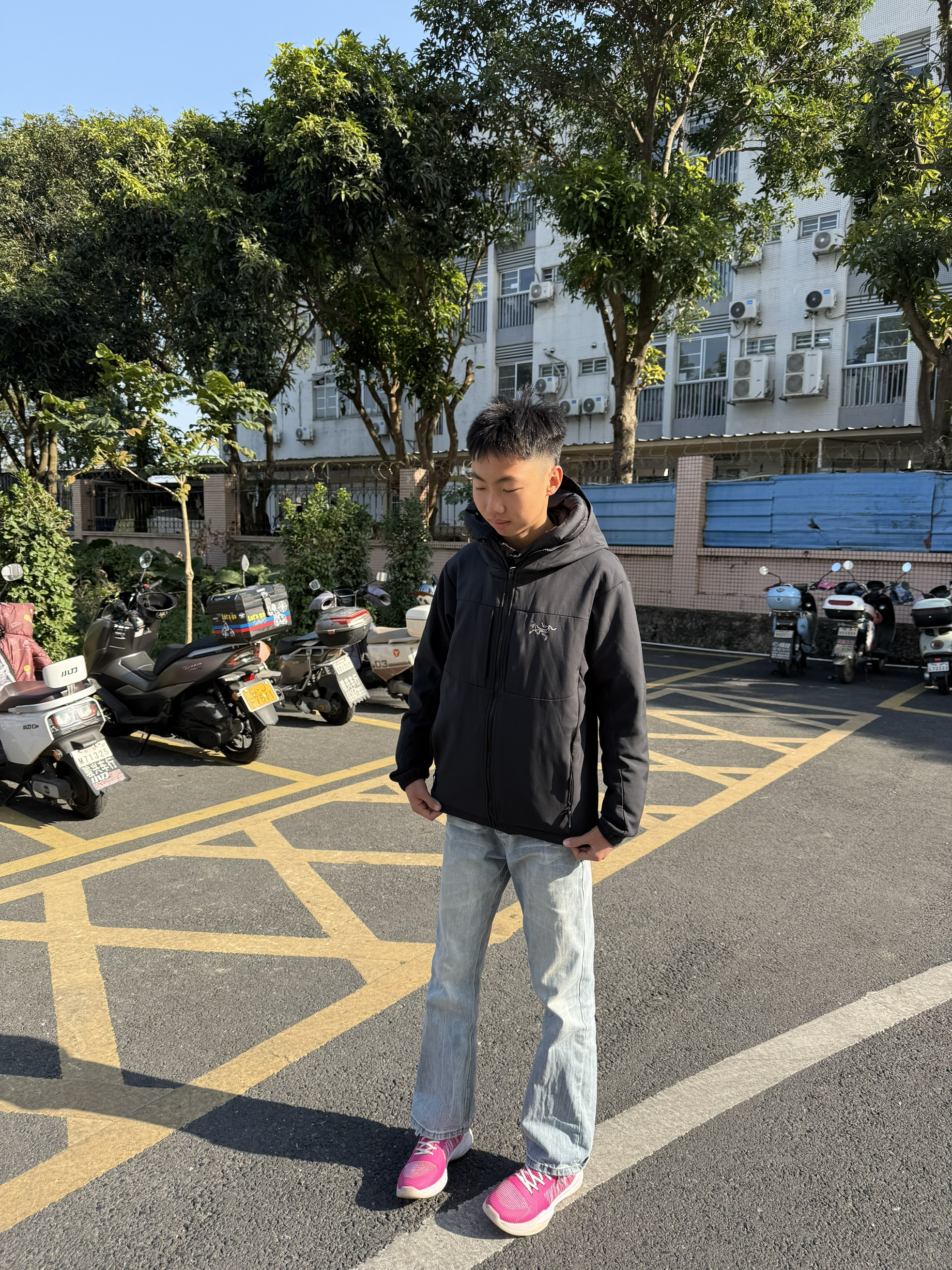 26年入手的第一件冲锋衣!上身是简约的始祖鸟黑色冲锋衣,保暖又利落。下装搭配浅蓝色直筒牛仔裤,版型挺括。脚上的粉色运动鞋是亮点,给整体增添一点活力。这套穿着舒服又轻松,出门散步、朋友小聚都很合适,属于实用耐看的搭配。