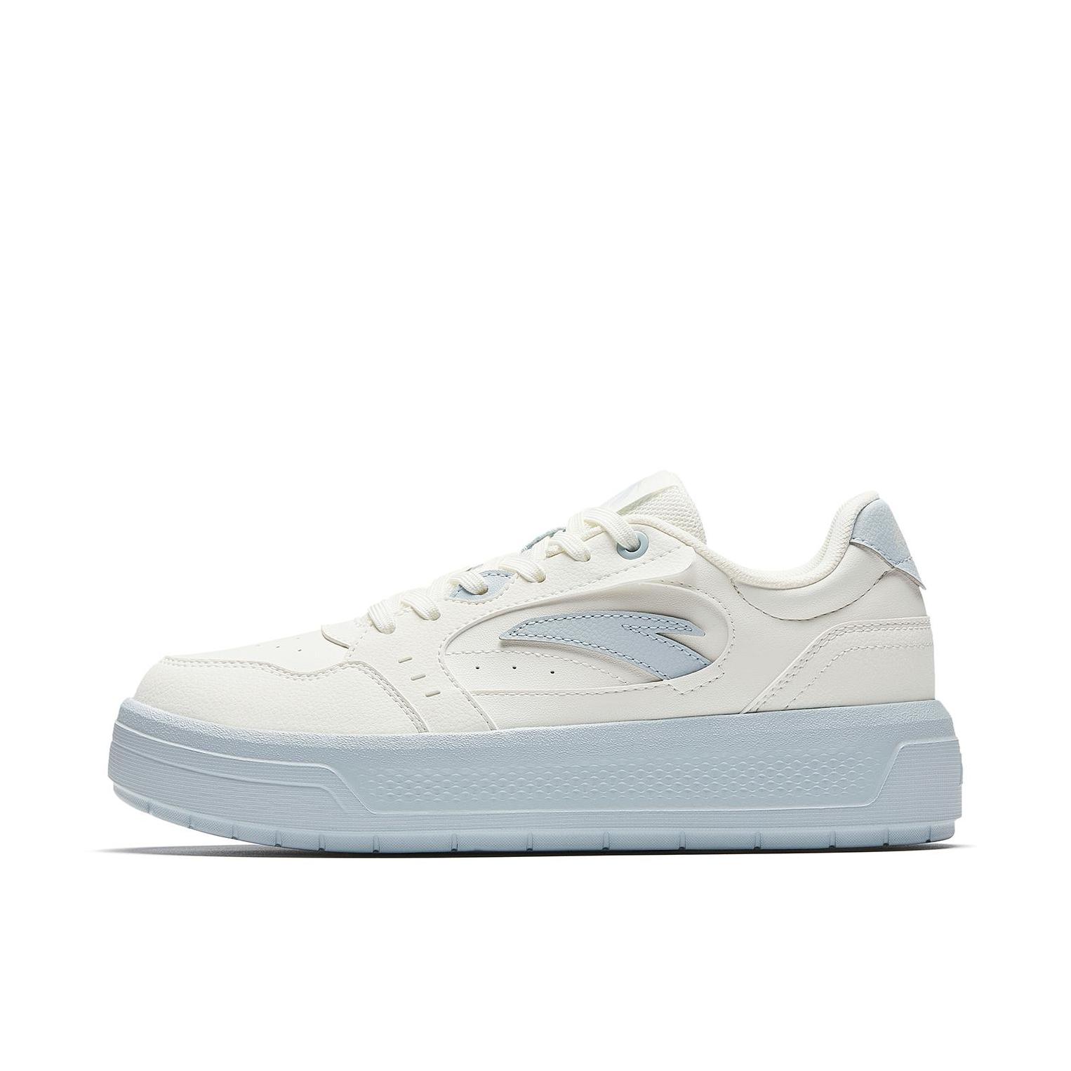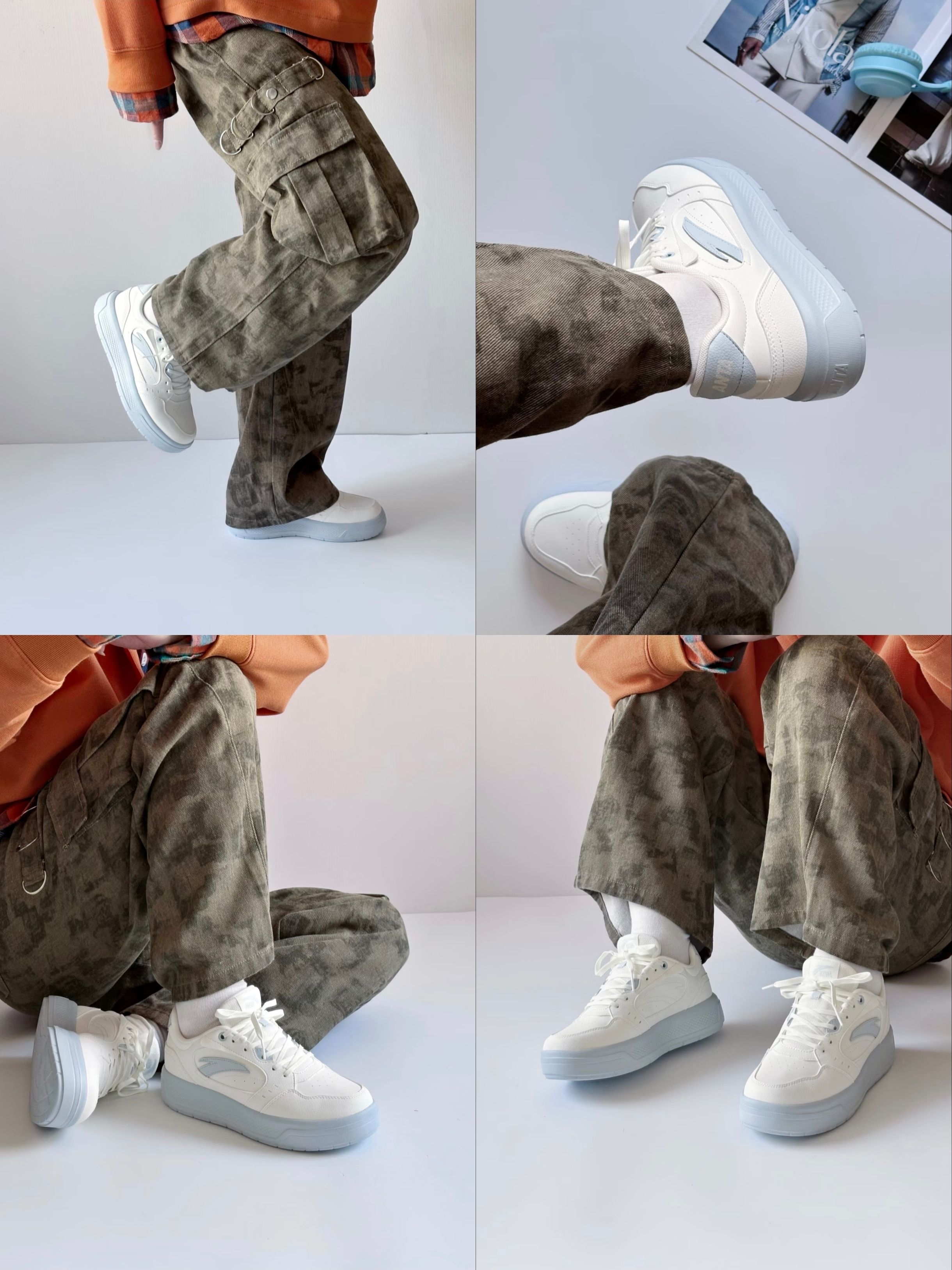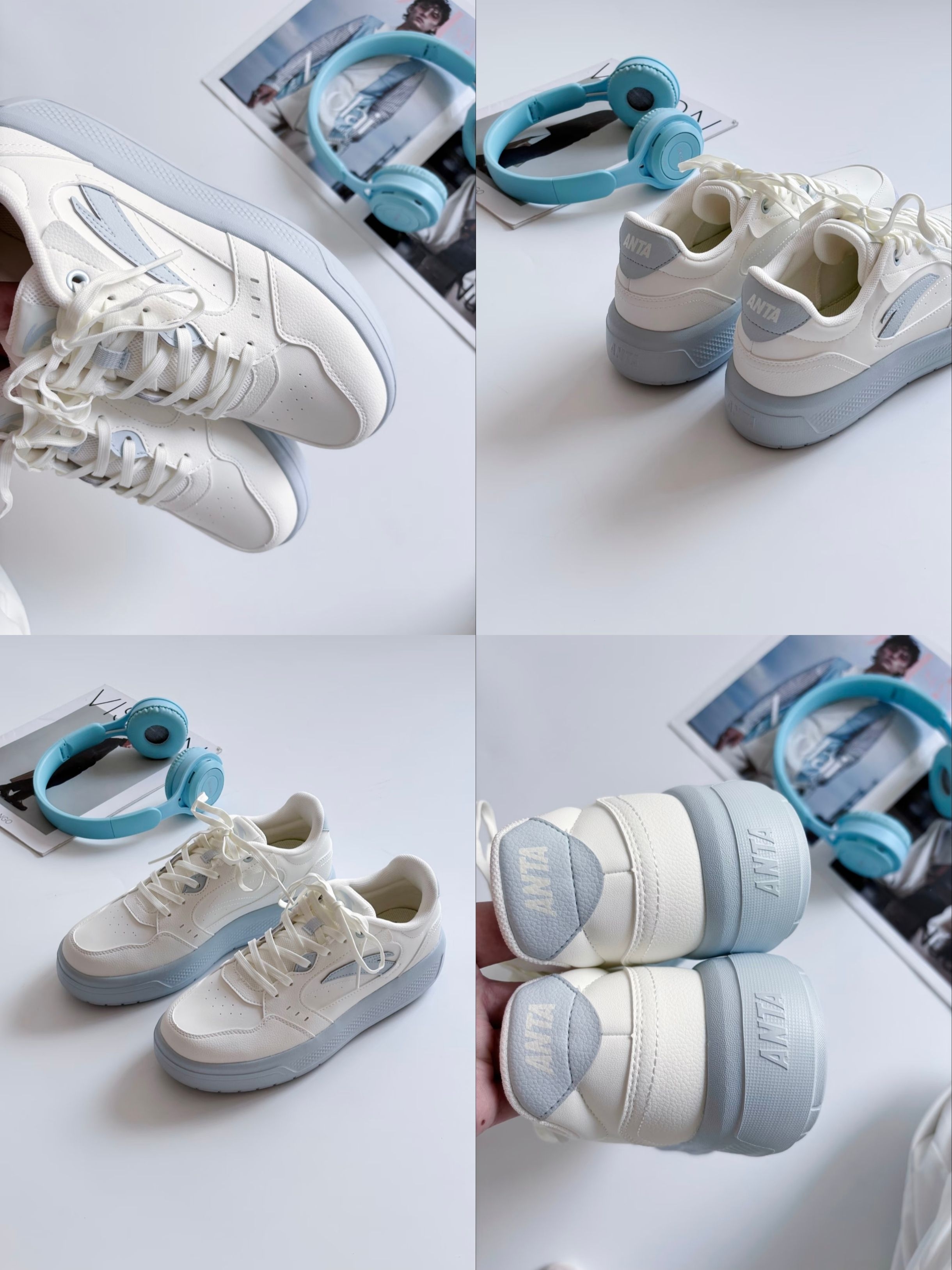 我这款是“白蓝”配色,实物是那种很干净的米白搭配浅灰蓝,非常清爽。鞋面是那种有一定厚度的皮质,不是软塌塌的,所以鞋型挺括,不容易变形。最打动我的是它的车线工整,还有侧面的安踏小标,是那种有点光泽的立体电镀质感,一点不廉价。厚底设计一眼就能看到,但线条做得比较圆润,一点不笨重。
