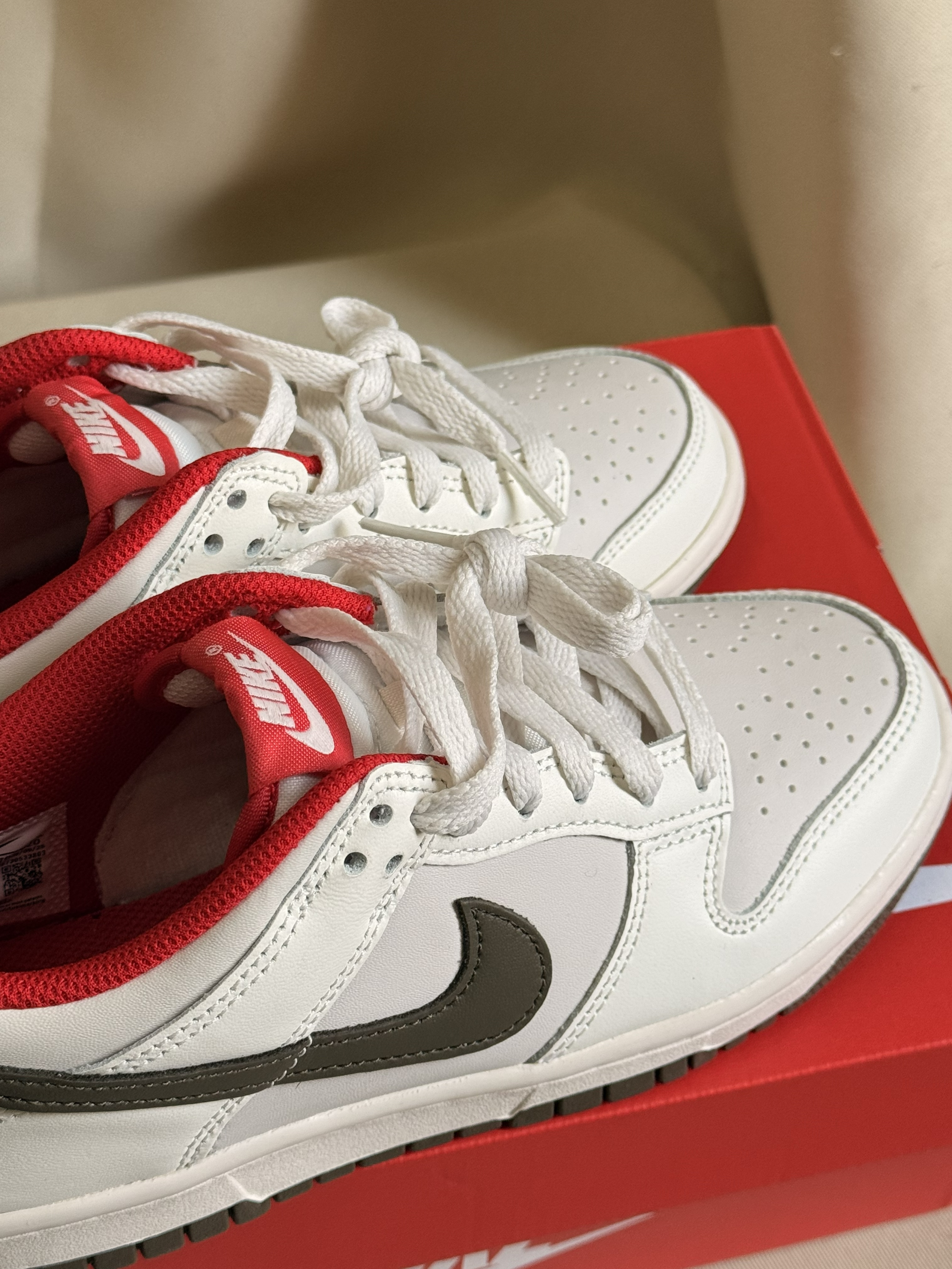 入手了这一双马年限定款 300➕就能买到的儿童款式 内红外白的配色 灰色的钩子 高级简约 不花里胡哨 很百搭好看 细节做工方面也是可以的 没有什么线头 就是dunk的通病鞋底比较硬挺 介意的宝宝可以买一个鞋垫 性价比很高 🉑入!