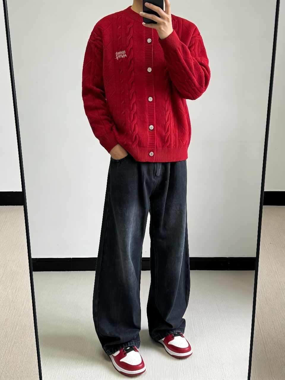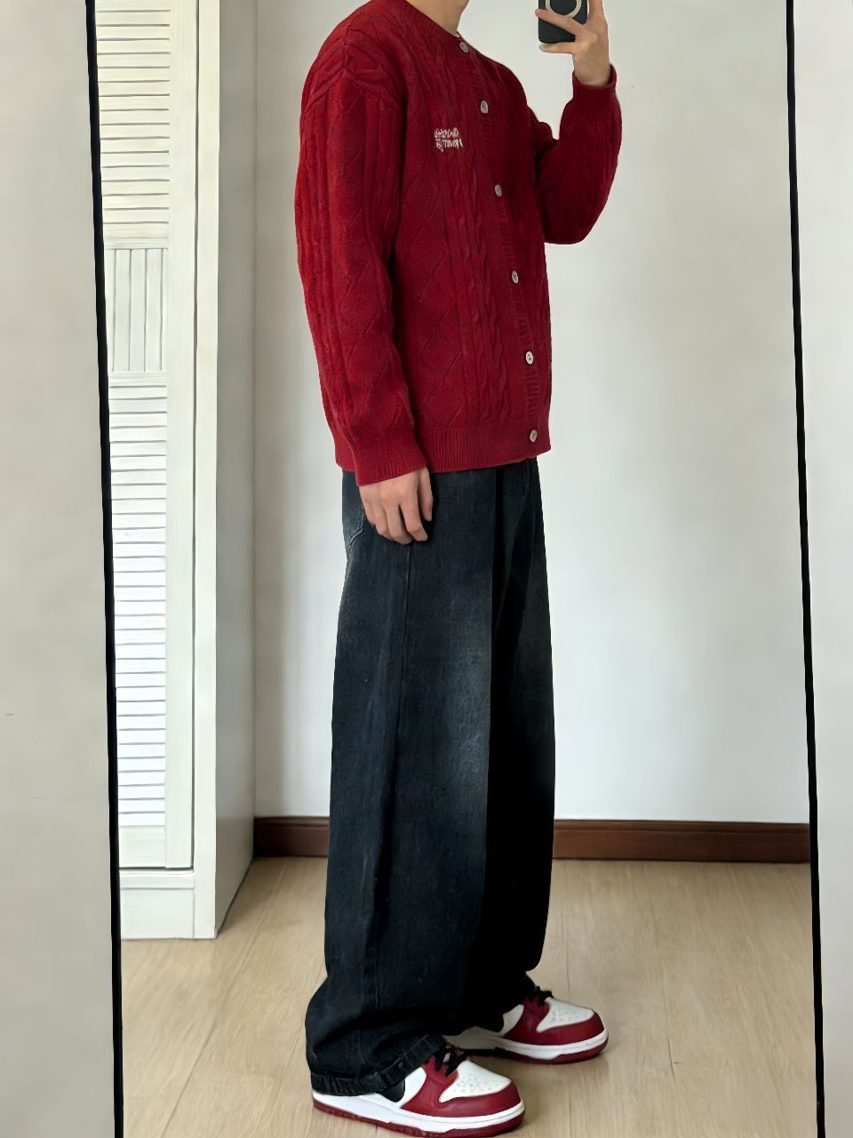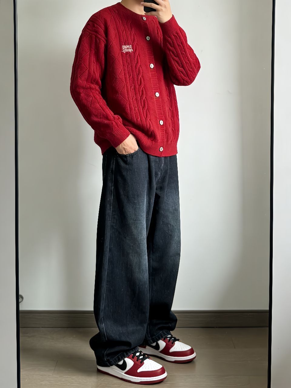降温就该这么穿!FPA这件绞花开衫软糯不扎,扣子全扣或敞着都好看。火火兔的做旧直筒牛仔裤真是梨形救星,垮垮的但不拖沓。重点还是这双Nike Dunk SB芝加哥,红白黑一搭,整套立马亮起来。都是宽松舒服的款,套上就能出门,懒人必备了。
