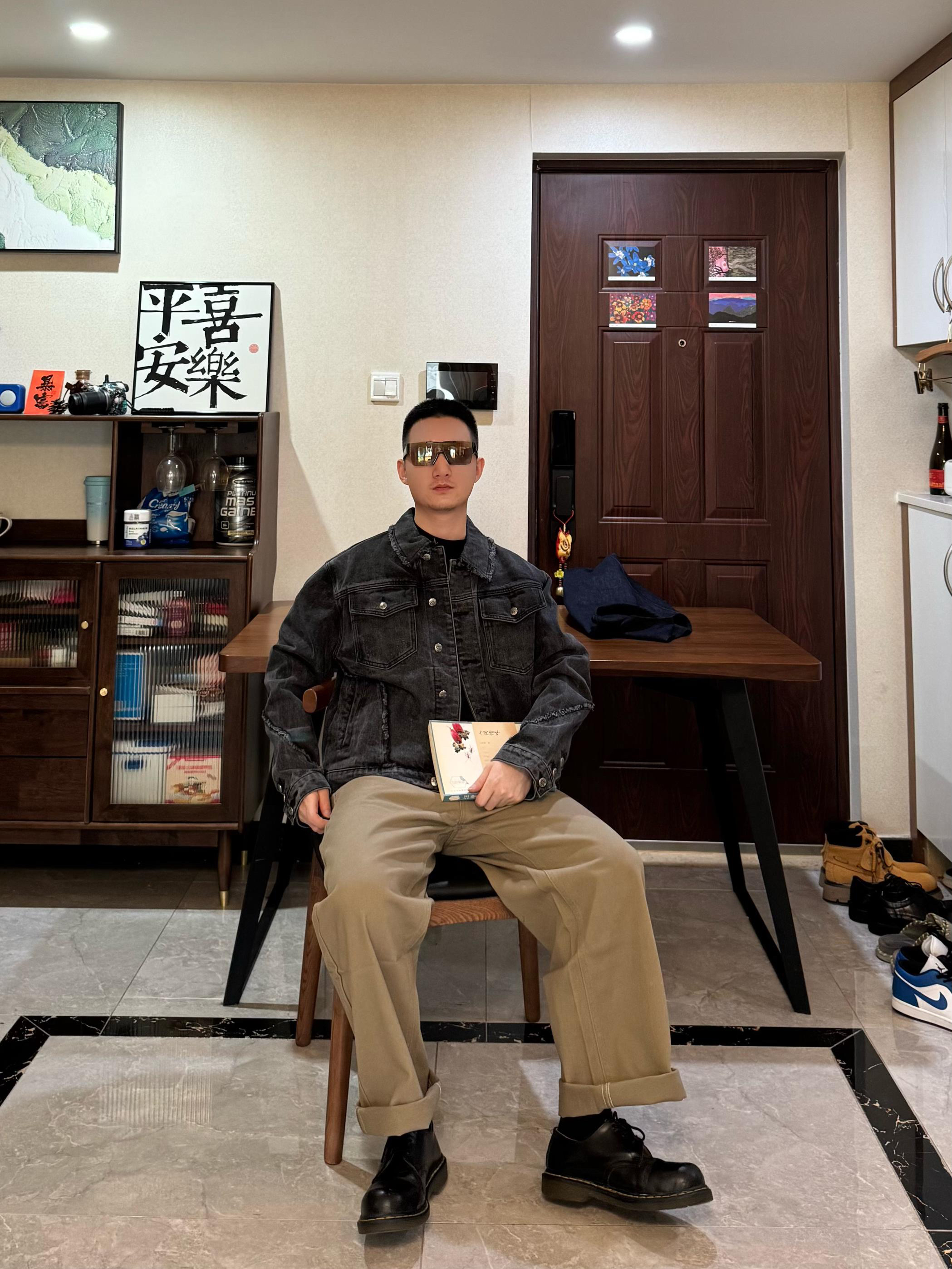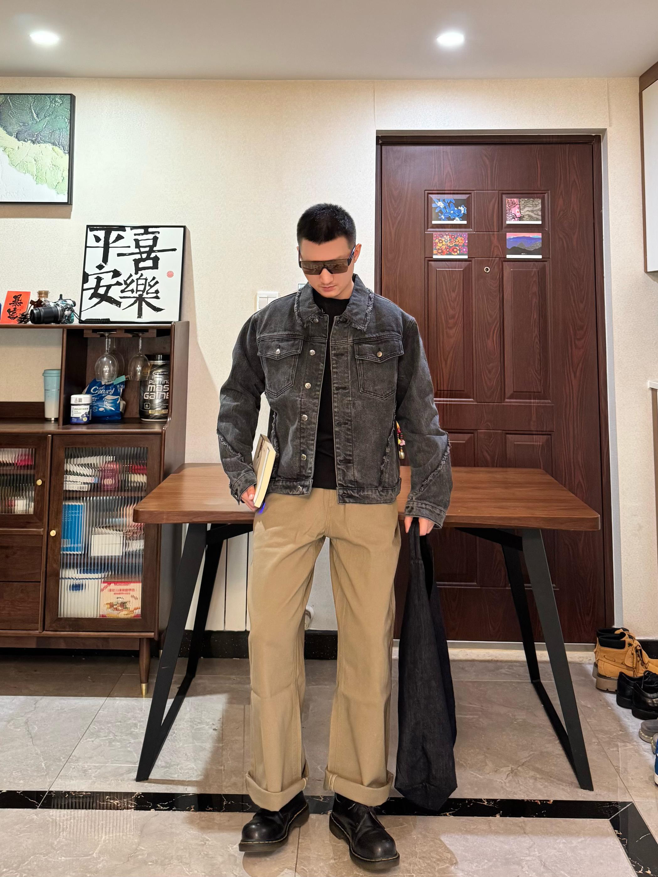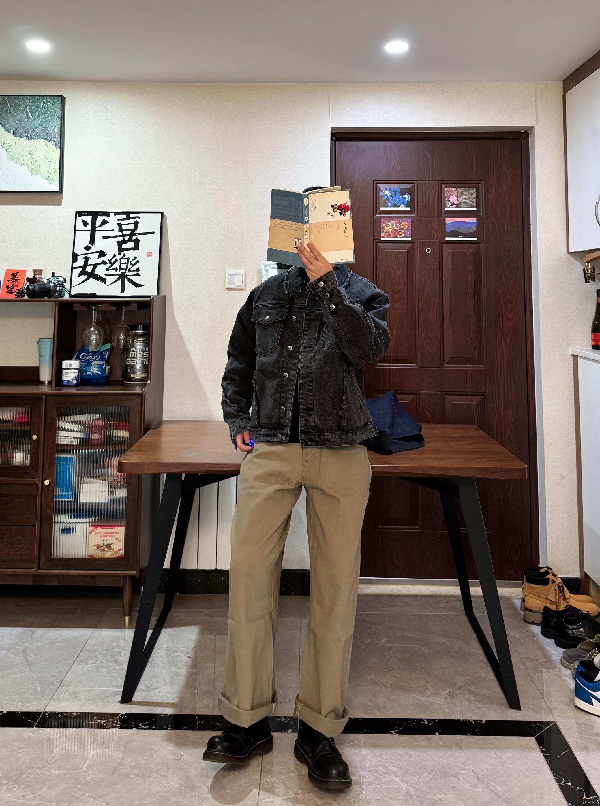 上身是黑灰色牛仔外套。短宽设计硬挺有型~搭配这条浅棕色松绒牛仔裤 面料摸起来很有质感 直筒阔腿的酷刑 修饰身形 显腿嘎嘎长 秋冬穿还能兼顾保暖裤长刚好能堆在鞋面上 但我更喜欢叠起来 显松弛感~我身高176CM 体重65KG 穿L码宽松 再配一双黑色马丁靴 日常出街、咖啡店拍照都很出片哦!
