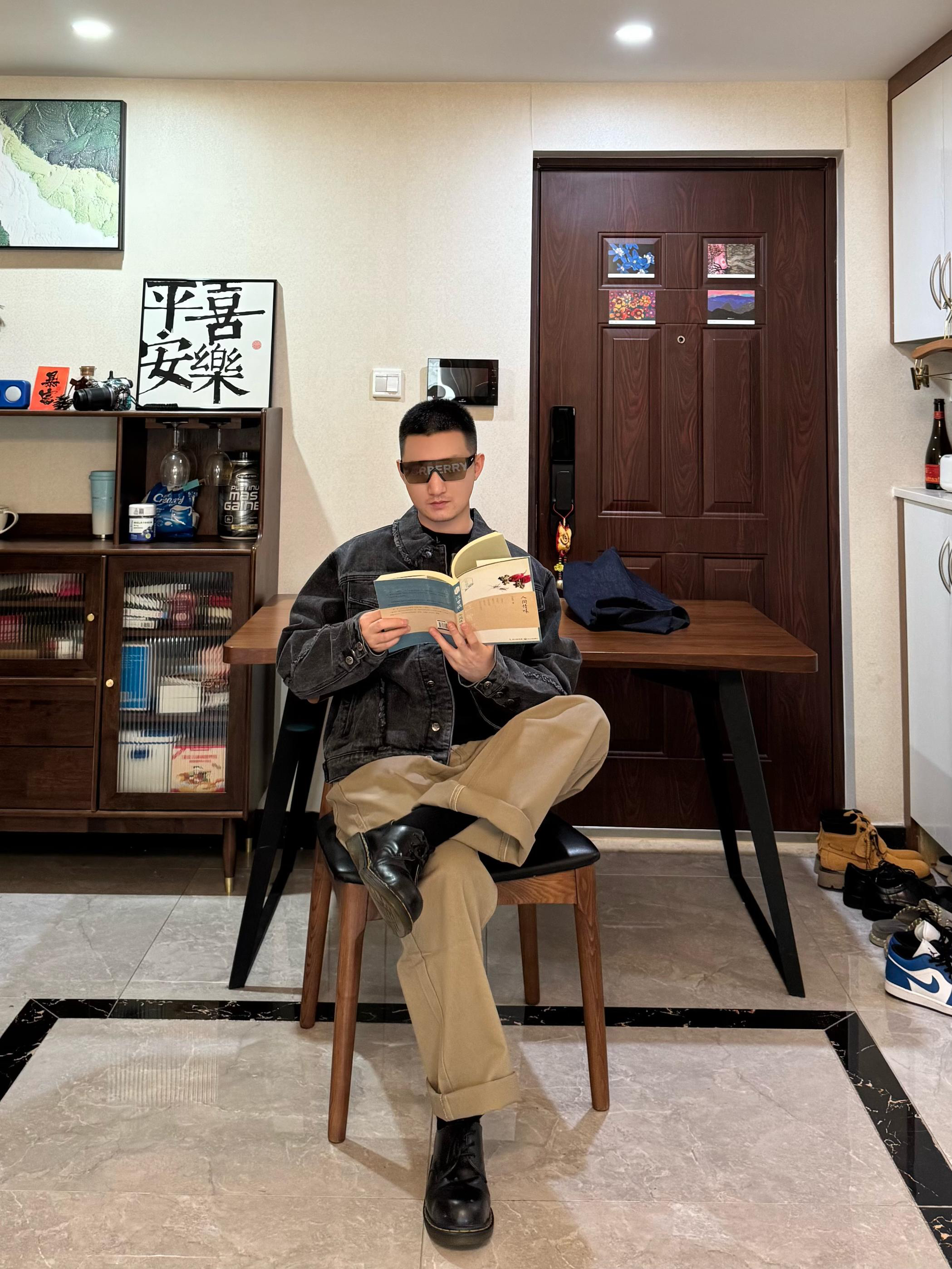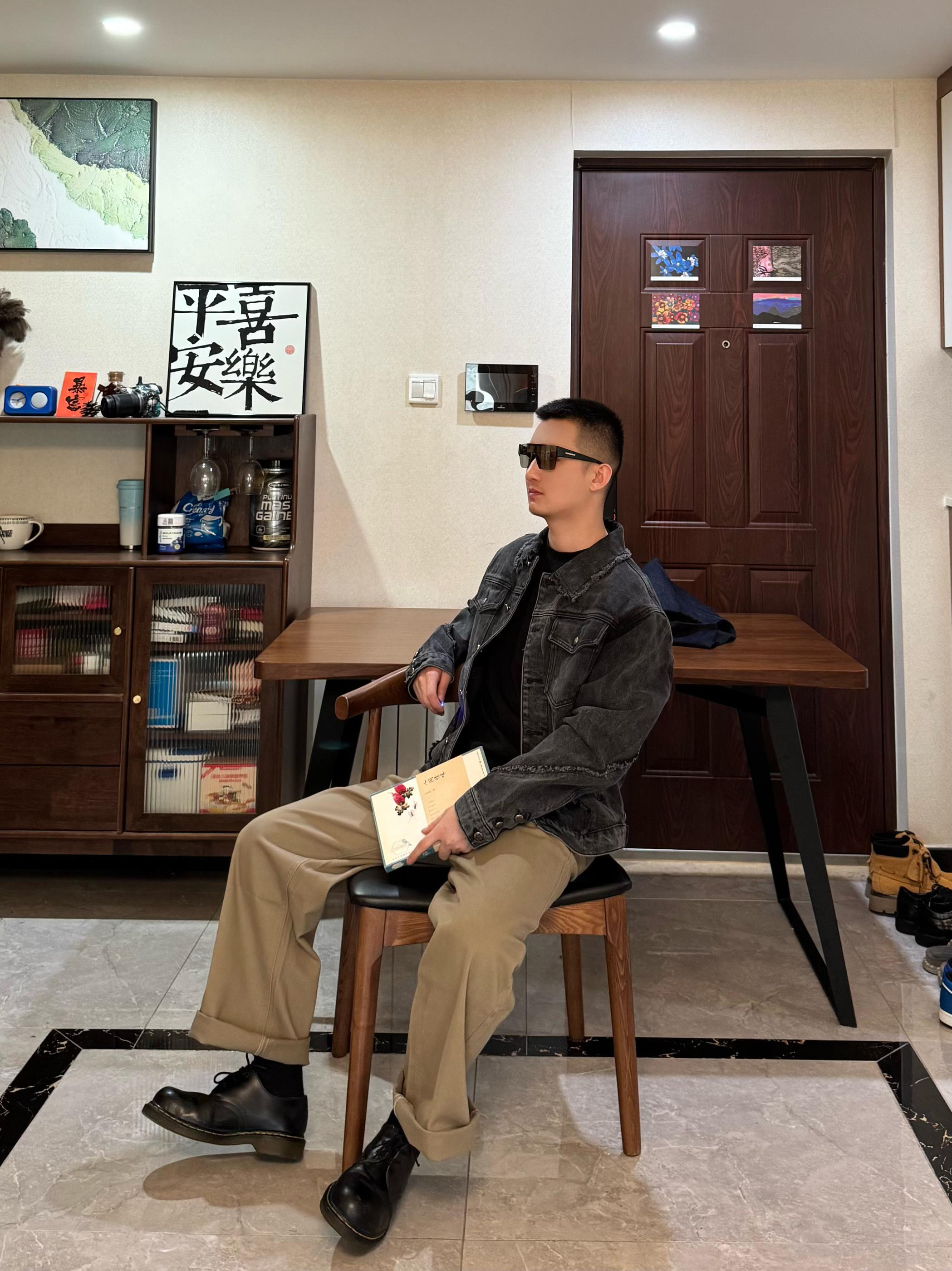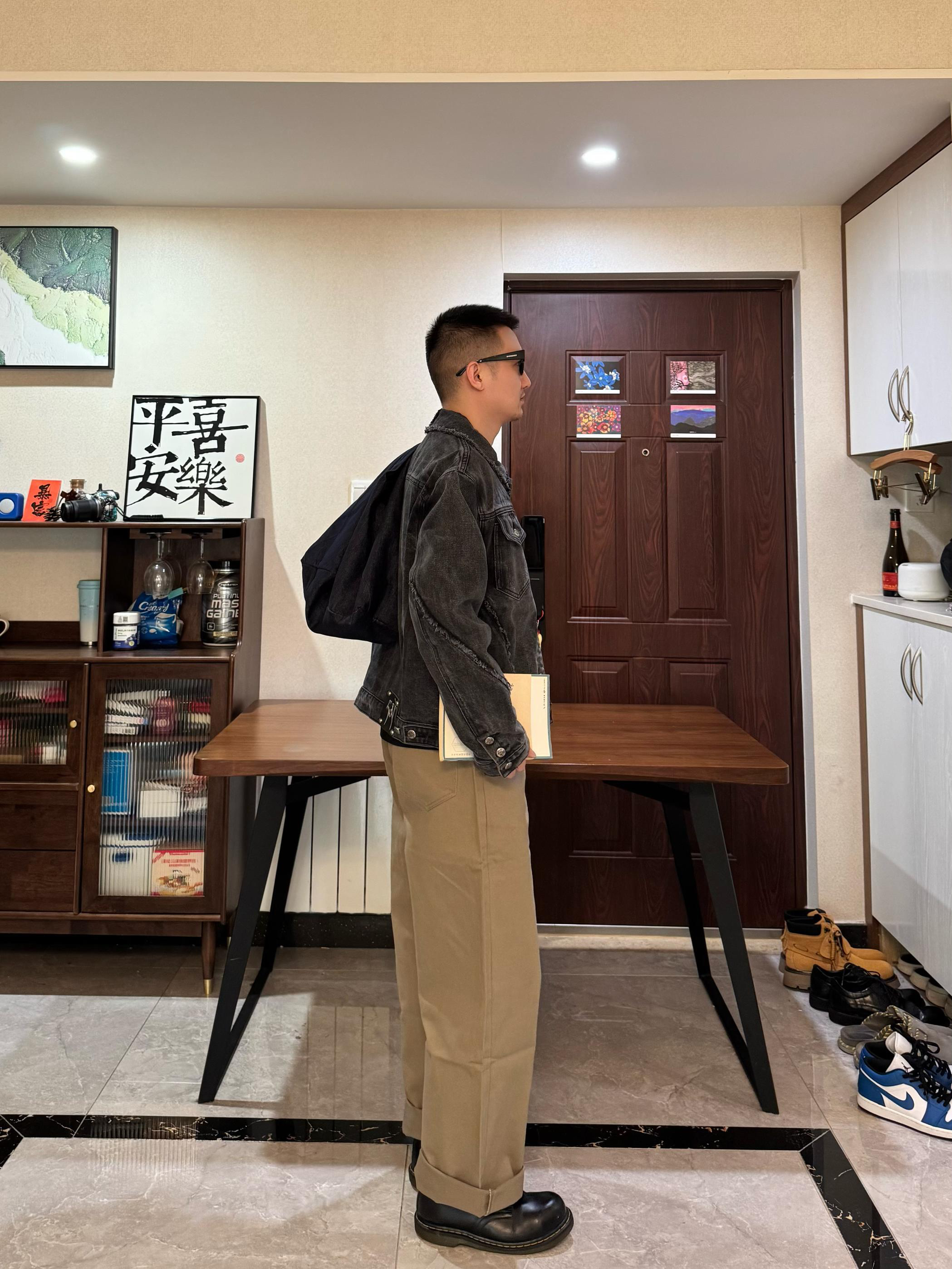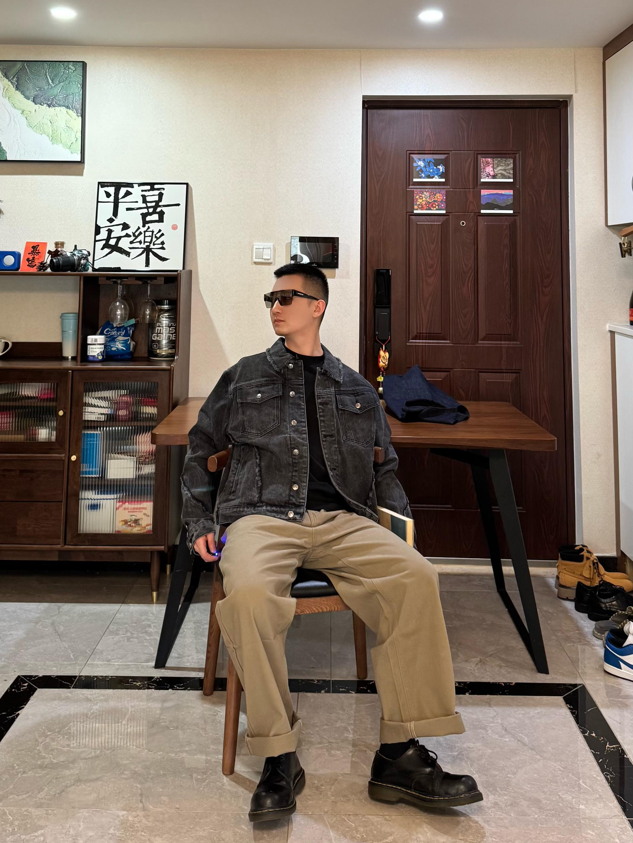 上身是黑灰色牛仔外套。短宽设计硬挺有型~搭配这条浅棕色松绒牛仔裤 面料摸起来很有质感 直筒阔腿的酷刑 修饰身形 显腿嘎嘎长 秋冬穿还能兼顾保暖裤长刚好能堆在鞋面上 但我更喜欢叠起来 显松弛感~我身高176CM 体重65KG 穿L码宽松 再配一双黑色马丁靴 日常出街、咖啡店拍照都很出片哦!