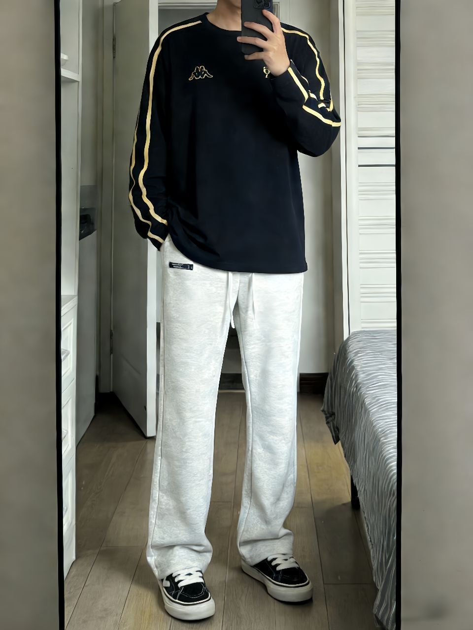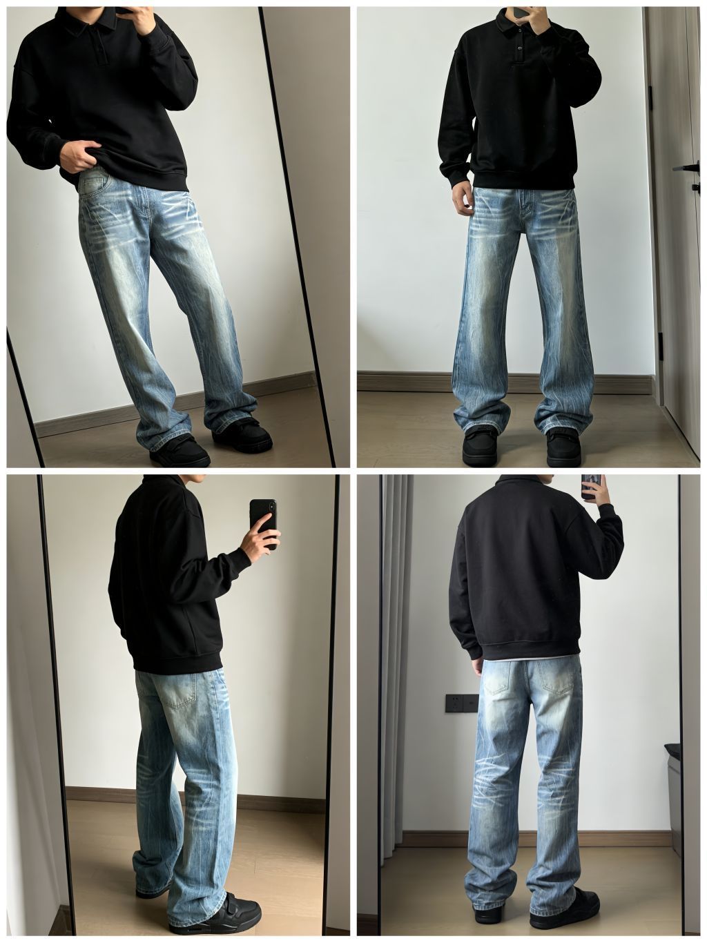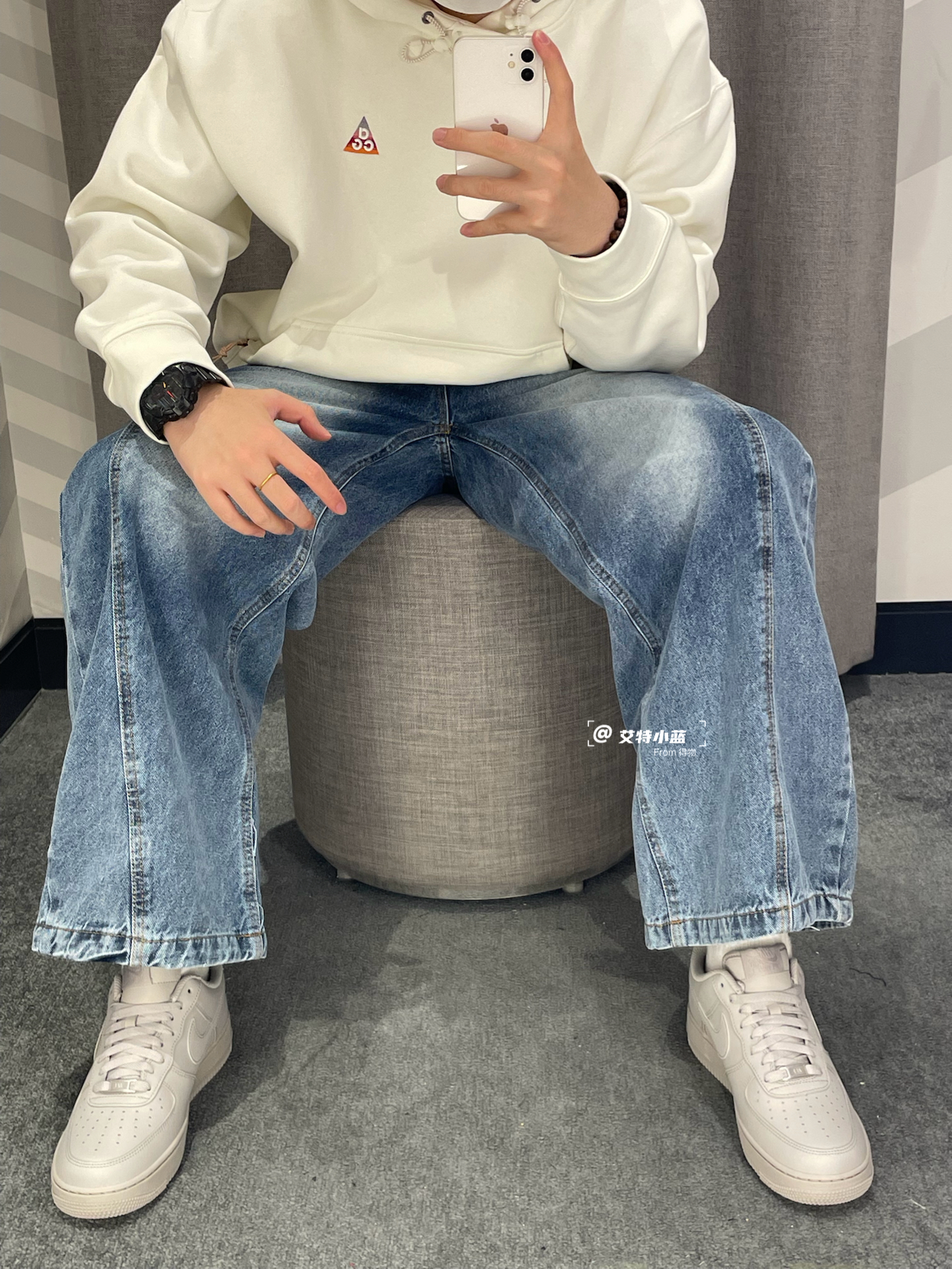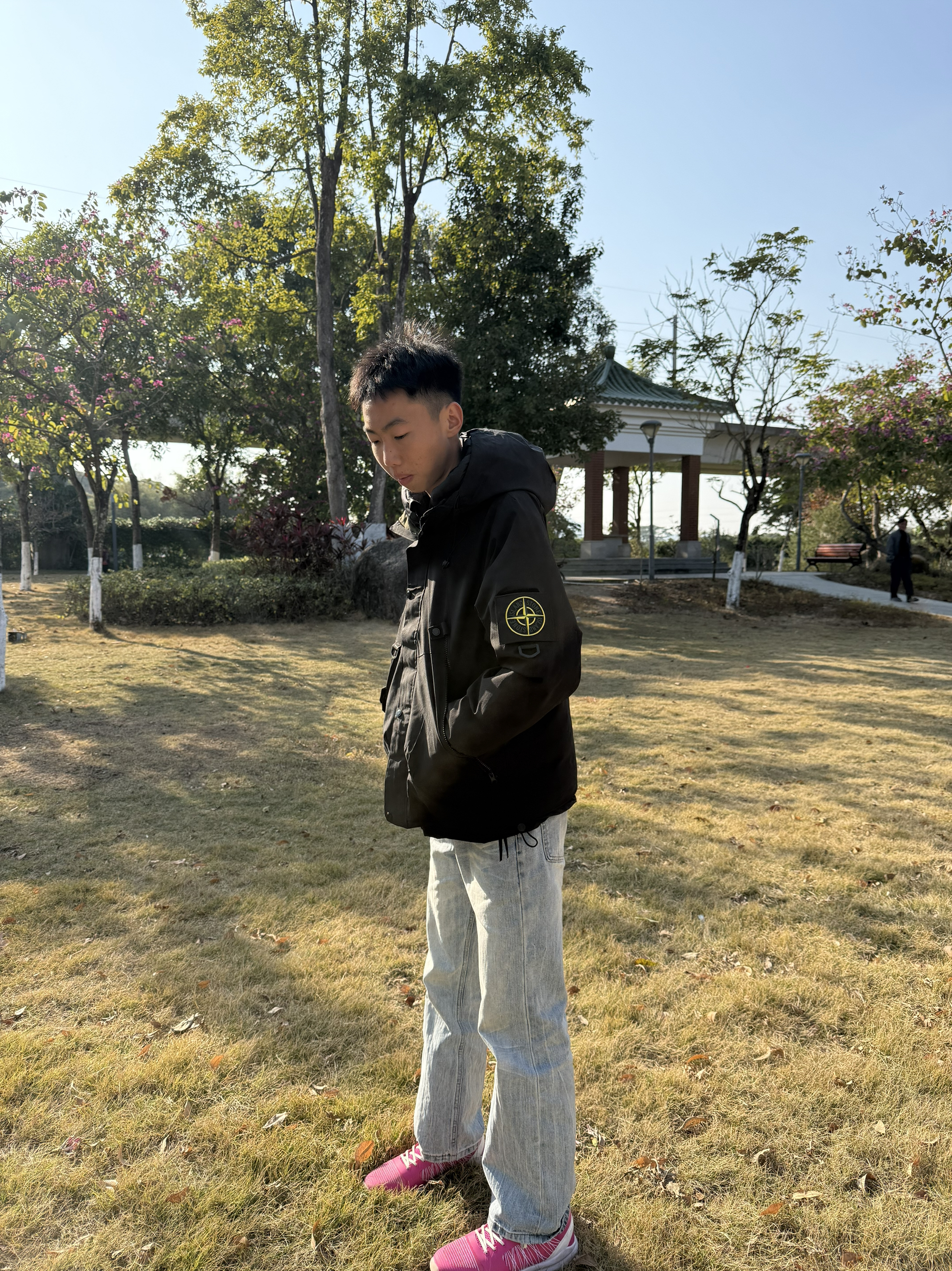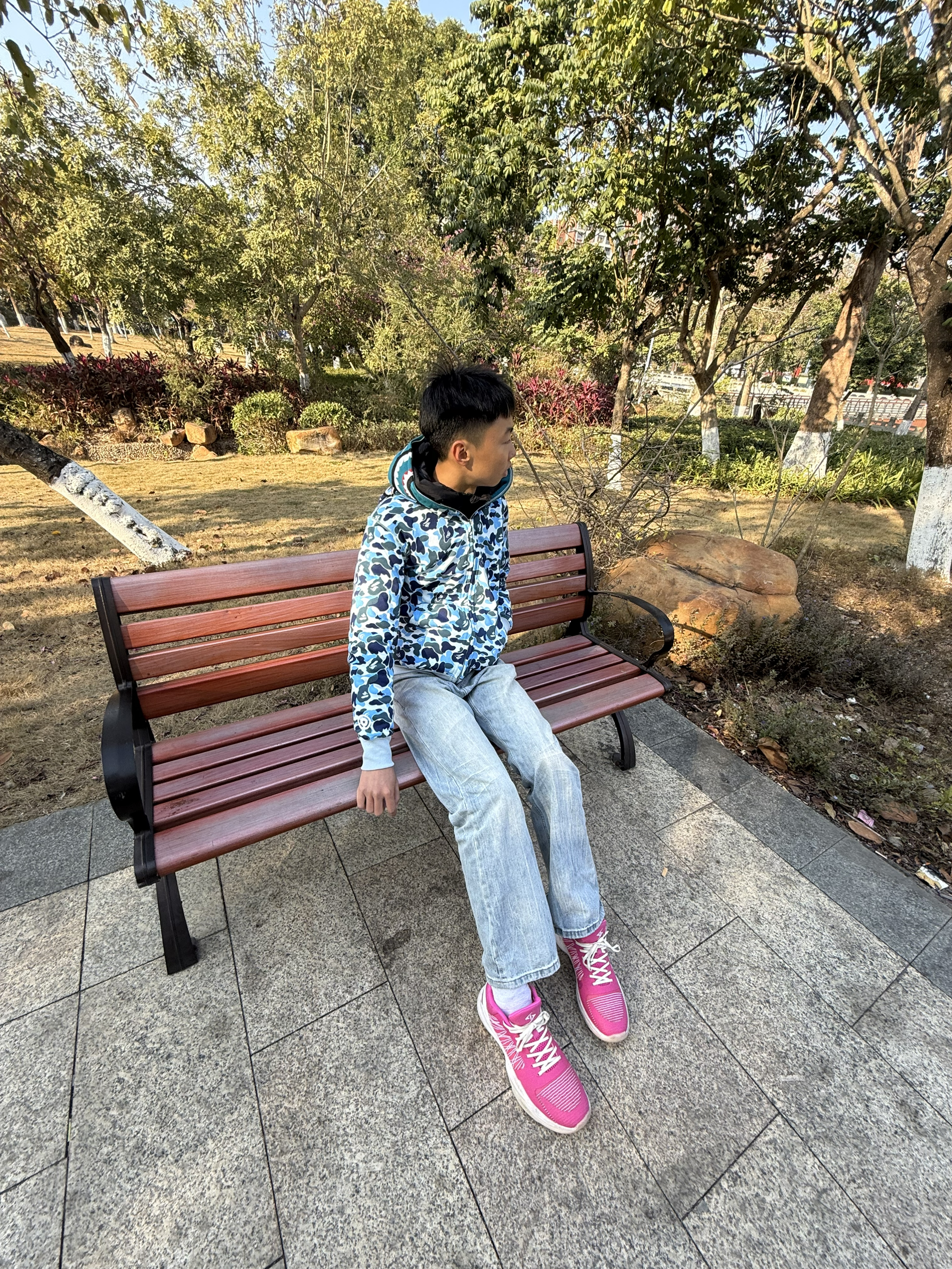 ❗️今天出门穿得简单但挺舒服❗️外套是蓝白迷彩鲨鱼连帽款,保暖不厚重,内搭了件白T。裤子是浅蓝阔腿牛仔裤,显腿直又不拘束。脚上这双粉色运动鞋是亮点,给一身冷色调加点活力。在公园走走,轻便又上镜,适合日常。