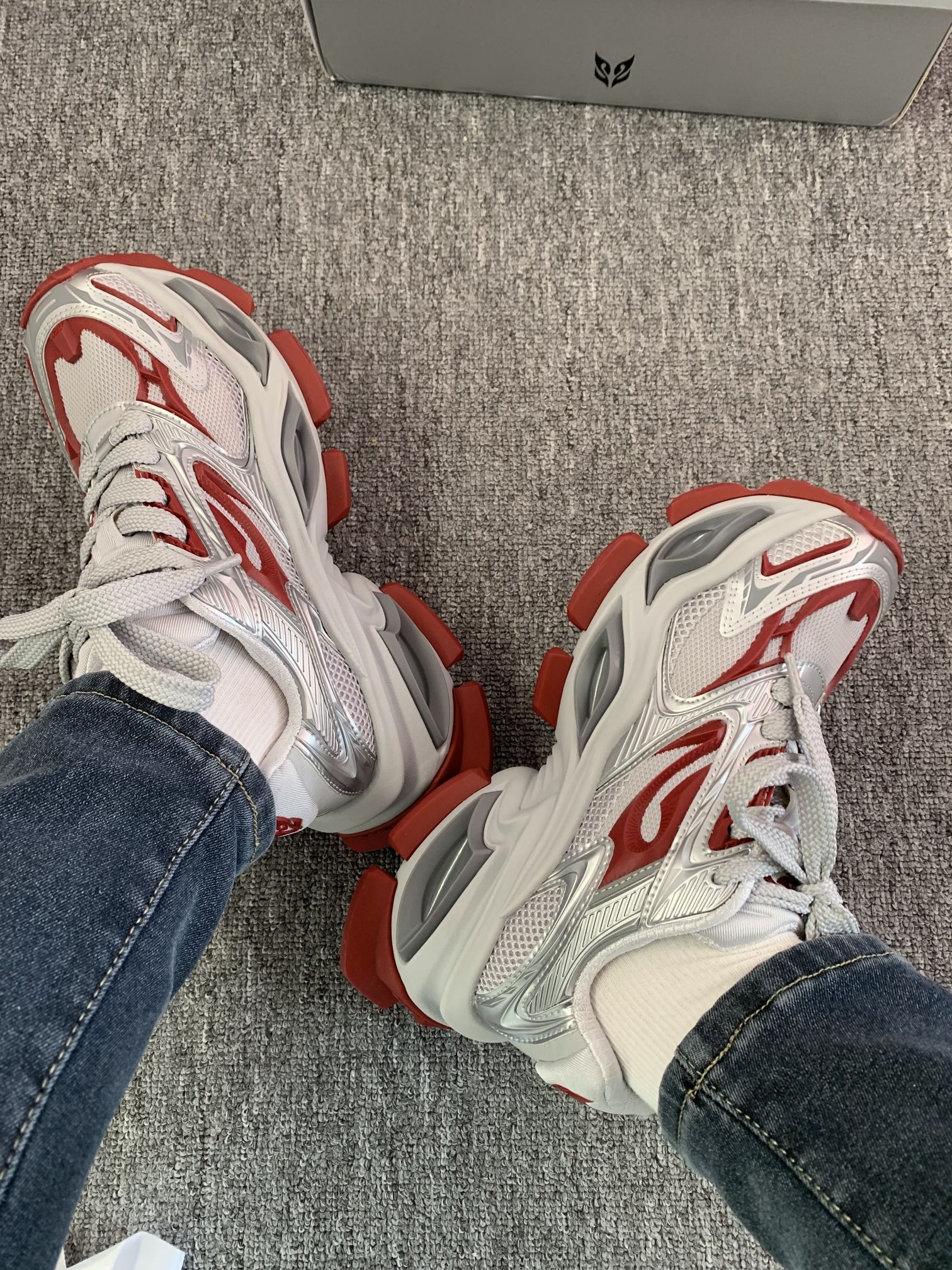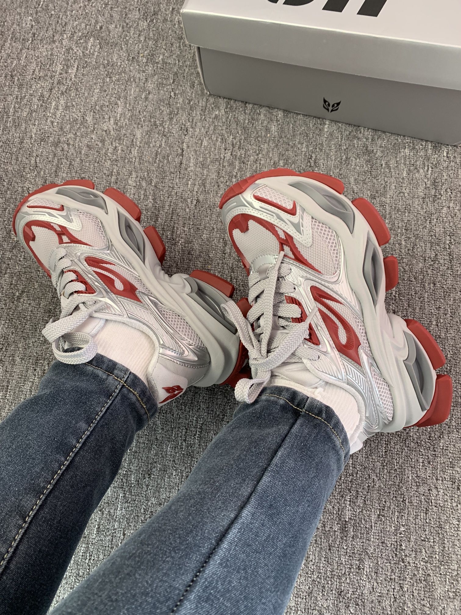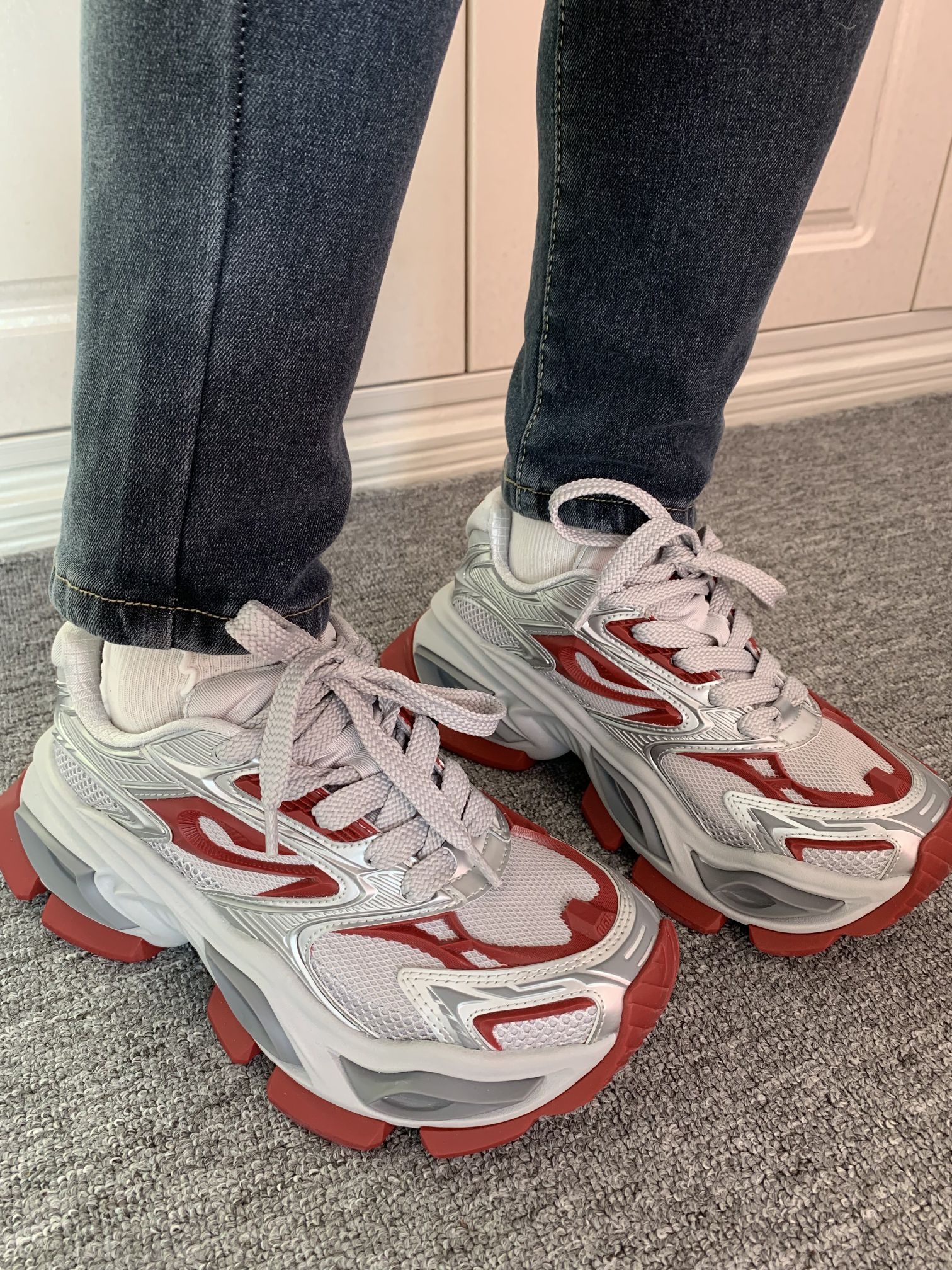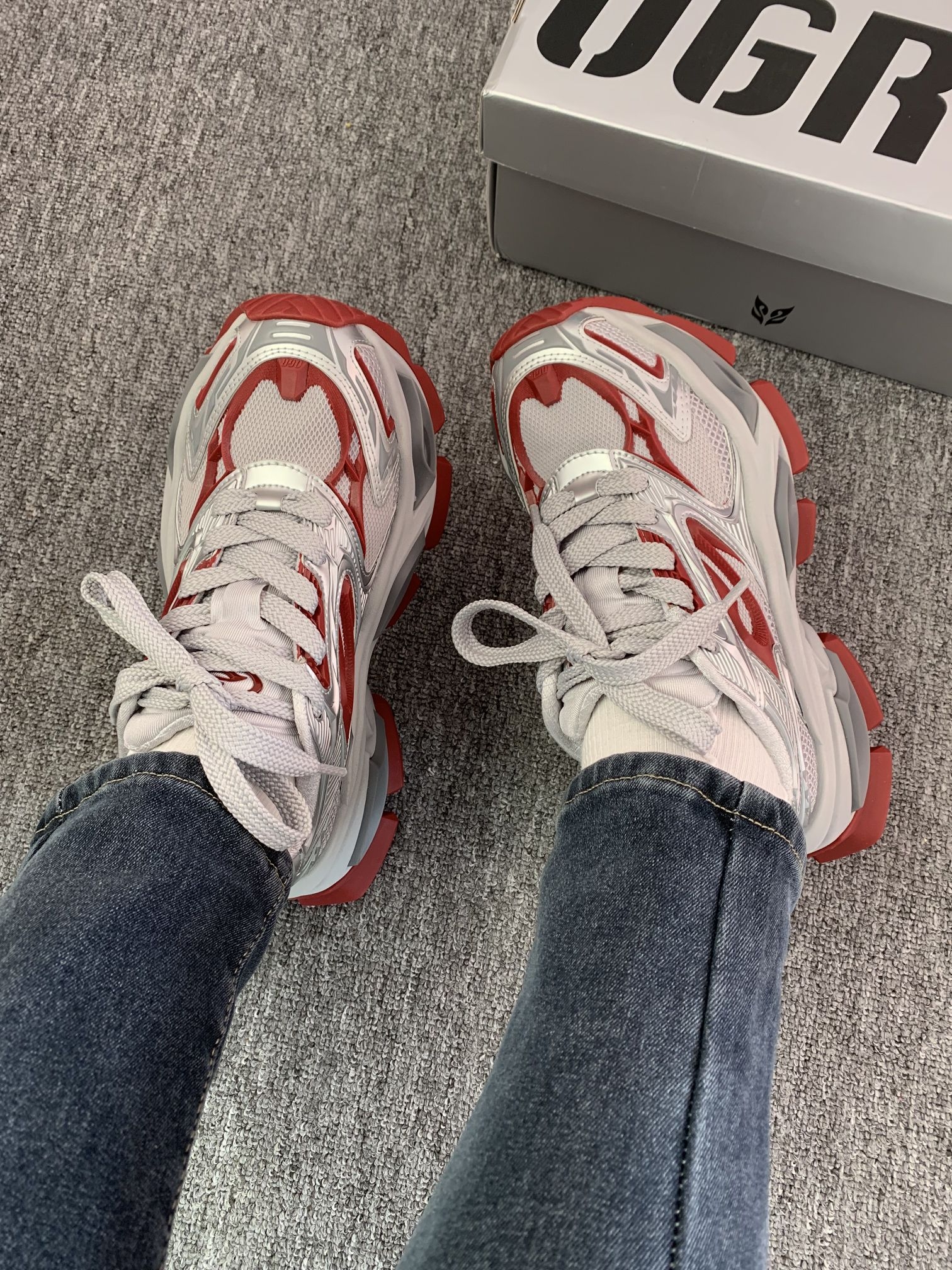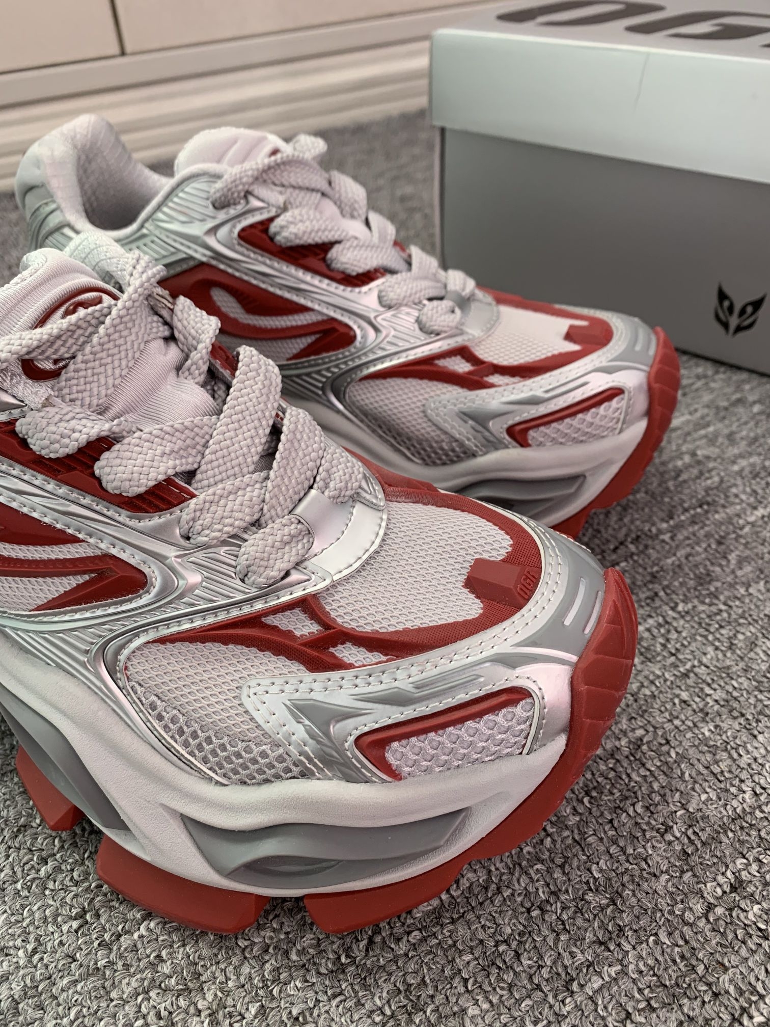 OGR他家好会设计鞋子吖 新年穿异瞳红色老爹鞋 会好运常在~我先被它的外观吸引了 而且穿着不会显着脚 狠大 上脚就一整个酷酷的 机甲风的感觉个性足足哒 我平时穿介双鞋会搭配牛仔裤 显高还显瘦呢 #ogr老爹鞋 #OGR机甲鞋 #