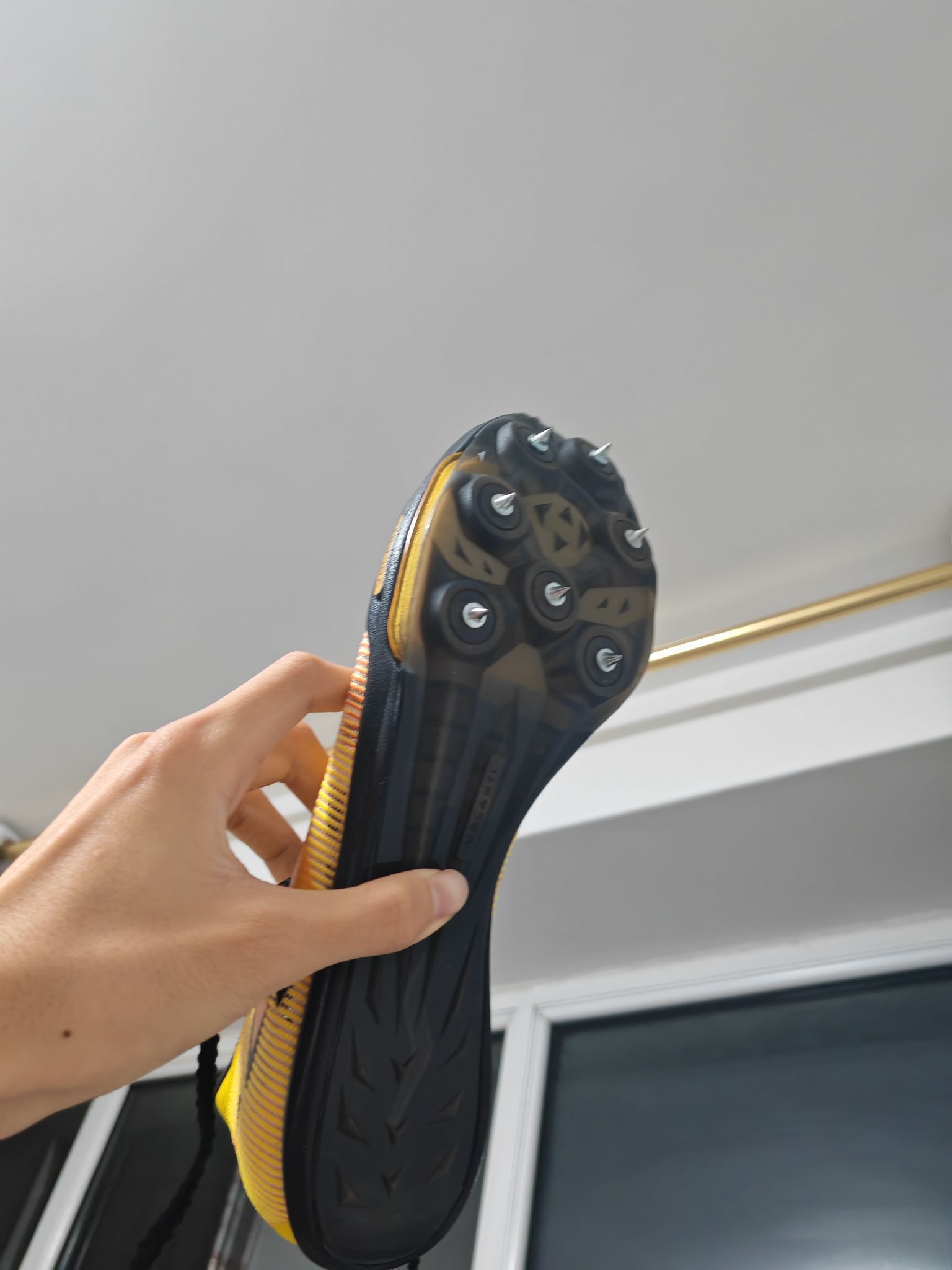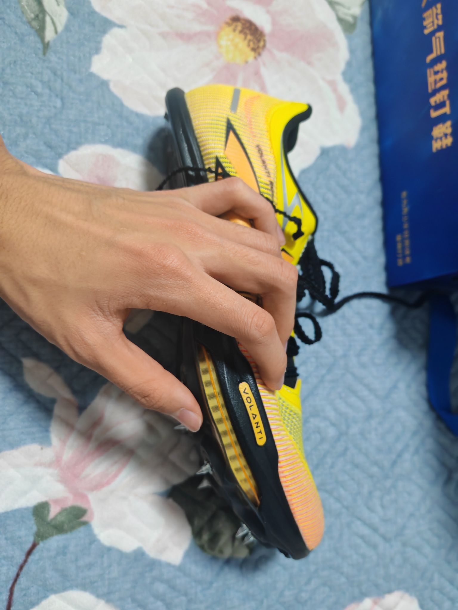 鞋子拿到手里第一感觉很轻,比911轻了将近三十克,直接能感受到的轻,鞋子很有质感,绞综鞋面强度很大,透气很棒,底板几何切割线条感很帅,很有棱角感,7钉设计,起跑爆发抓地力拉满弯道能感觉到单侧气垫压扁踩到底的感觉但是没有翻,稳定性尚可,钉距较窄,比较灵活,发力更集中,超临界泡棉属于硬韧弹,气垫气压不是特别大,不像耐克压不动,但是实际脚感和max有些接近,上脚比想象的脚感硬很多弹感明显,有点弹射起步的...