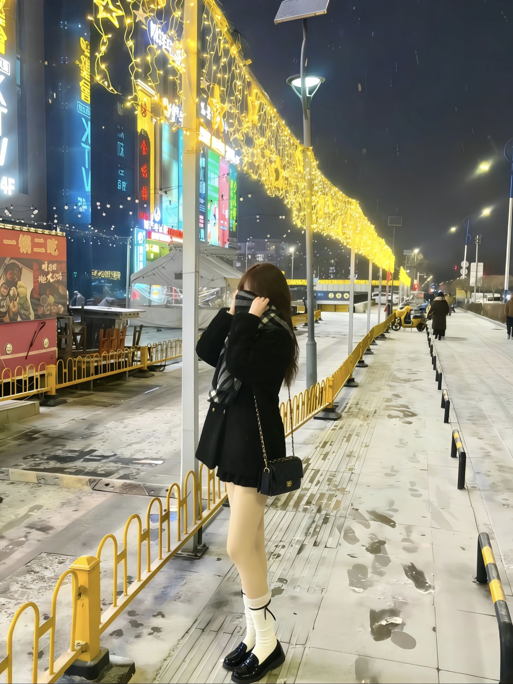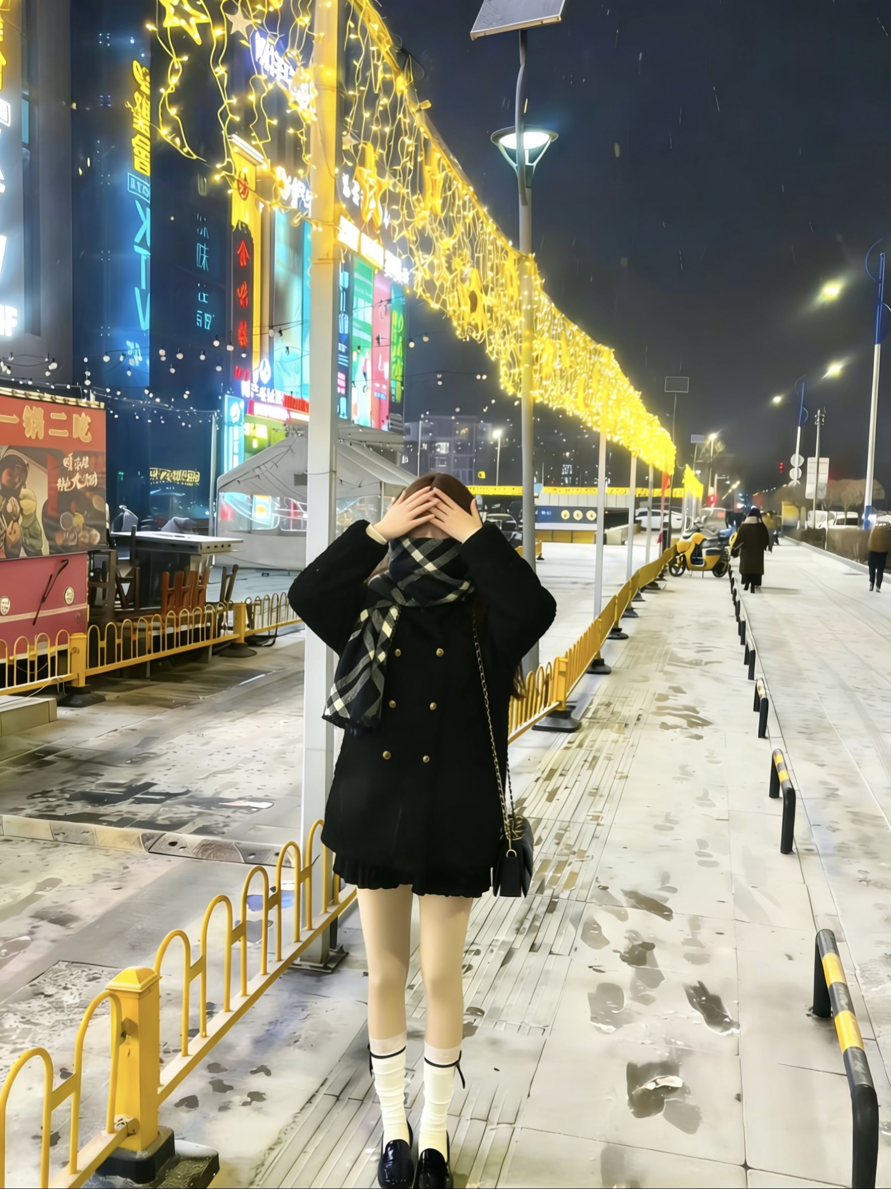 黑大衣裹着暖意,格纹围巾添了点复古感,光腿神器+白堆堆袜直接把甜妹属性焊在身上 在暖黄的灯串下,连飘雪都变得软乎乎的!