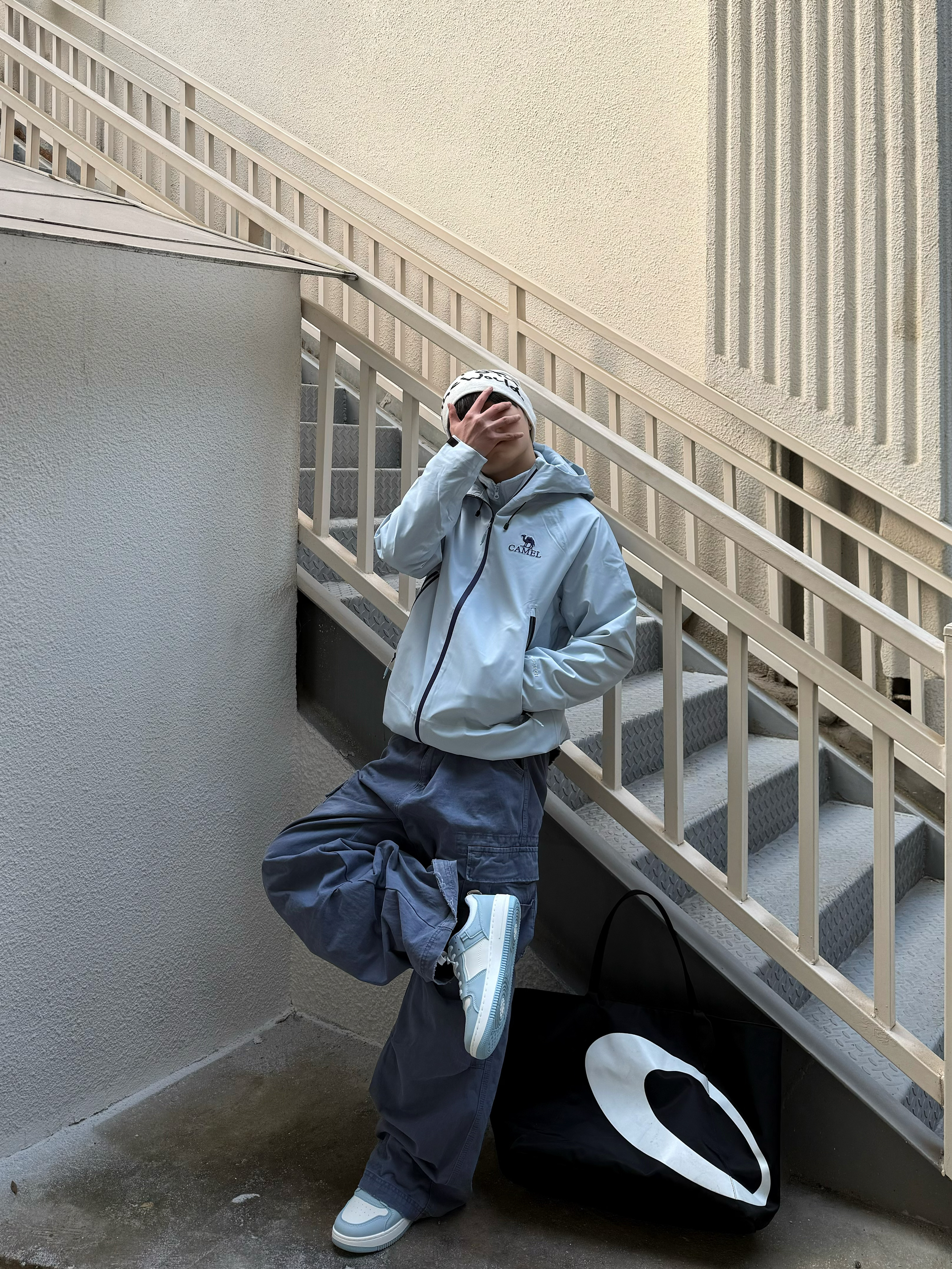 我的出现拍照姿势篇 今日分享OOTD 上身选择一件蓝色冲锋衣简约百搭舒适性强 防水面料更好的起到防水效果 简约版型穿着舒适度满满的同时有很好的起到穿搭作用 下身搭配简约百搭的法工裤 阔腿版型很好的修饰腿型 最后选了一双来自 回力1927 的蓝色空军 蓝色简约百搭,更好的与整体穿搭形成呼应!