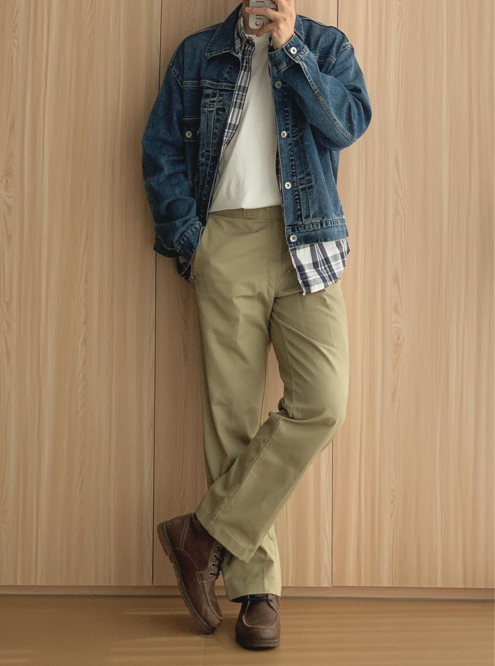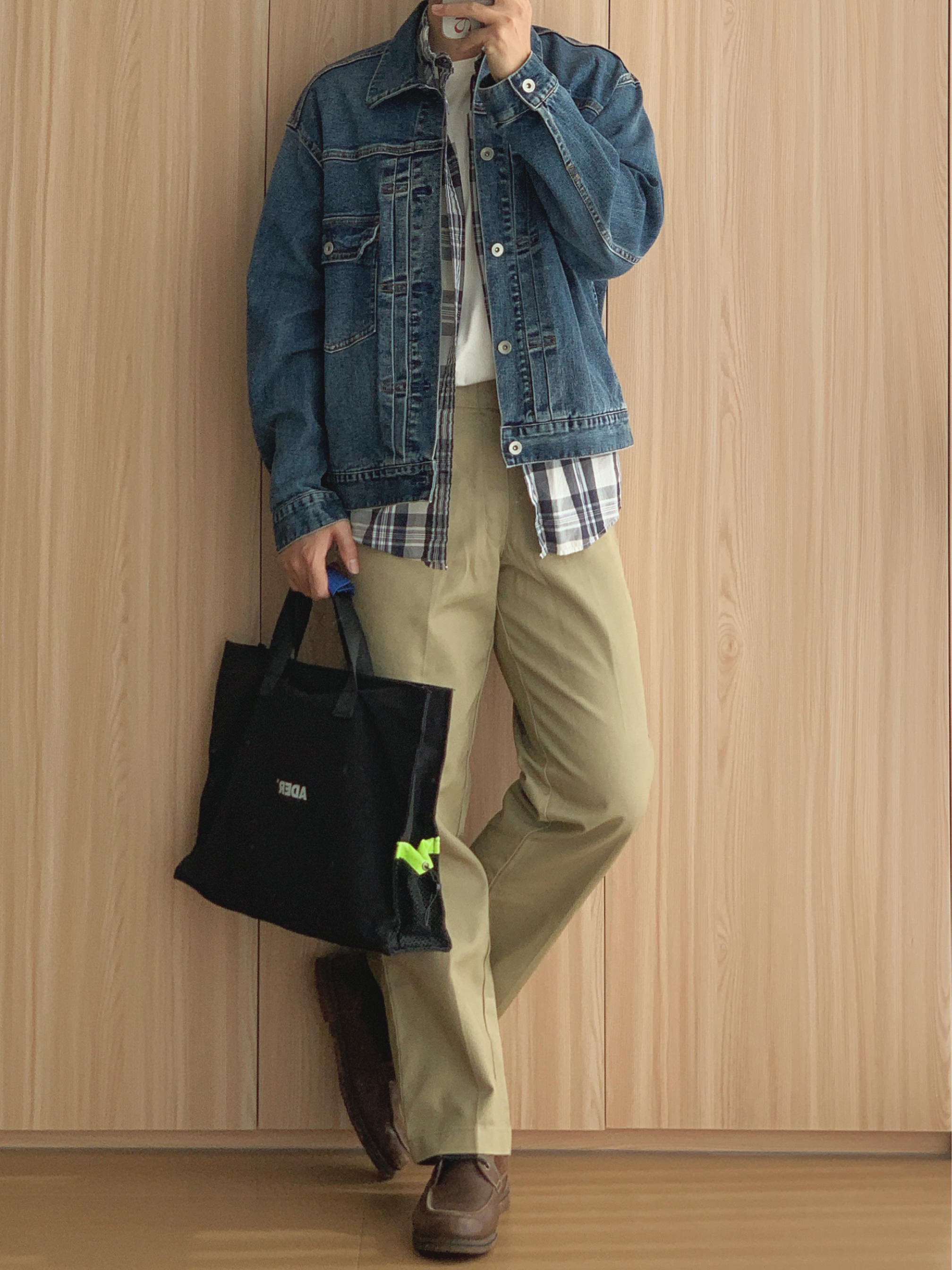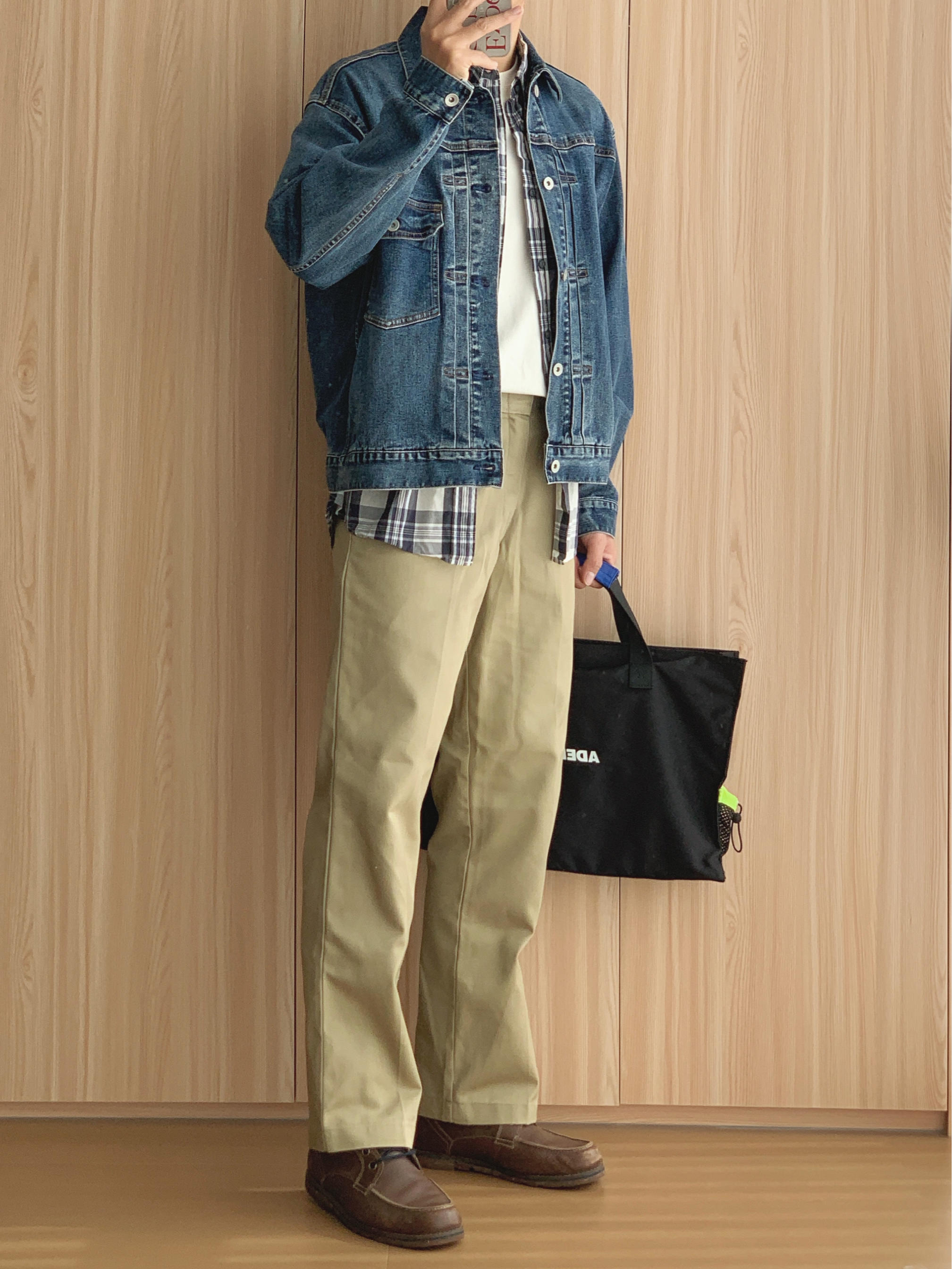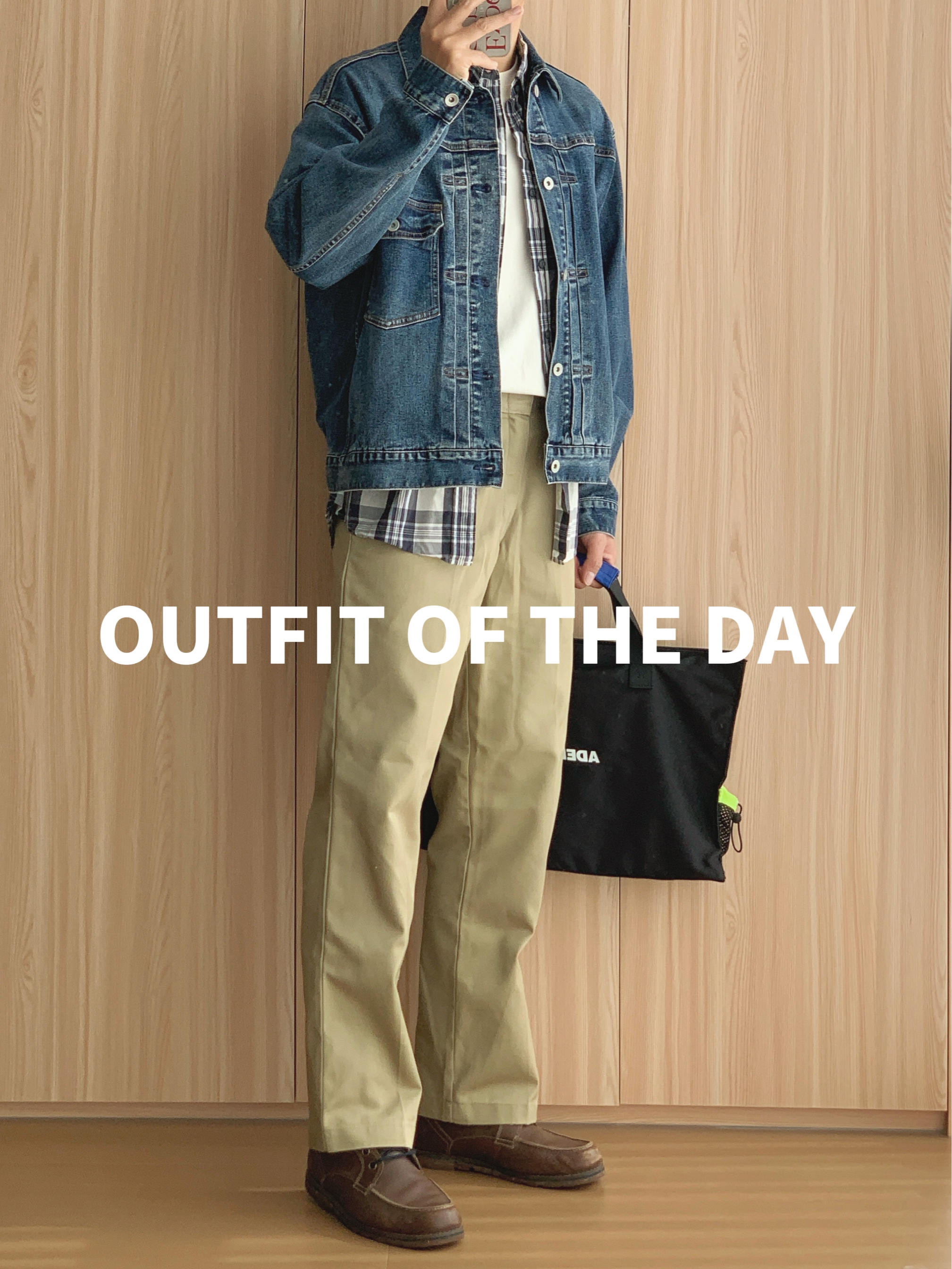 🤳🏻OOTD 👨🏻💻175cm|70kg|42码 ▪️#tommy 蓝色格纹衬衫内搭 ▪️#uniqlo 复古牛仔外套 ▪️#dickies 卡其色工装裤 ▪️#timberland 棕色马丁靴 ▪️#ader 黑色手提包 🙅🏻♂️个人观点,不喜勿喷,欢迎指点🙏🏻