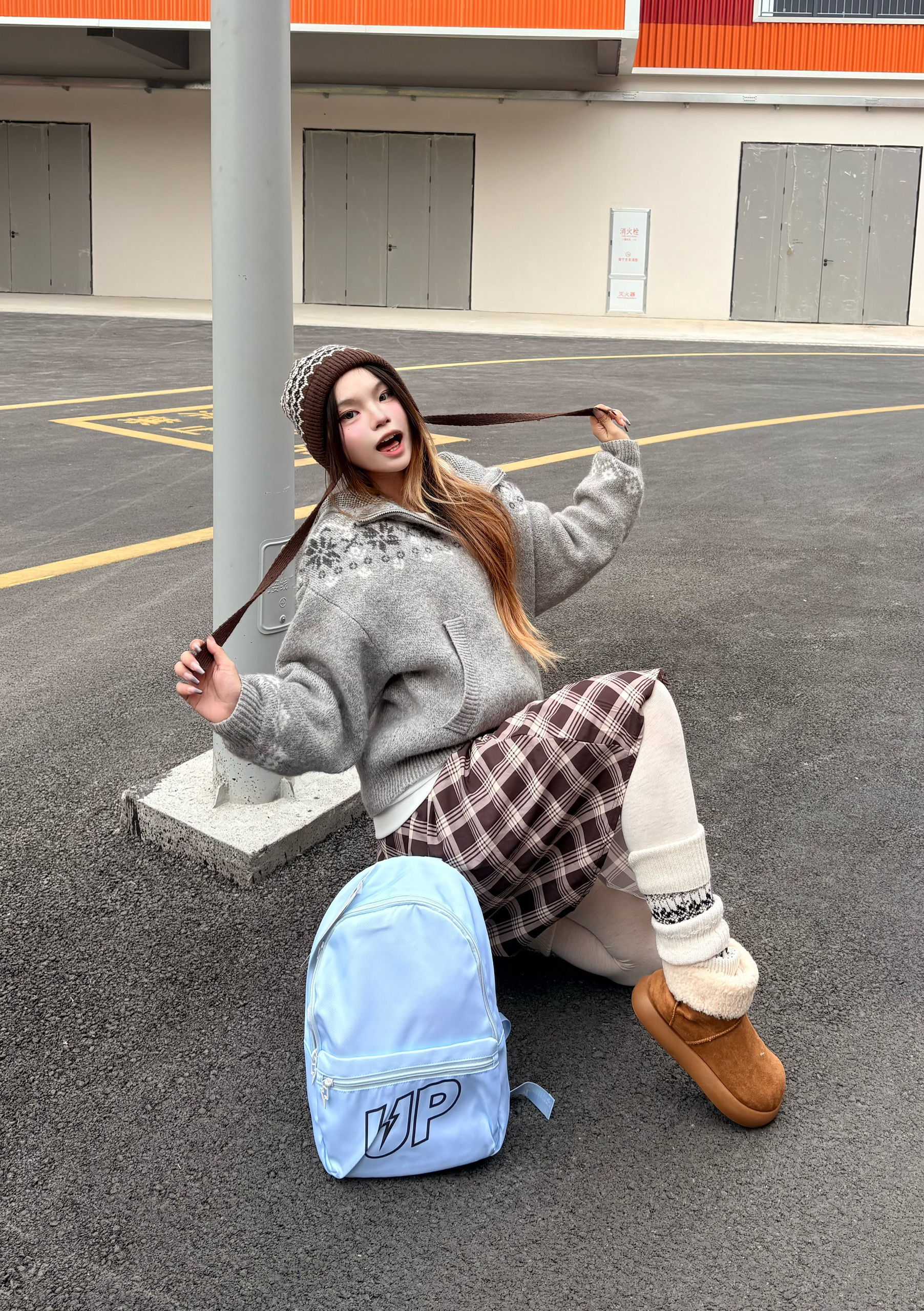 最近降温了都在穿雪地靴 ❄️本来还怕太笨重显腿短,结果搭堆堆袜+格纹裙意外和谐。 我的💡穿搭建议: 1. 上半身选宽松灰色毛衣,叠穿白色内搭露出边边,增加层次感🩶 2. 下半身搭配格纹半裙+堆堆袜,把靴筒堆在袜口外面,视觉上更显腿细✨ 3. 背个浅蓝书包,整体色调柔和又减龄,韩系松弛感直接拿捏🩵