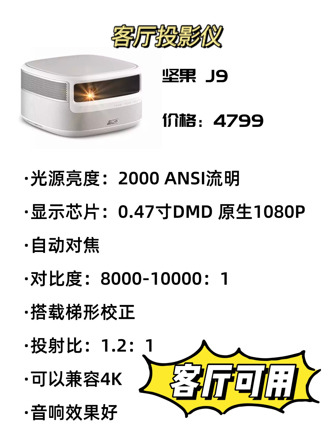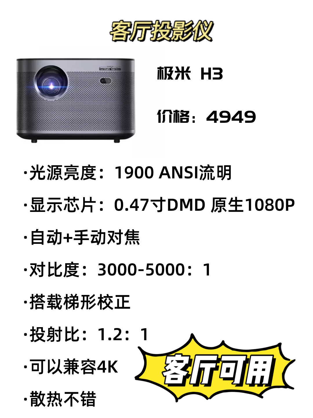1900ANSI流明得光源亮度,0.47寸显示芯片,出色的散热系统,哈曼卡顿音响,效果很棒。在客厅用也可以,白天的时候半拉一点窗帘就可以了。各方面都很完美,唯一的缺点就是对比度不高,只有3000-5000:1的对比度,还比不上腾讯极光。