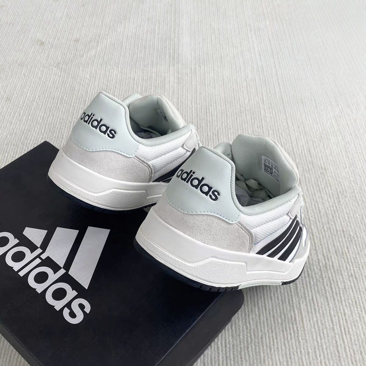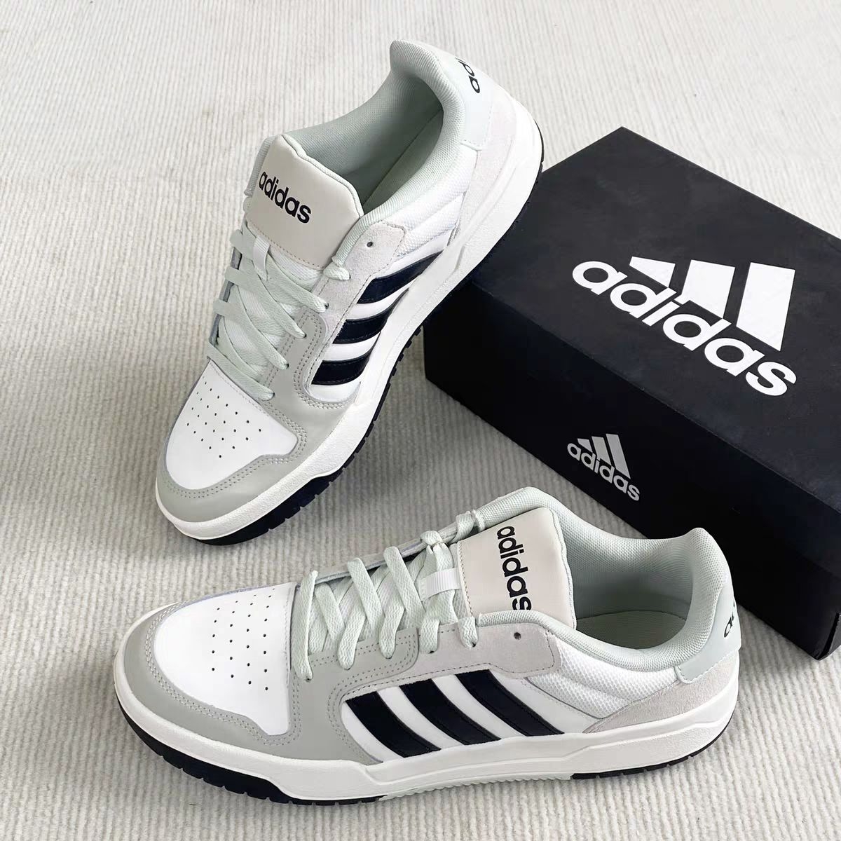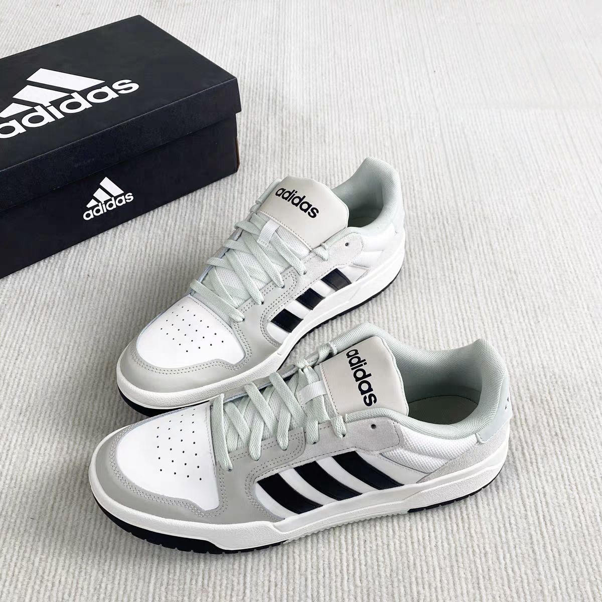 刚在识货刷到这双Adidas Courtbeat,看价格300+直接冲了!开箱瞬间惊了——奶白+浅灰拼接鞋面,经典三条黑杠贯穿鞋身,鞋舌“adidas”标用磨砂皮拼接,低调中透着贵气,完全不像百元价位的鞋!