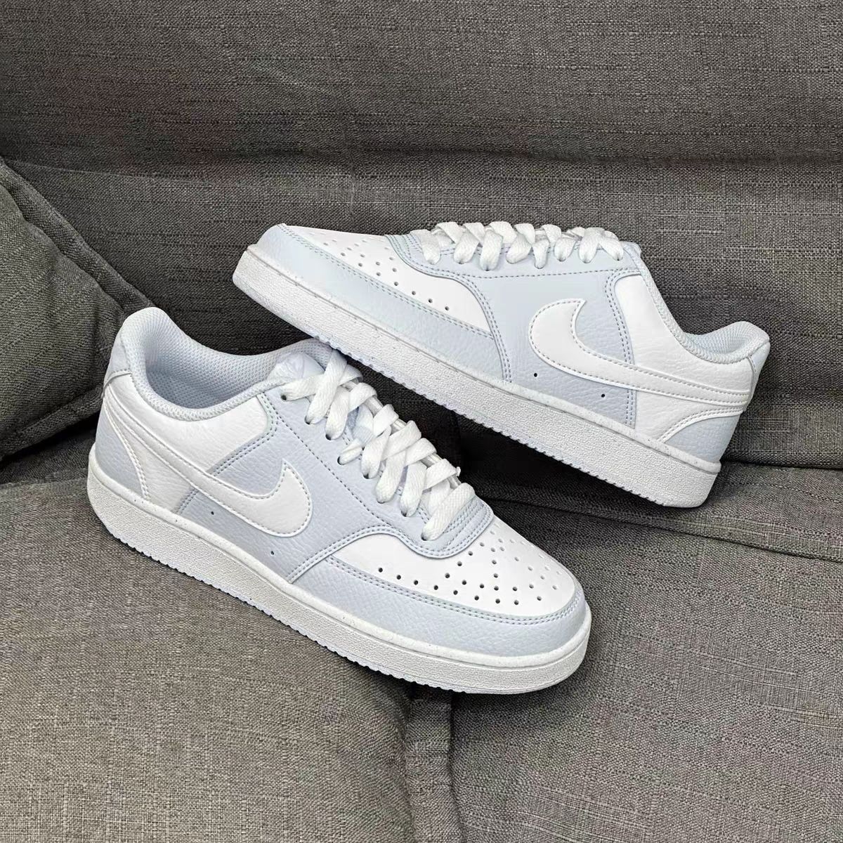 经典永不过时!浅灰鞋面配牛仔裤,把裤脚卷到脚踝,露出鞋子的黑杠和白色中底,清爽干净,辅导员见了都夸“这学生真精神”。