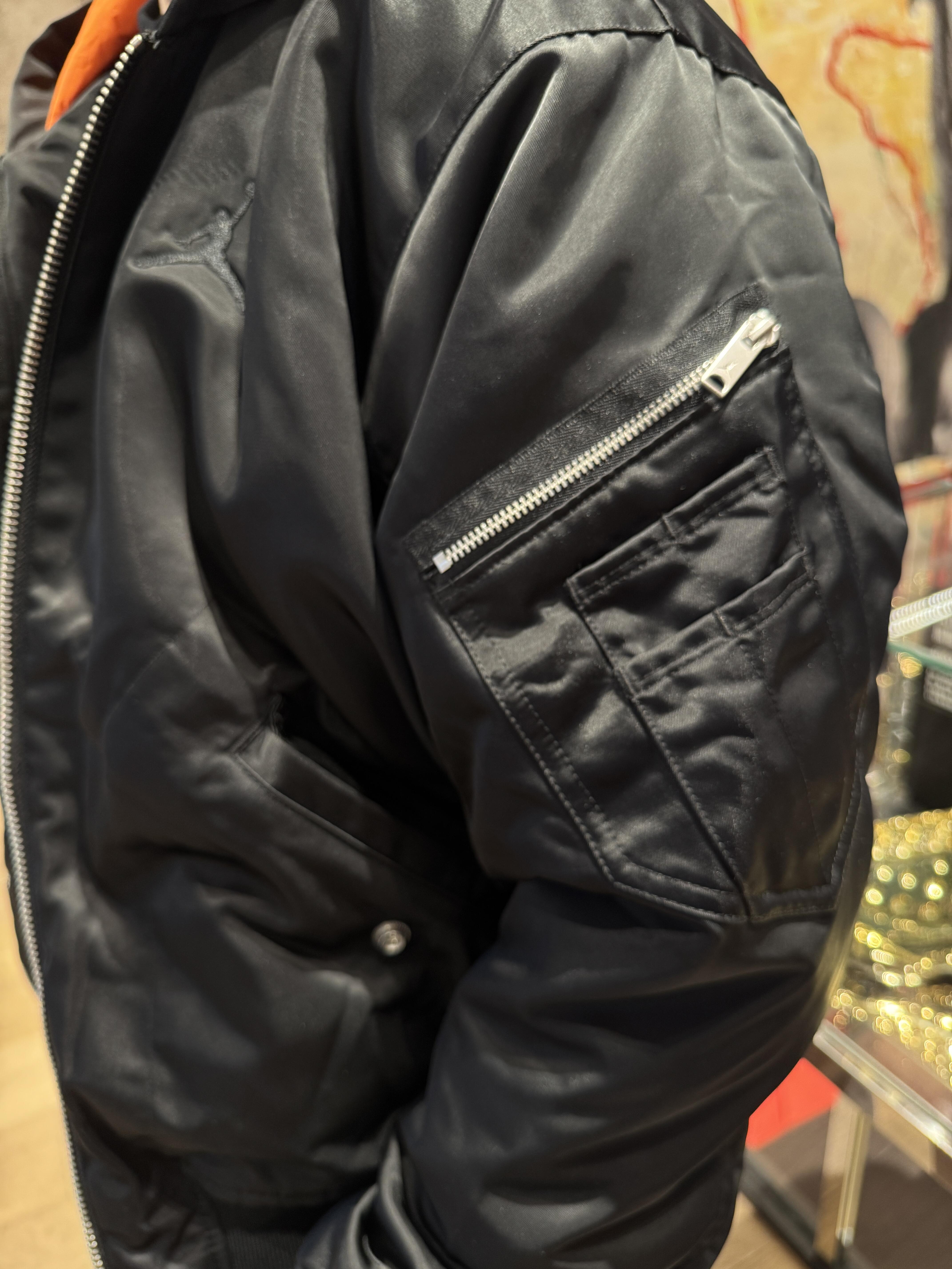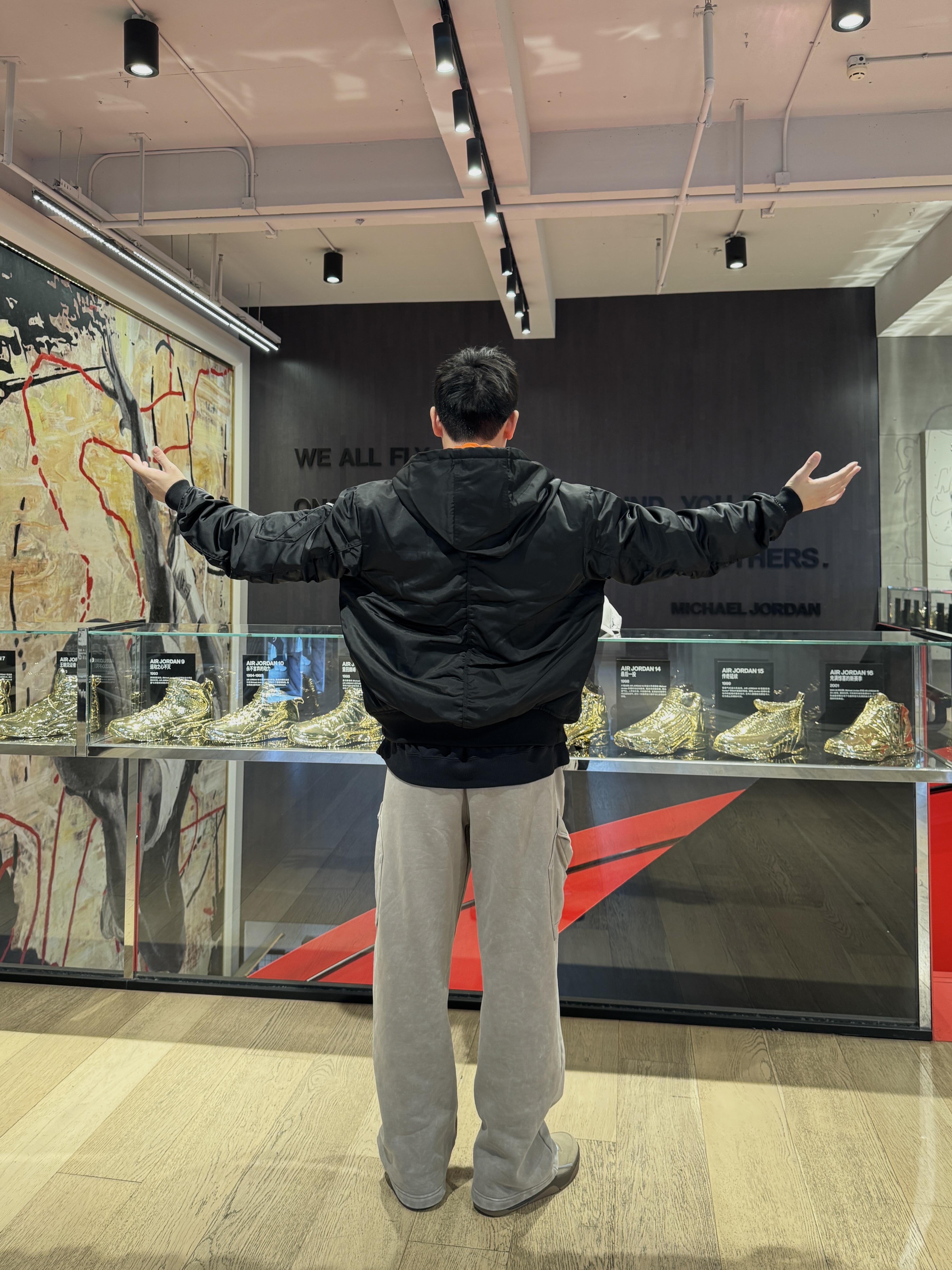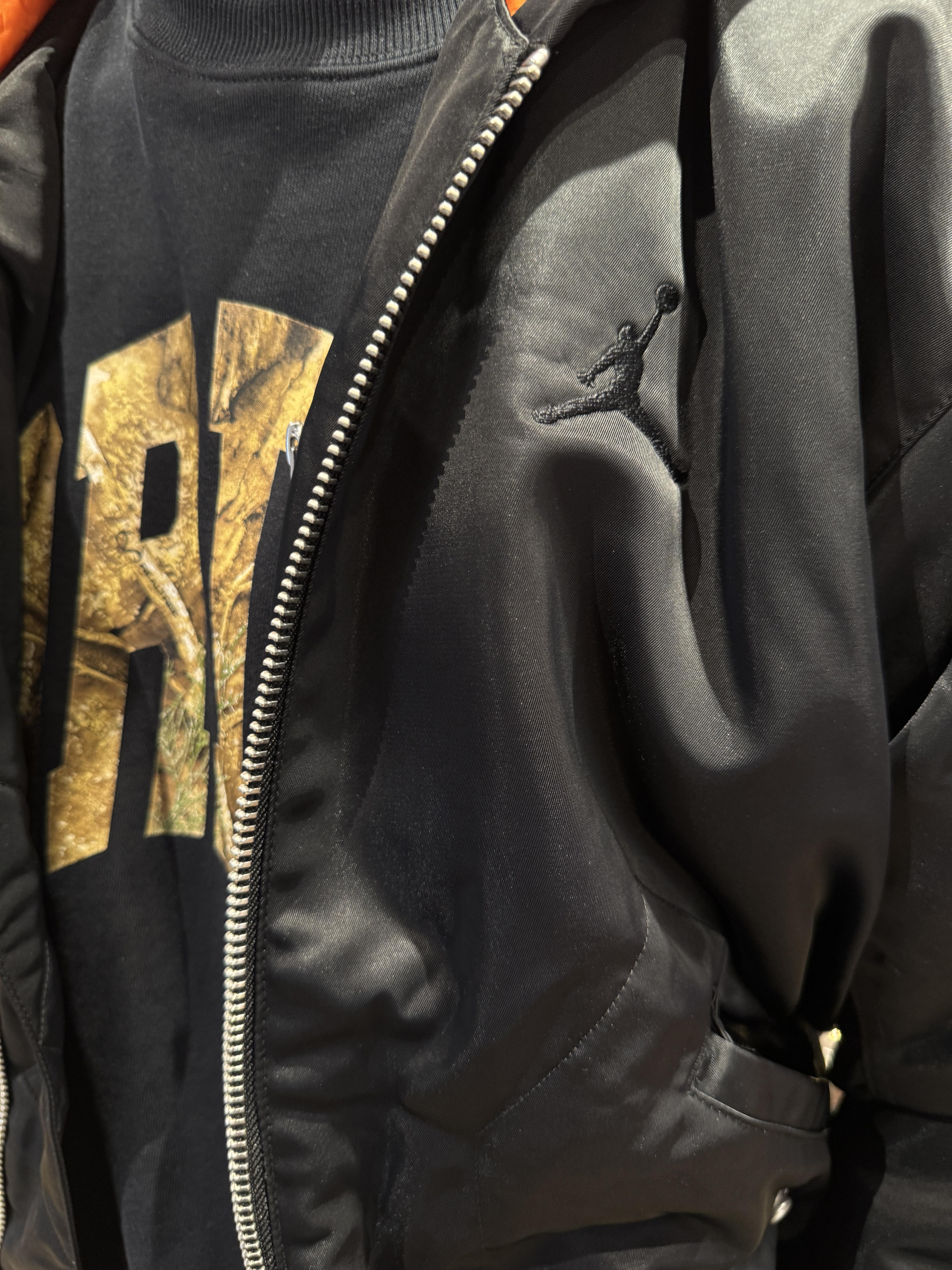 今天这套把“撞色”和“层次”玩明白了 • 黑色AJ飞行员夹克质感拉满,帽子橙色内衬像一抹阳光 • 袖子上的多口袋设计是细节控的爱 • 卡其工装裤配福来鞋,蓝色鞋带的点缀,松弛又不失细节 • 黑金印花内搭和AJ的飞人Logo呼应