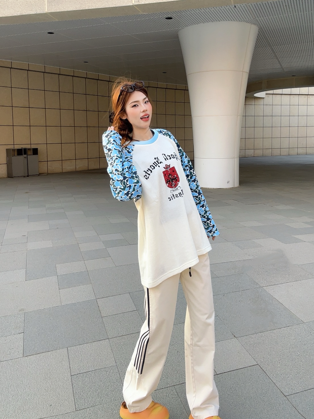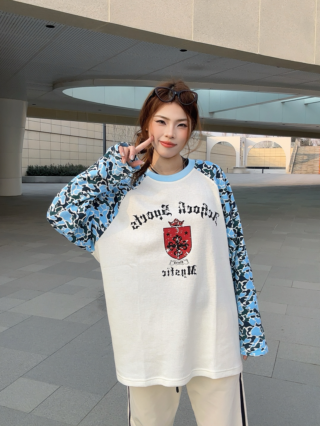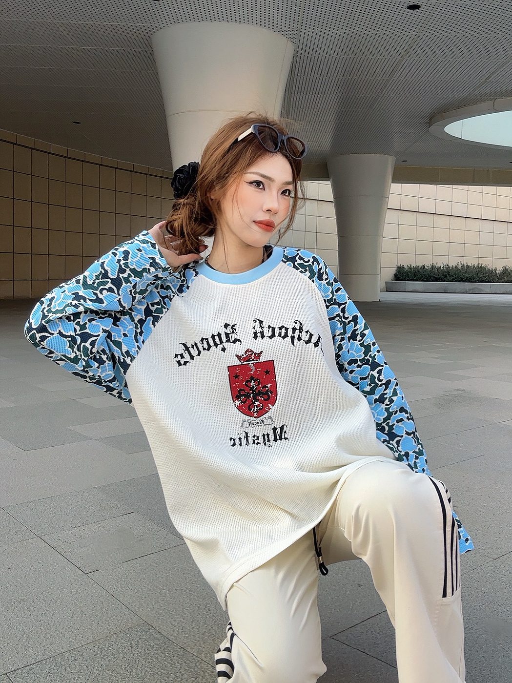 今天穿的这件A chock美式复古拼接上衣,真的是我的近期心头爱!蓝白迷彩撞色袖子超吸睛,胸口的复古徽章印花又带点学院感,华夫格面料软fufu的还很透气🥳~ 搭配同色系垂感长裤,再踩一双亮色面包鞋,松弛街头感直接拉满✨ 日常出街、和朋友逛展都很合适,宽松版型对各种身材都很友好,慵懒又不失个性!