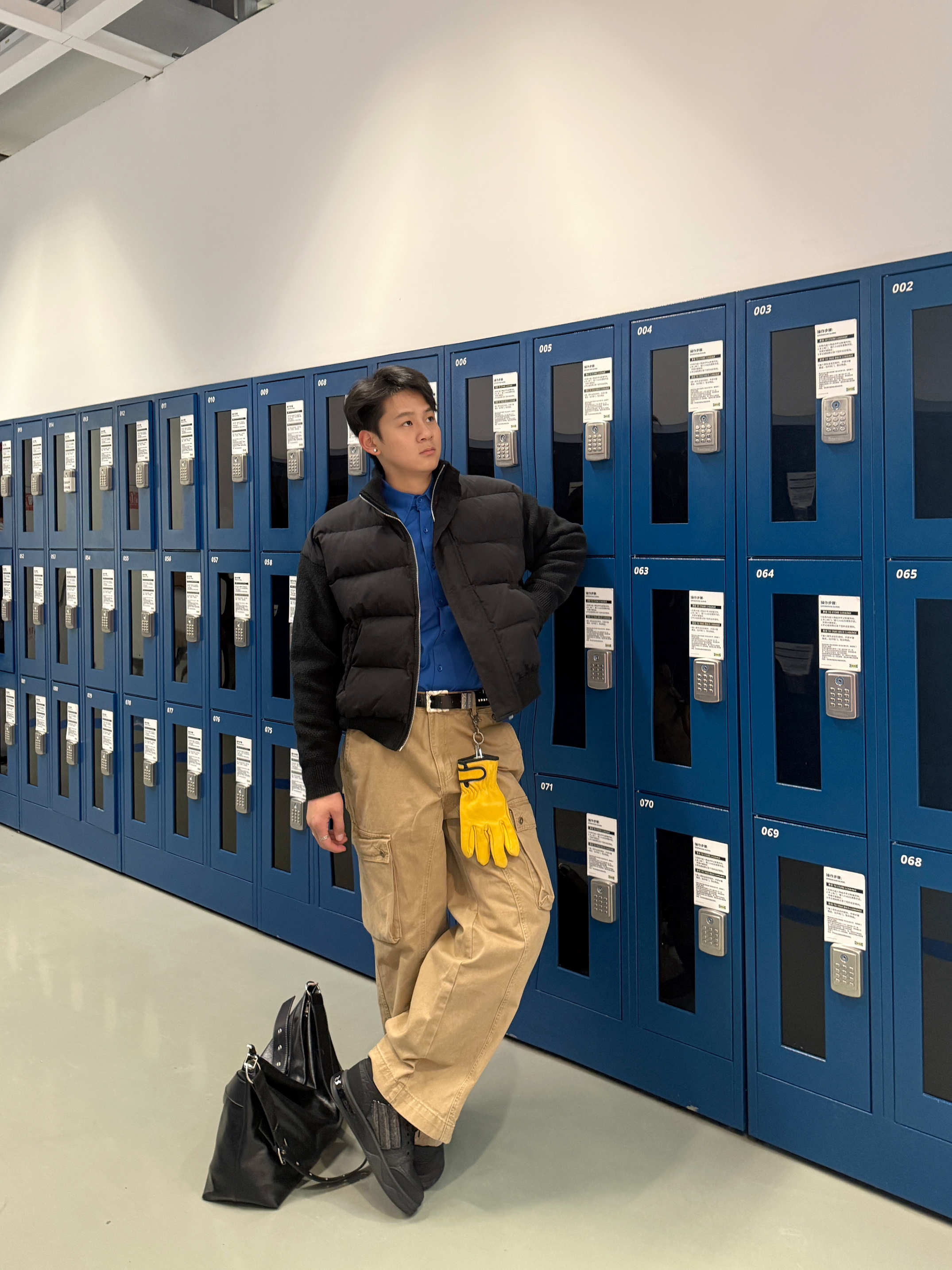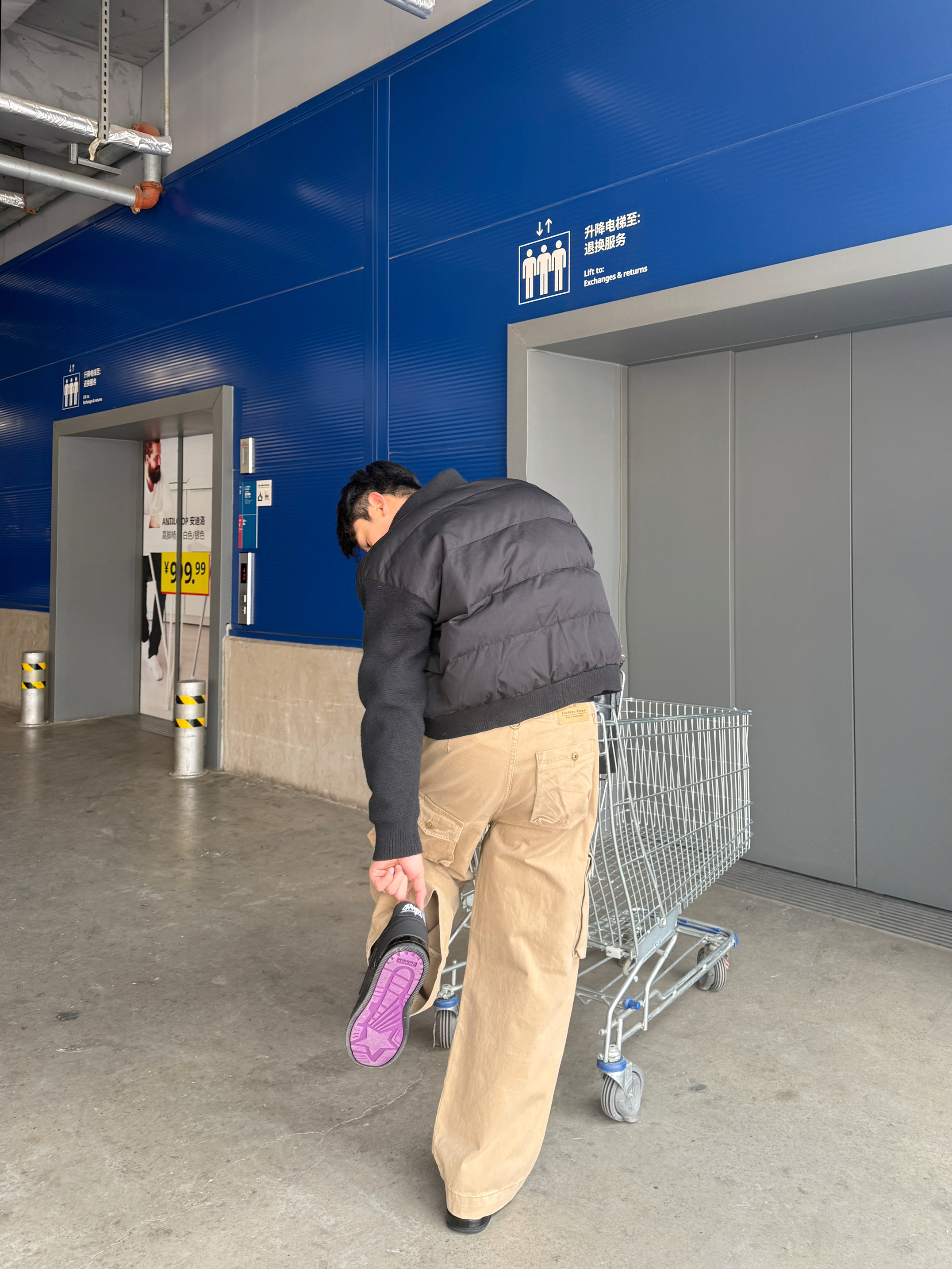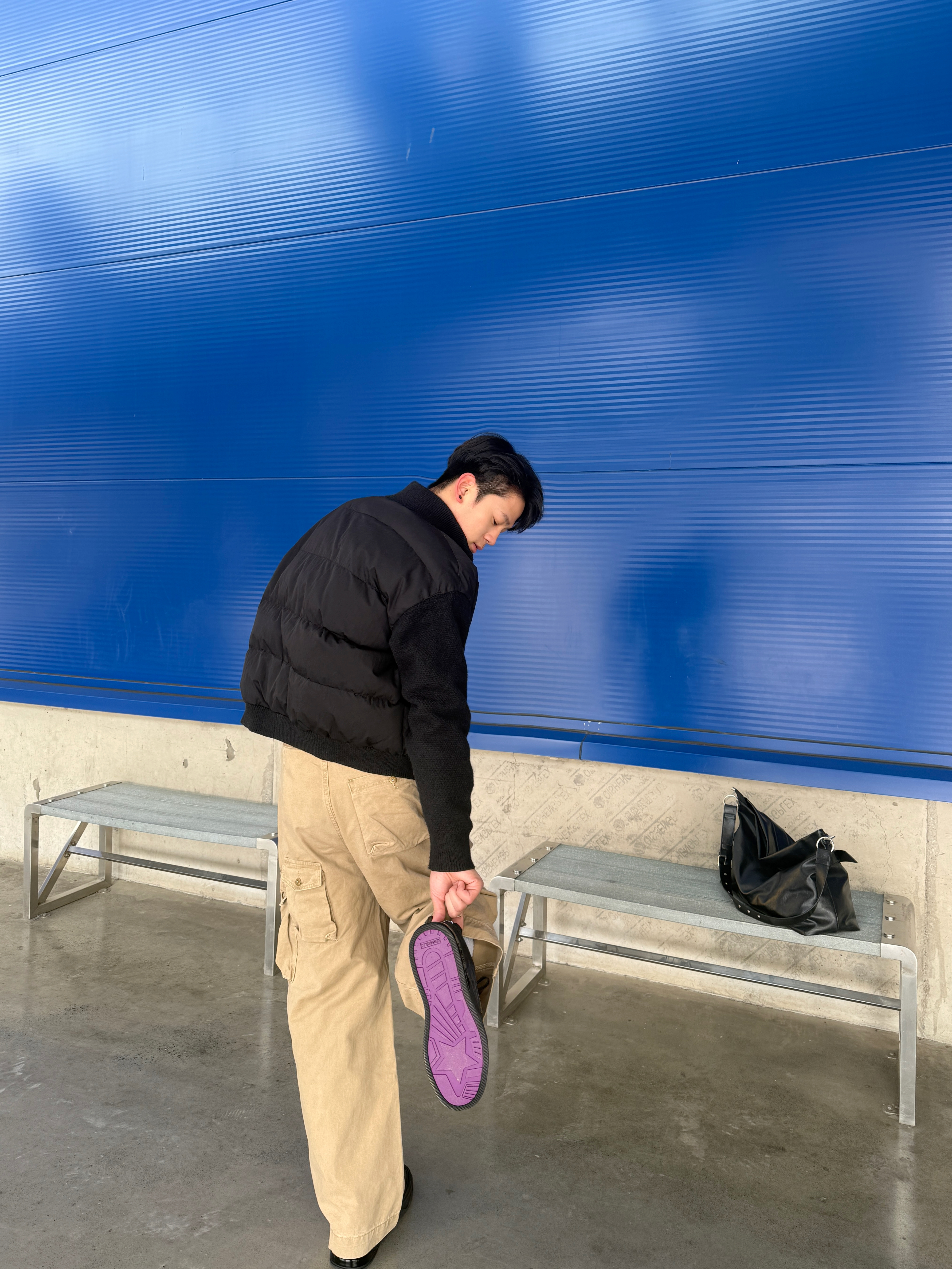 上衣我选择一件短款拼接羽绒服 保暖的同时风度也在线 内搭选择一件蓝色衬衫,这样有层次感~ 裤子来一条卡其色工装裤,色彩鲜明才出片 鞋子和上衣呼应,中帮还有设计感 鞋底的紫色图案我是真喜欢 穿起来感受挺不错的,宿舍而且也不重 这样一身下来包出片的!