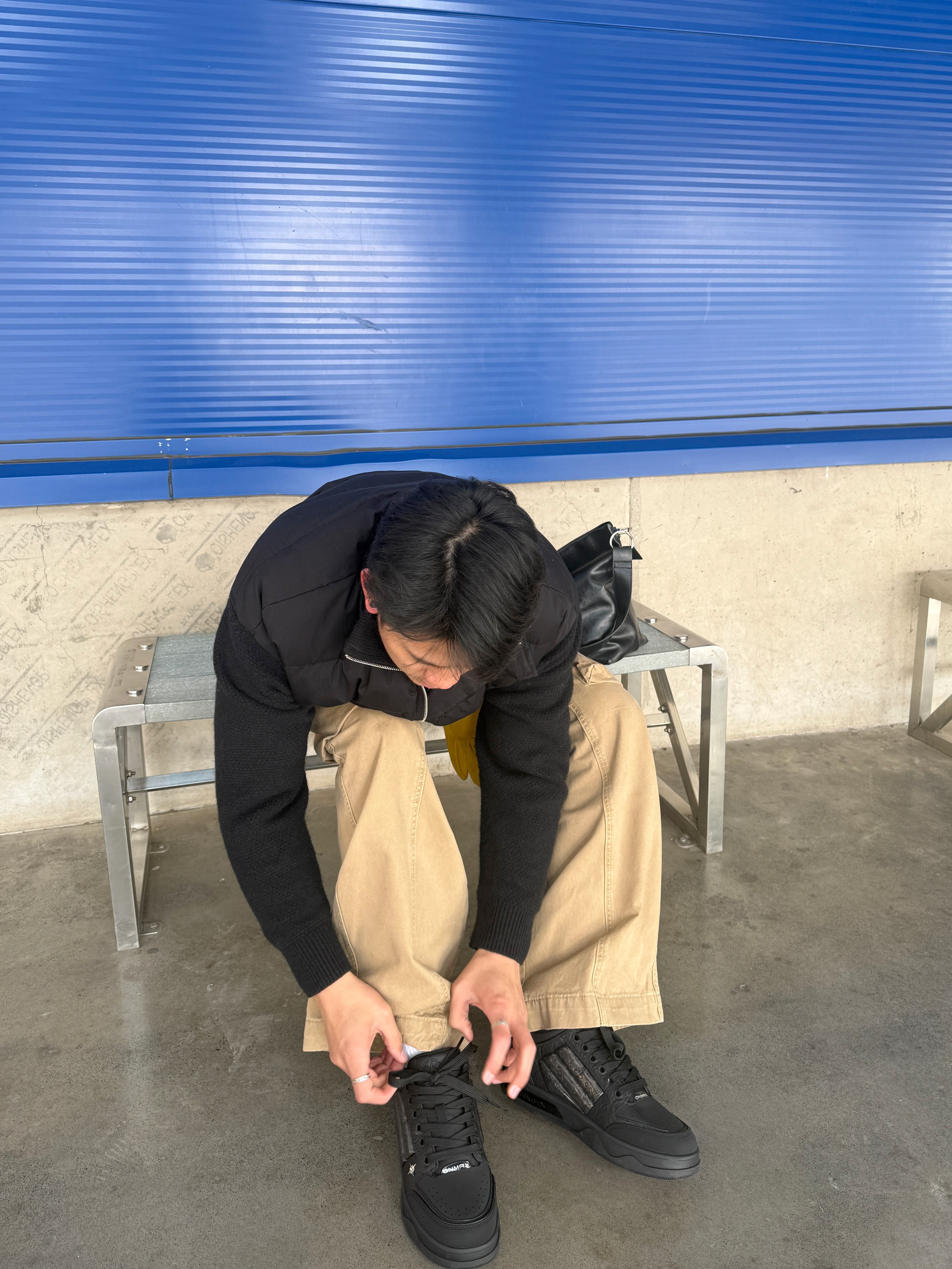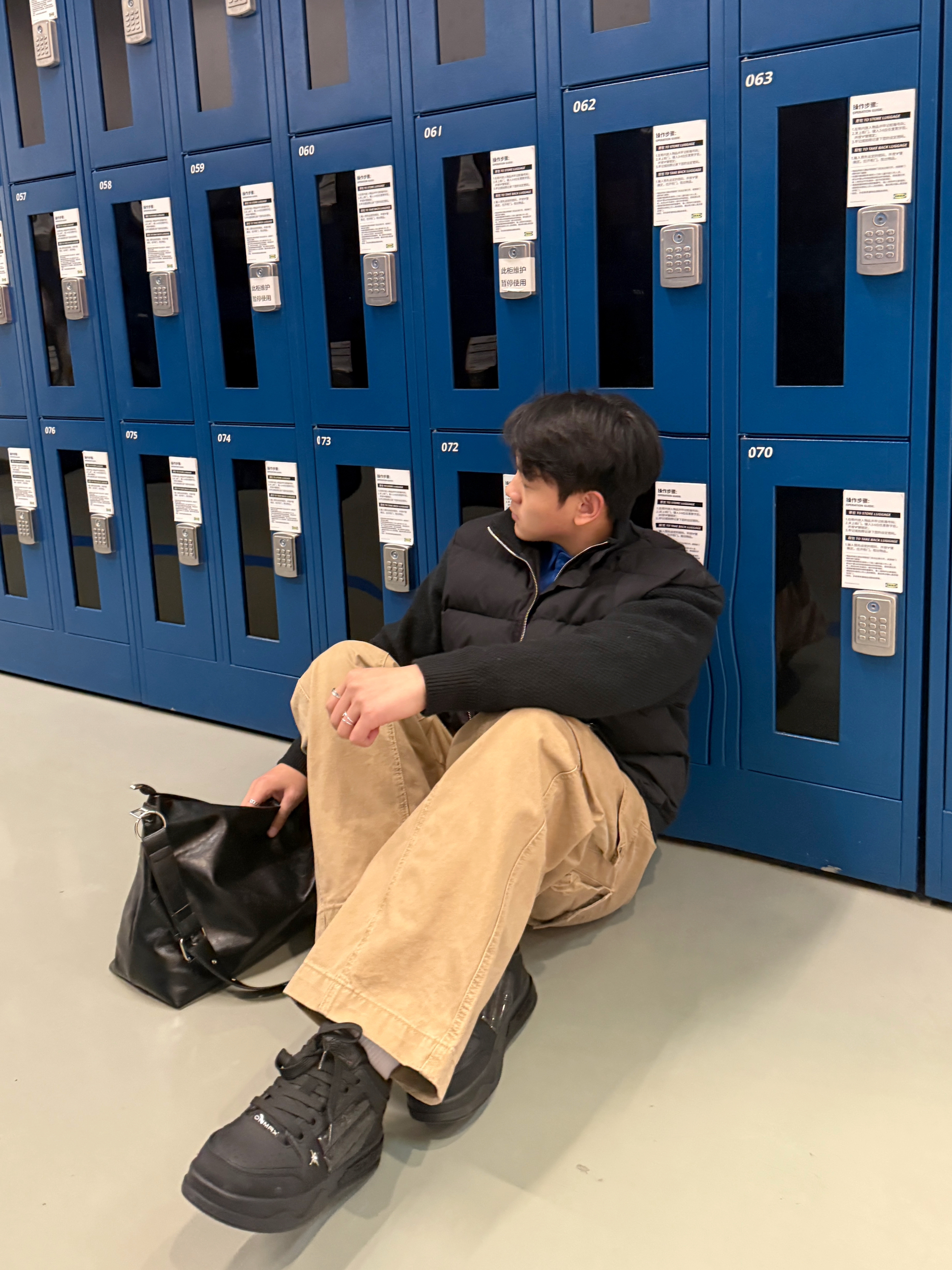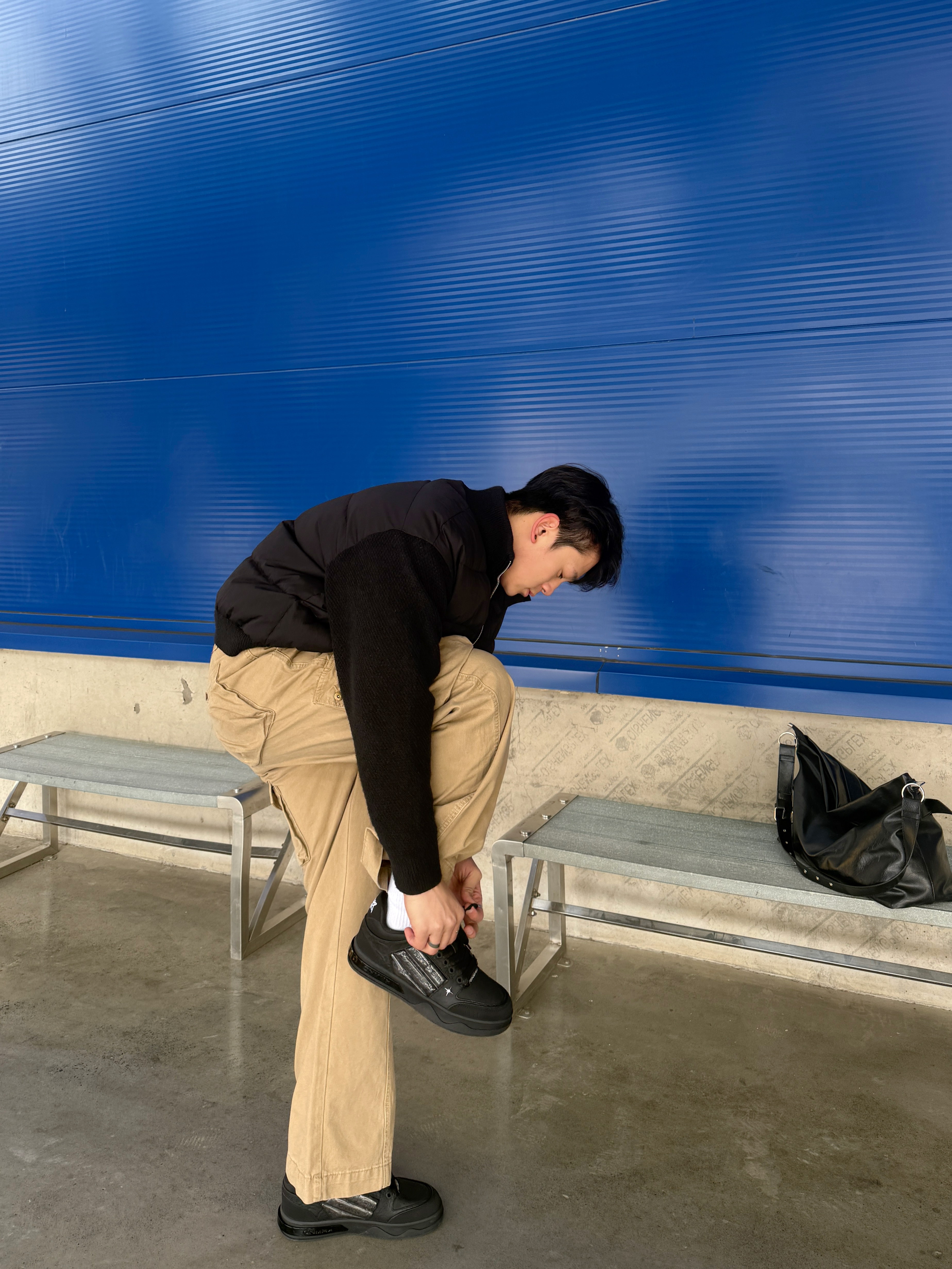上衣我选择一件短款拼接羽绒服 保暖的同时风度也在线 内搭选择一件蓝色衬衫,这样有层次感~ 裤子来一条卡其色工装裤,色彩鲜明才出片 鞋子和上衣呼应,中帮还有设计感 鞋底的紫色图案我是真喜欢 穿起来感受挺不错的,宿舍而且也不重 这样一身下来包出片的!