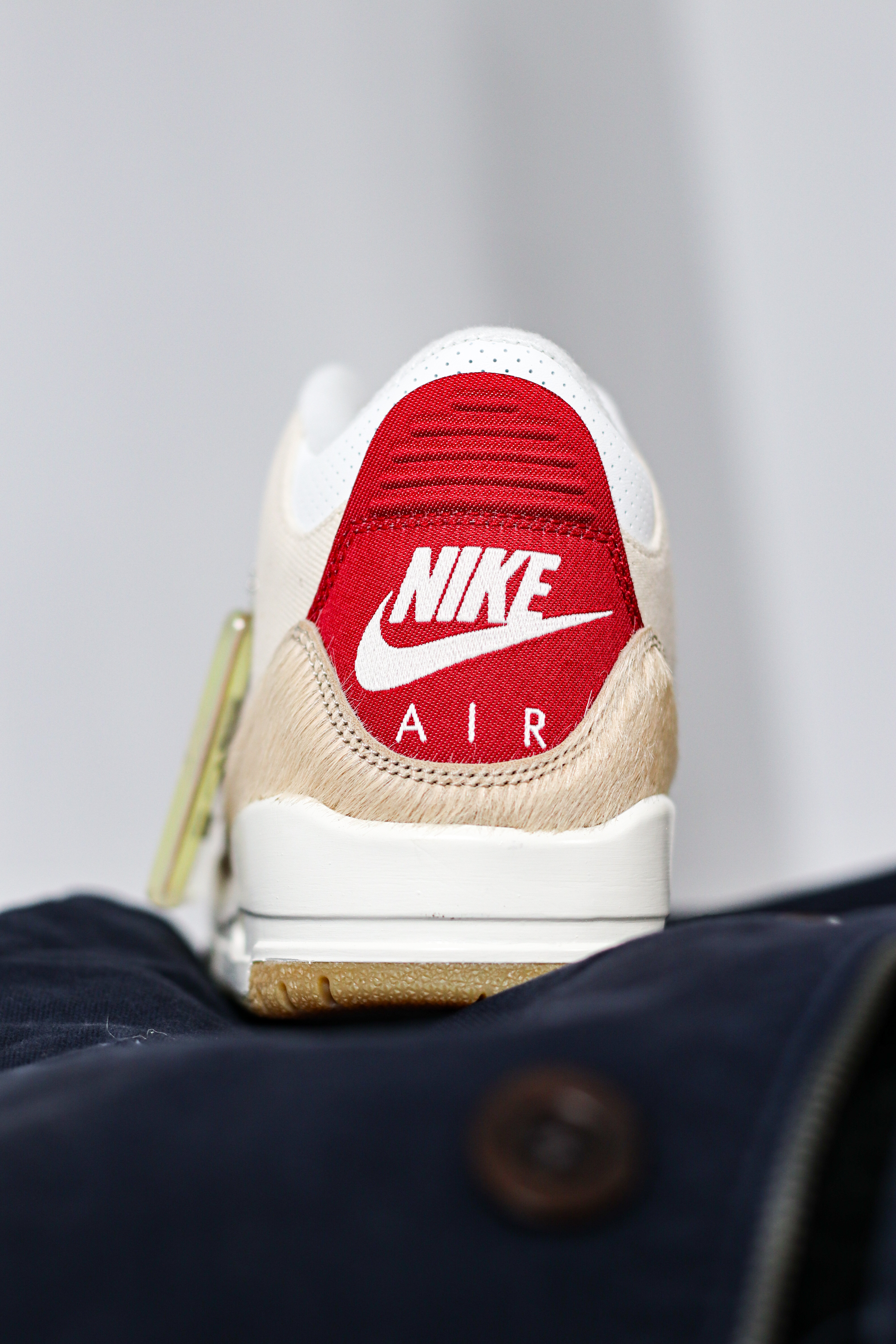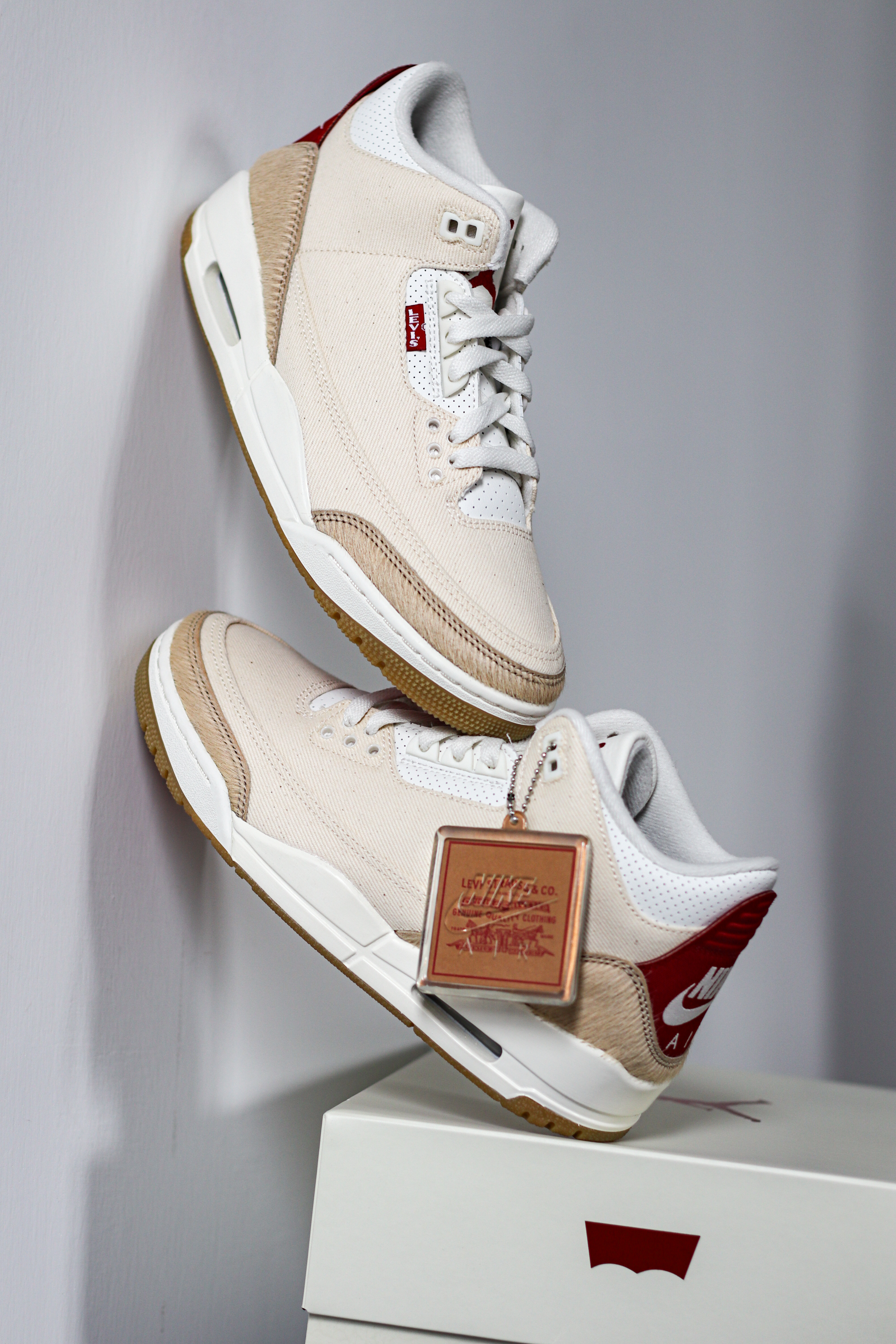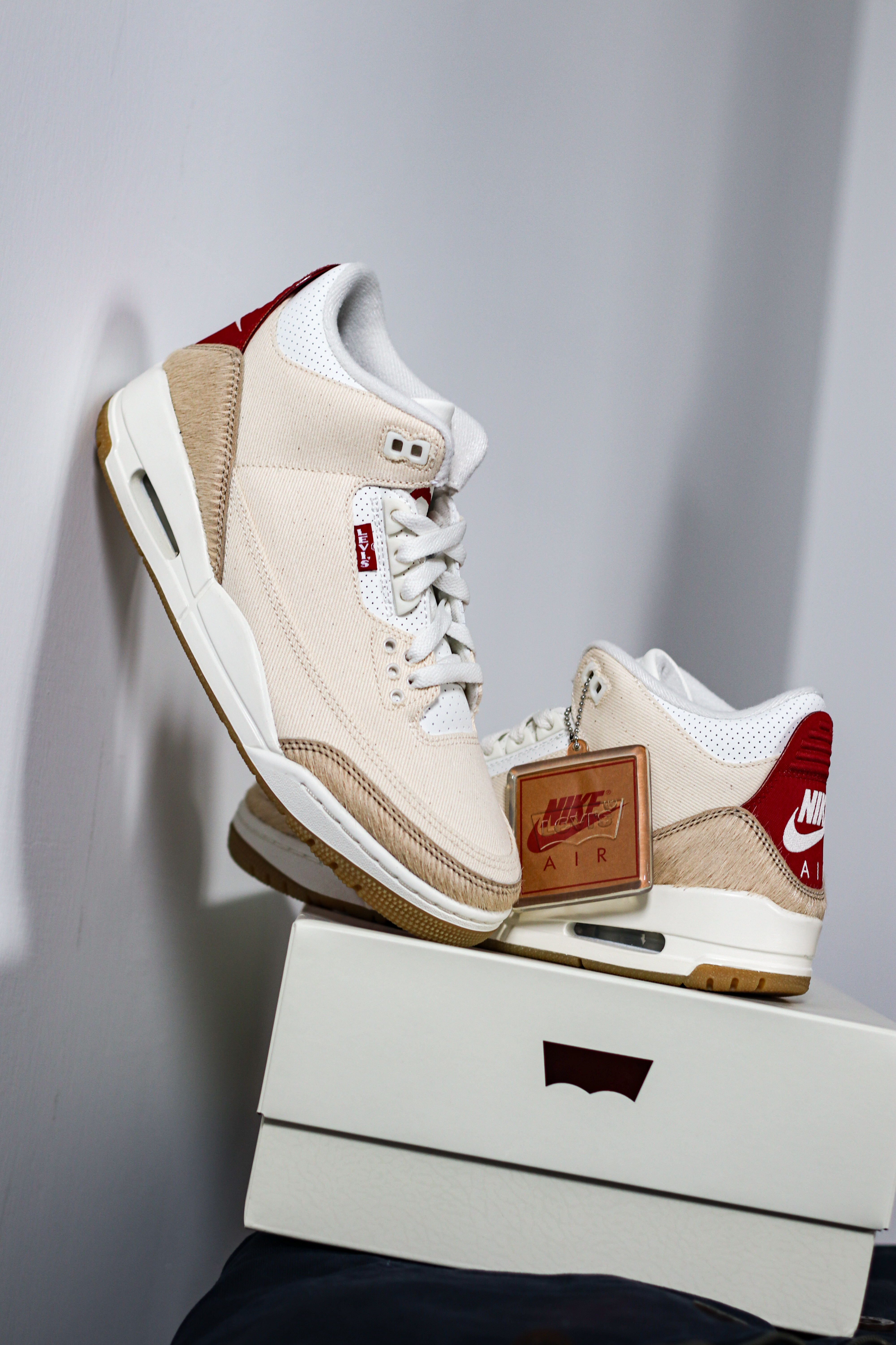 Levi’s和Jordan Brand联名的AJ3马年限定这个配色我觉得和之前那双Levi's AM95的浅色有点相似的味道~ 米白色的牛仔布,搭配棕色和红色点缀,挺百搭又有秋冬新年氛围感! 这个配色除了是联名款,还有一个加成点,就是马年限定~ 鞋头和后跟采用了浅棕色的仿马毛材质,质感一下子就上来了!而且鞋舌内里还有红色的“Year of the Horse”的字样,细节还是可以的! 红色Le...