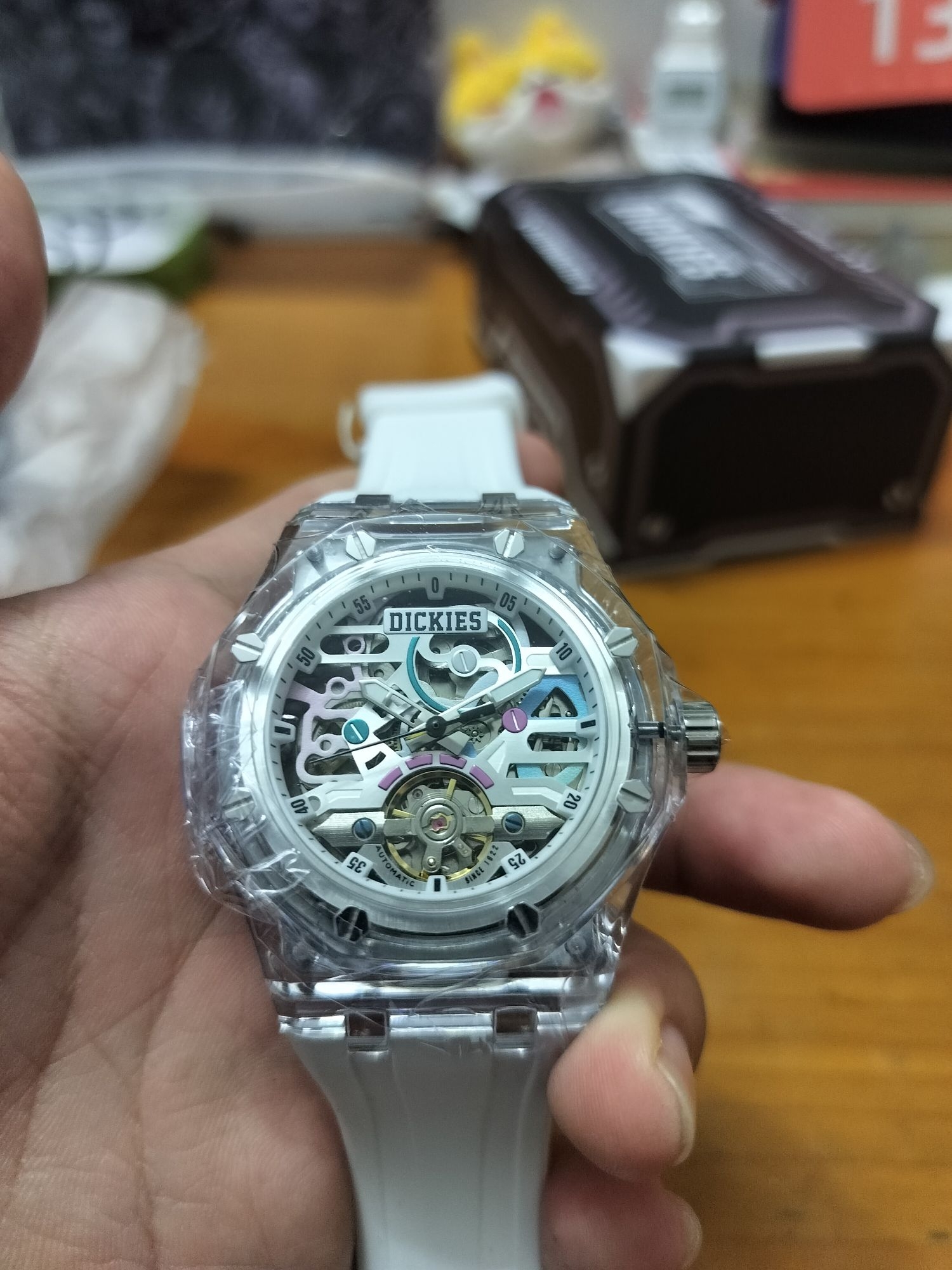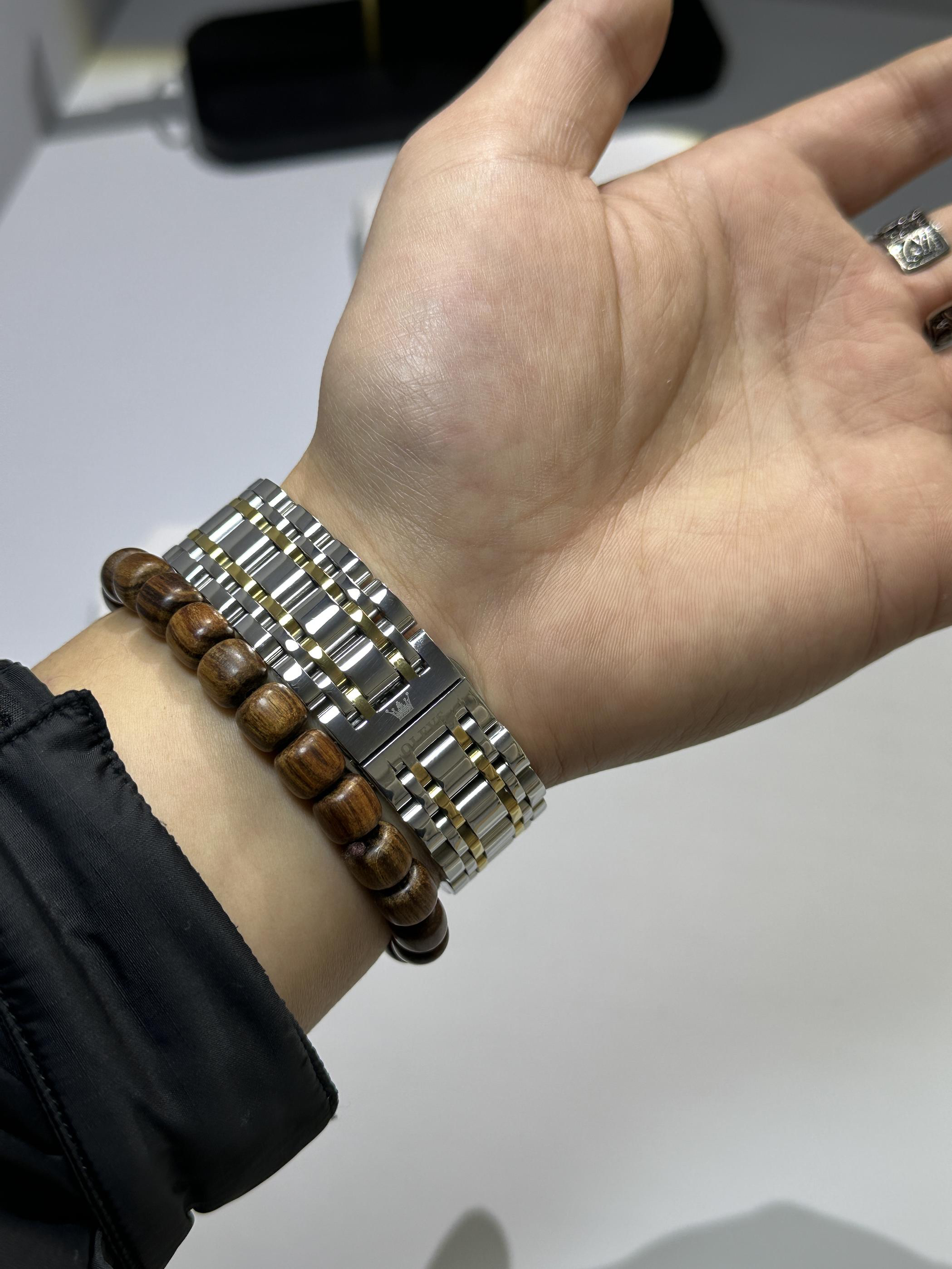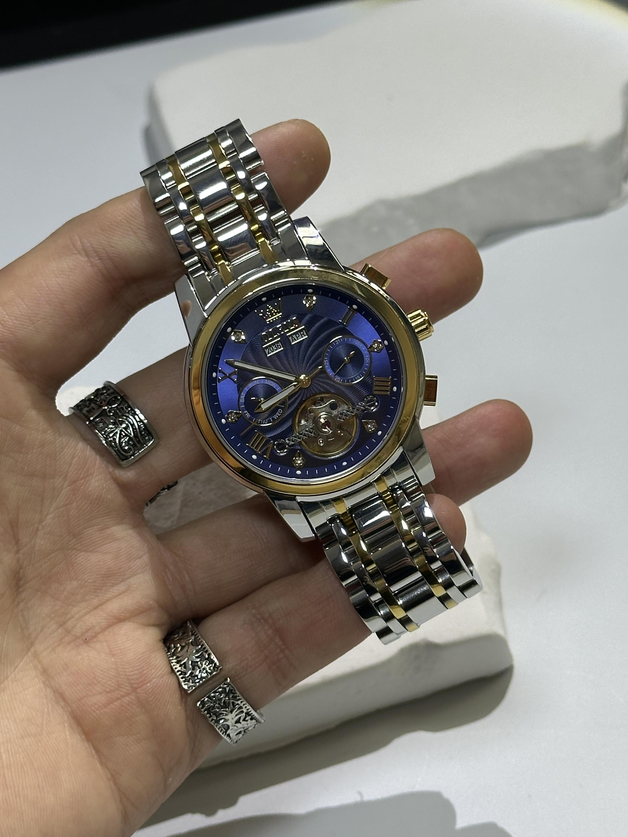 喜欢了好久的一块表❗️首先放在手里一掂量就知道,实心的精钢表带很有分量,配色是金配蓝一点也不会老气,表盘设计镶钻看起来闪闪发光,功能性当然也不会落下,年月显示、双历显示,陀飞轮设计机械档最爱,背透机芯带摆陀走路自动上弦,调表跟手即按即停,夜光效果非常出众,带30米防水。综合来说这块表在四百这个价位段属于功能和佩戴效果都拉满了,无论是送人还是日常佩戴都非常有面子,情人节快到啦,你的心上人值得拥有
