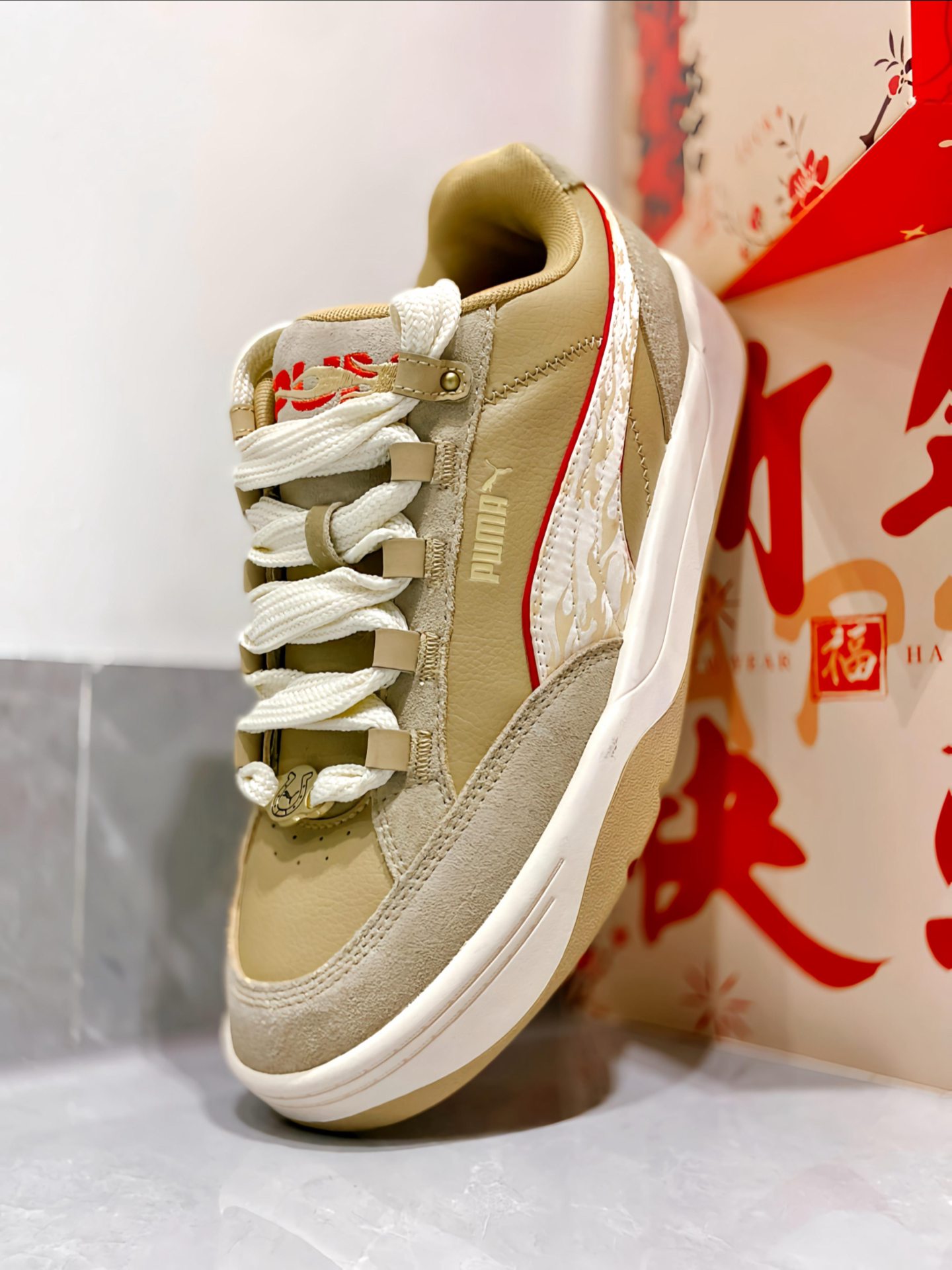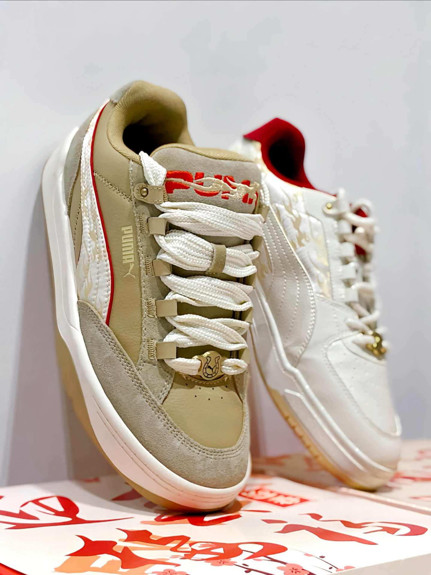 先说说这双卡其面包鞋,我感觉翻毛皮 + 皮革的组合特别有复古感,上脚软乎乎的。个人觉得配牛仔裤或者浅卡其工装裤都绝了,走在街上自带松弛感,鞋舌的红金马纹刺绣细节也超戳我。 另一双白红板鞋更亮眼,红白撞色加上金色细节,新年氛围感直接拉满。我平时也很爱搭运动裤或者牛仔裤,都很好看的,鞋尾的红绳刺绣和后跟的金色标,细节控表示一本满足。 其实本来还纠结选哪双,现在发现完全没必要 —— 卡其色走复古休闲...