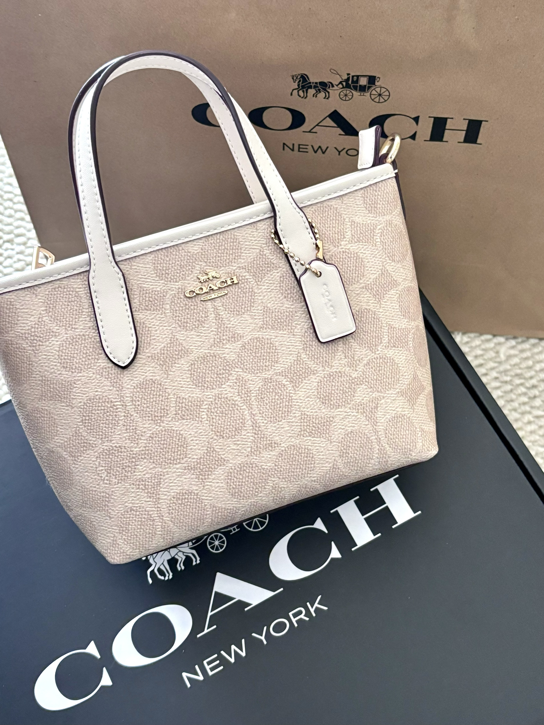 本篇笔记关联了Coach City 迷你 马车图案印花品牌徽标可拆卸肩带涂层帆布人造革购物袋单肩包托特包斜挎包手提包 粉笔色等商品,为用户提供真实的使用体验和购买参考。