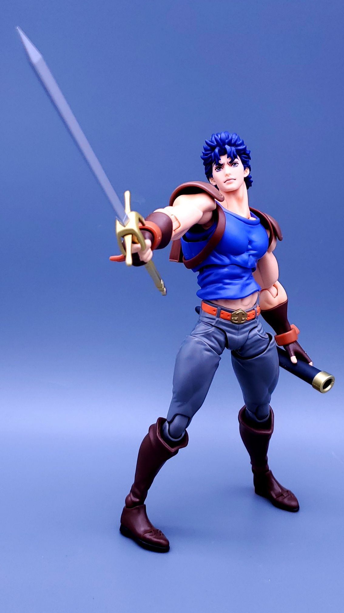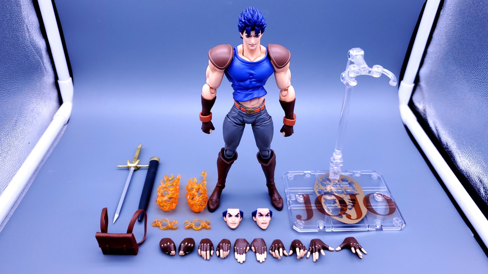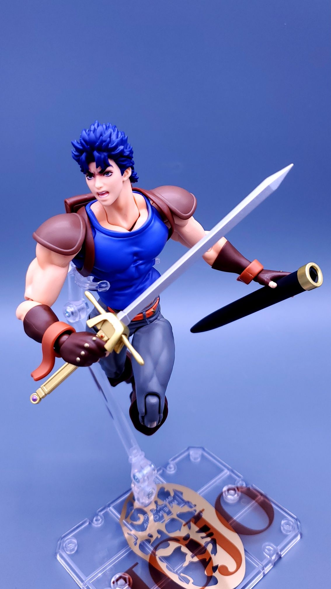 万代shf JOJO奇妙冒险 第一部幻影之血 乔纳森·乔斯达 ,发售与2025年12月,附带了3种面雕(平静脸,微笑脸,呐喊脸),6对造型替换手,配件有一个背包,一把剑和剑鞘,一对波纹功特效件,一个定制底座,把玩手感不错,关节紧实,是一款不错的可动模型。