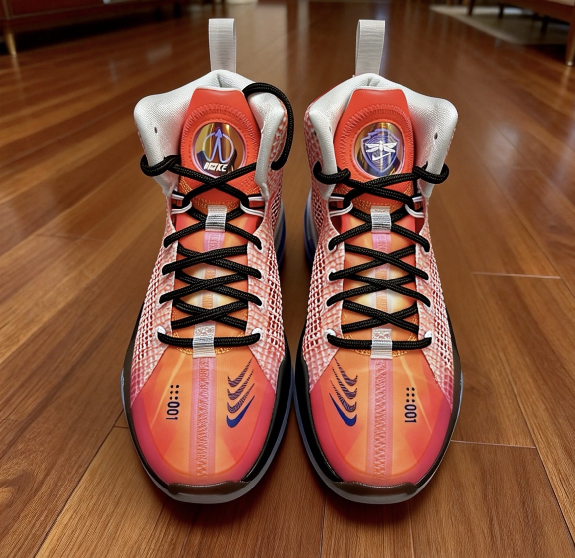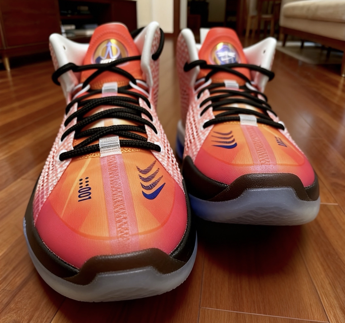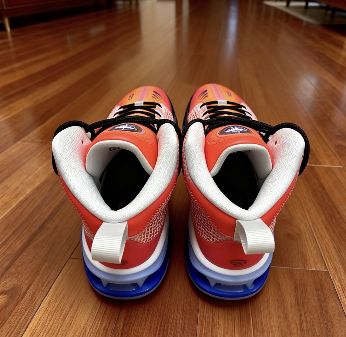 渐变橙红配色超亮眼,网眼布透气不闷脚,缓震反馈很扎实,打球落地稳得一批,包裹感刚好不挤脚,日常出街也百搭👍