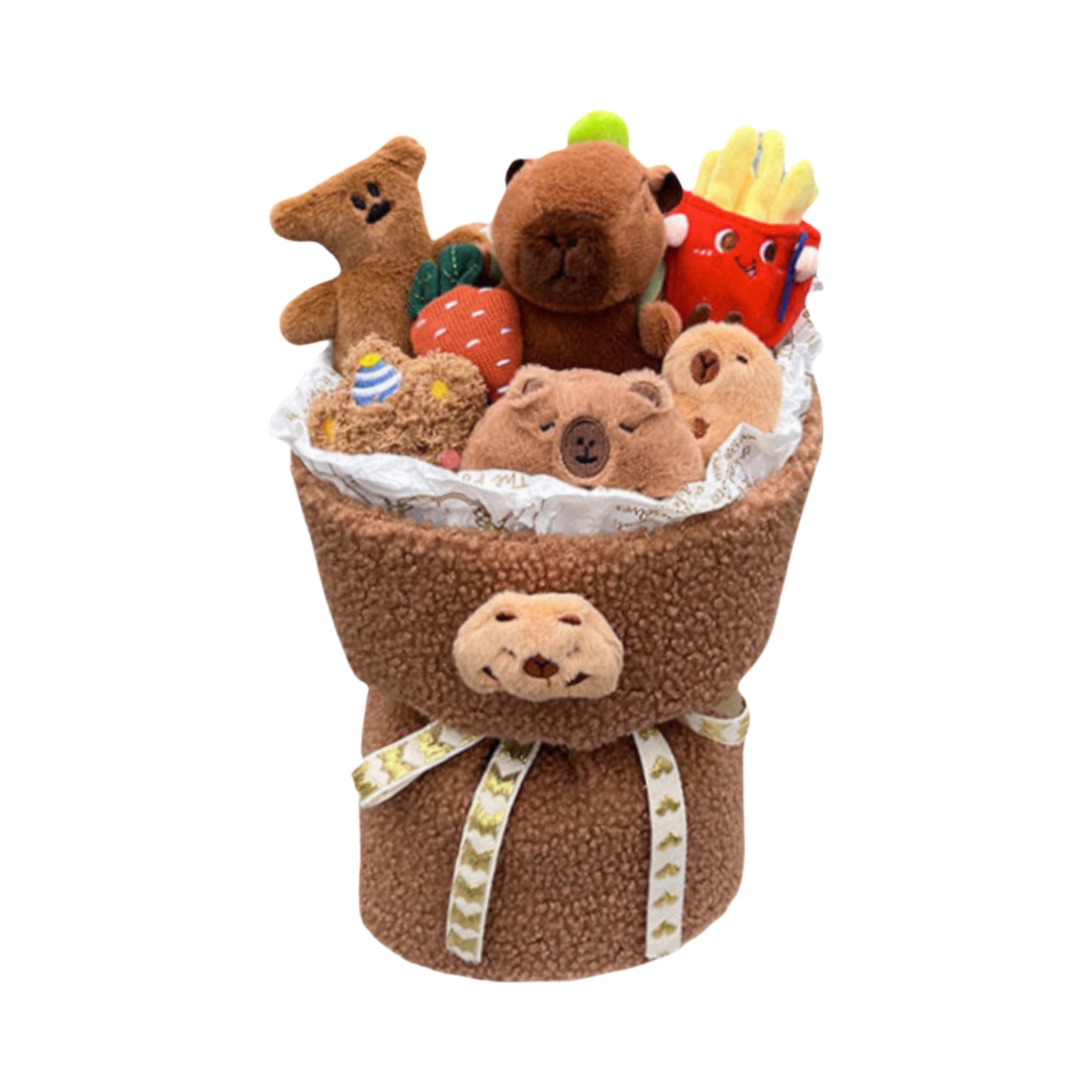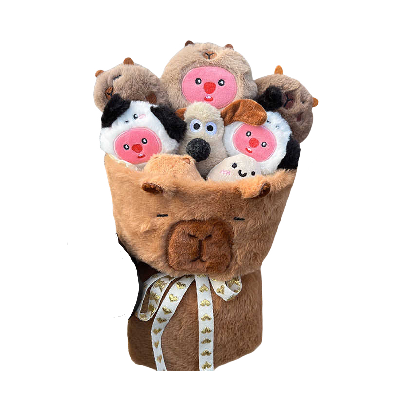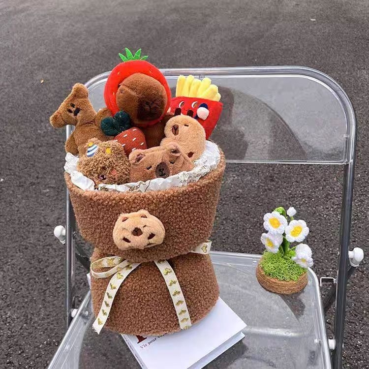 这束卡皮巴拉毛绒花束,将网络上佛系可爱的“水豚君”变成了永不凋谢的治愈礼物。约35cm的尺寸,捧在手里或作为装饰都恰到好处。 特点:毛绒面料柔软亲肤,水豚表情呆萌平静,完美复刻了其“情绪稳定”的网络形象。花束形式新颖,结合了玩偶的可爱与鲜花的仪式感。 场景:它是独特的桌面陪伴、车内装饰,更是送给朋友表达“愿你像卡皮巴拉一样 relax”的创意好礼。无需打理,长久陪伴。 提示:部分花束为手工制...