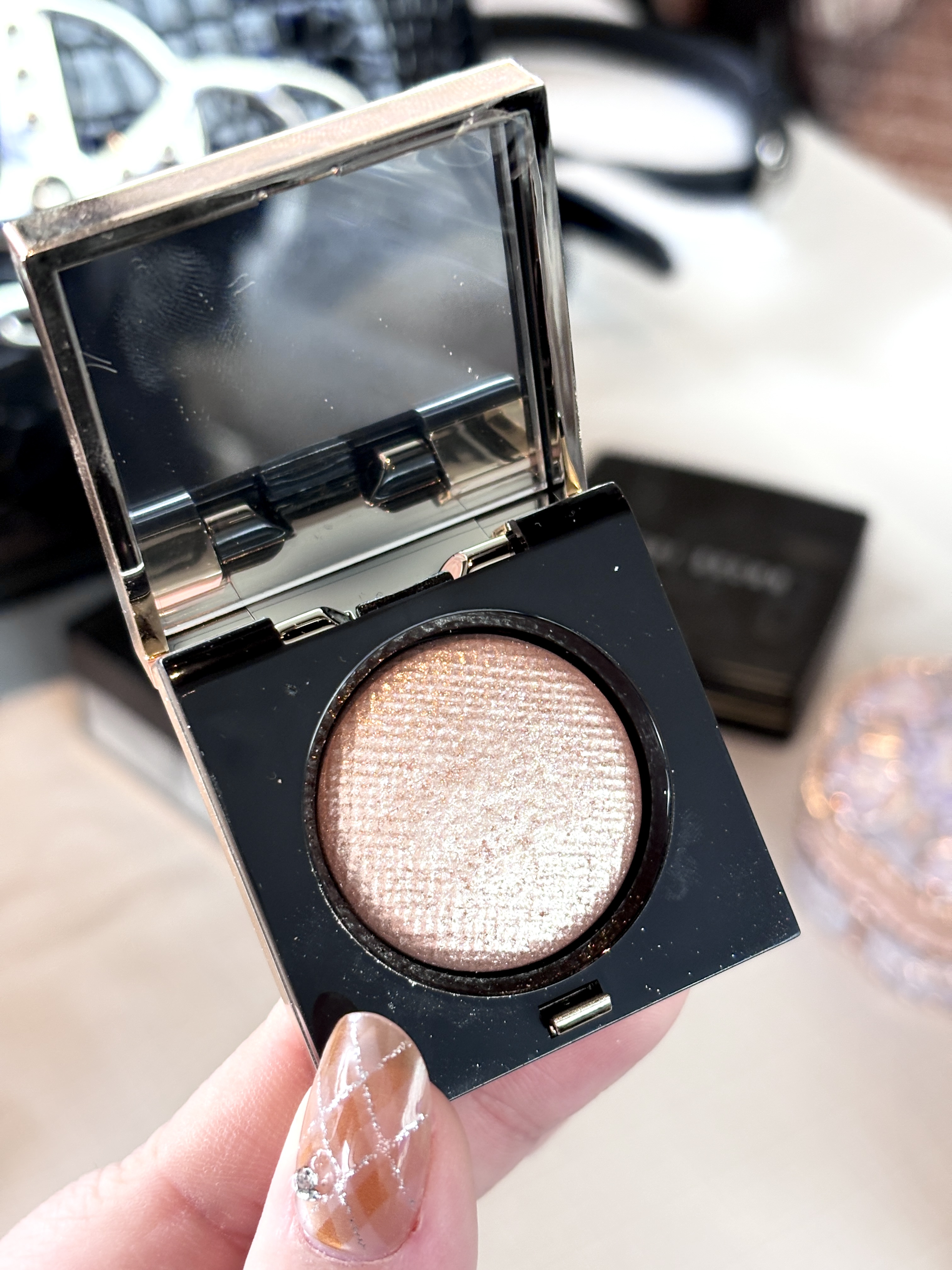芭比波朗这块月光石高光真的是年度惊喜 香槟金底色带着细腻的粉金细闪 上脸就像皮肤里透出来的光泽,一点不显毛孔 打在颧骨、鼻尖和眉骨,瞬间让面部立体起来 黄皮用也完全不突兀 浮雕金壳子拿在手里超有分量感 补妆时掏出来都自带贵气buff