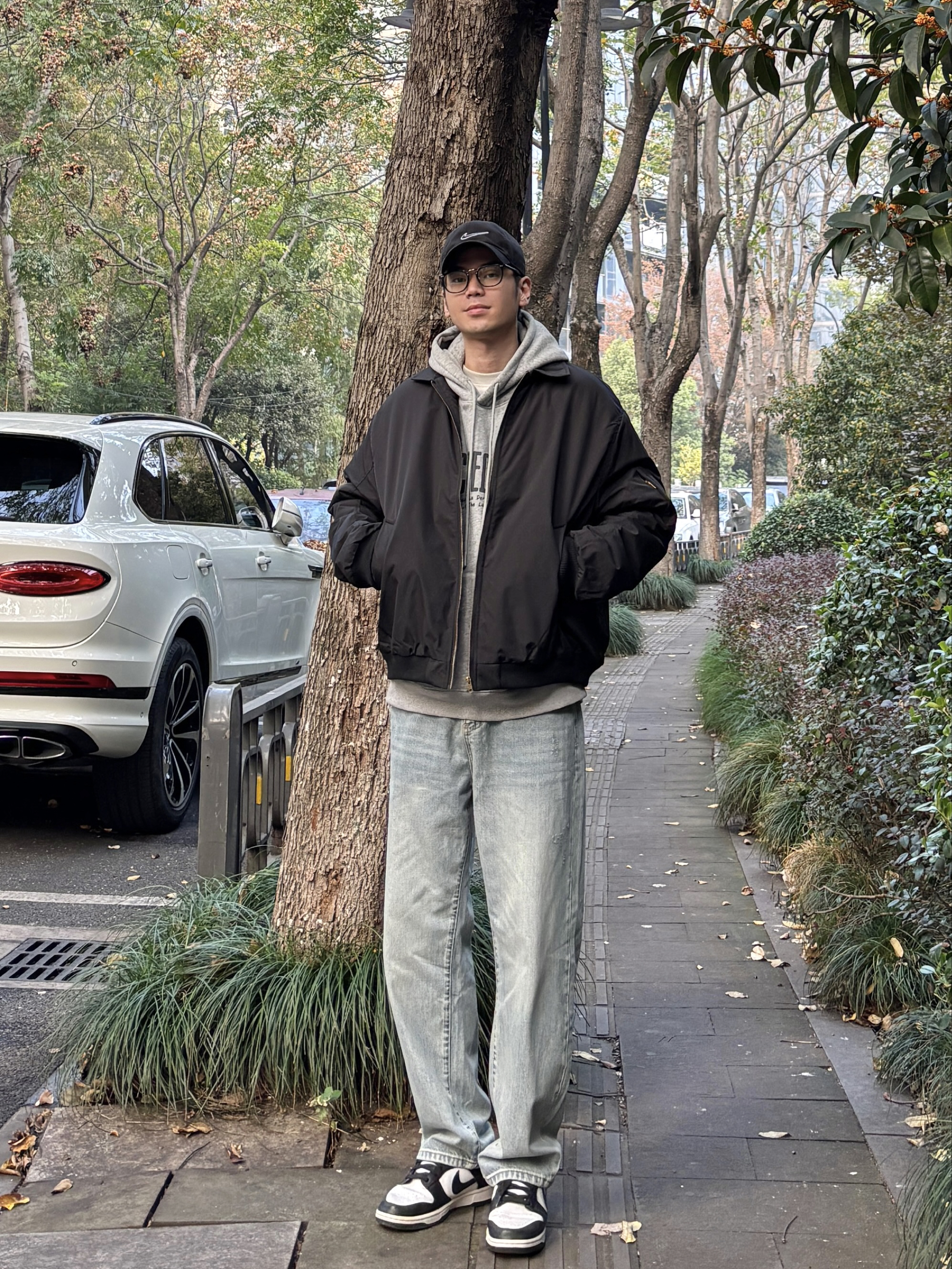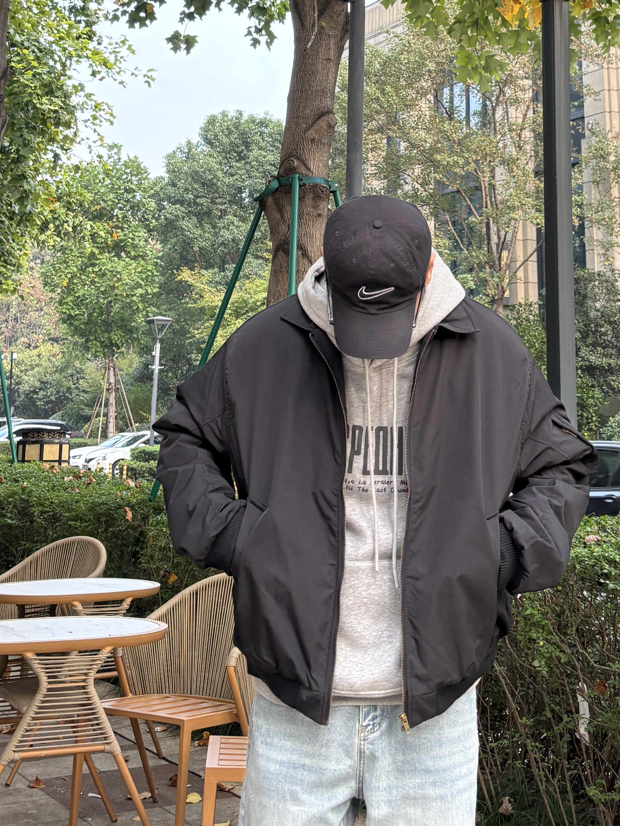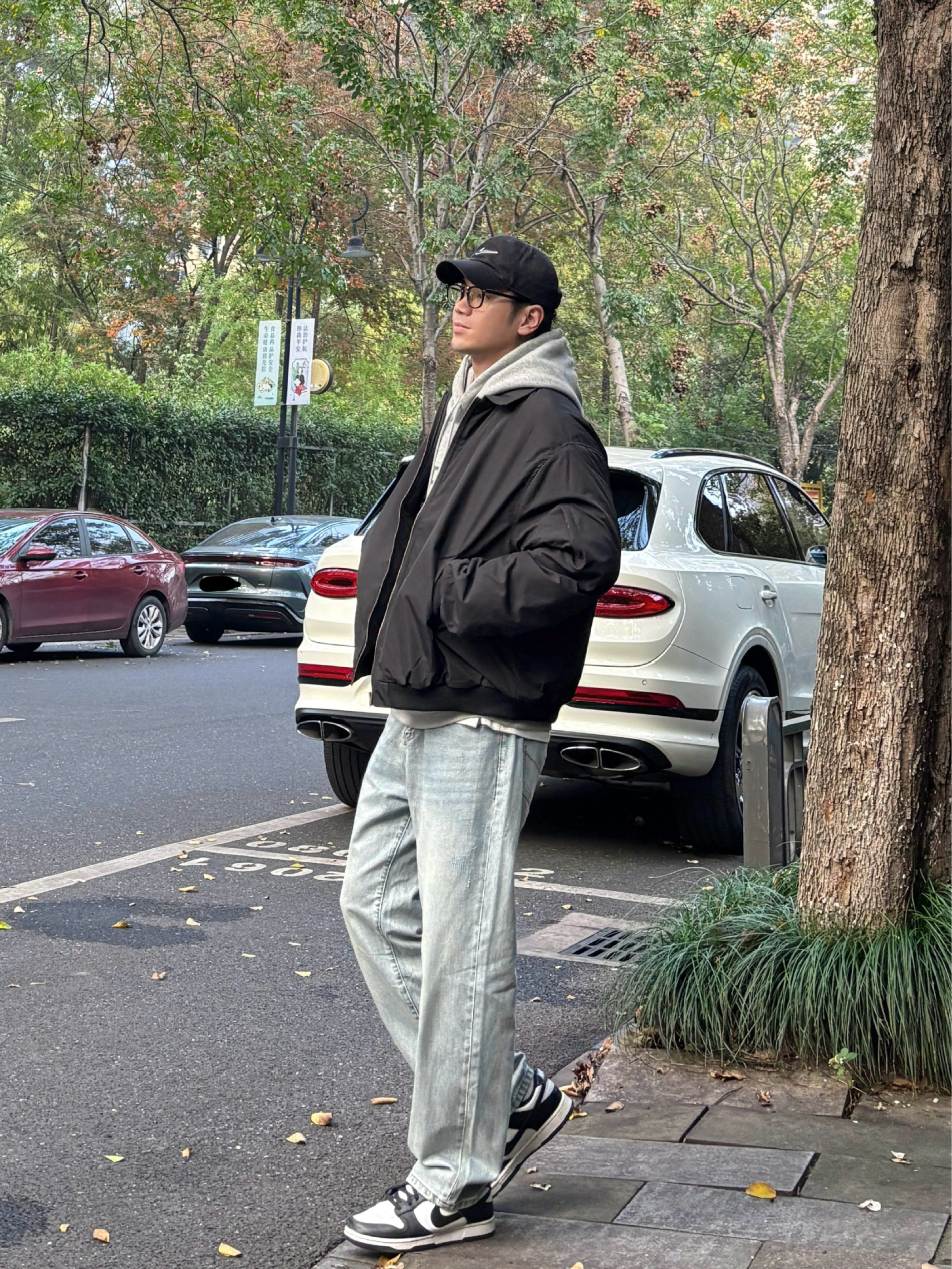 冬季懒人穿搭公式被我找到啦! 黑色翻领飞行员棉服夹克自带酷感buff,硬挺版型很显精神!内搭浅灰字母卫衣中和硬朗,浅蓝色直筒水洗牛仔裤慵懒感十足,黑白板鞋清爽利落,黑色棒球帽收尾超点睛。日常出街舒适又上镜,通勤休闲这样穿都👌 有没有和我一样喜欢这种简约风搭配的?快来评论区集合呀🙋♂️ - 今日穿搭 衣服裤子:NICE LILI 鞋子:nike dunk黑白