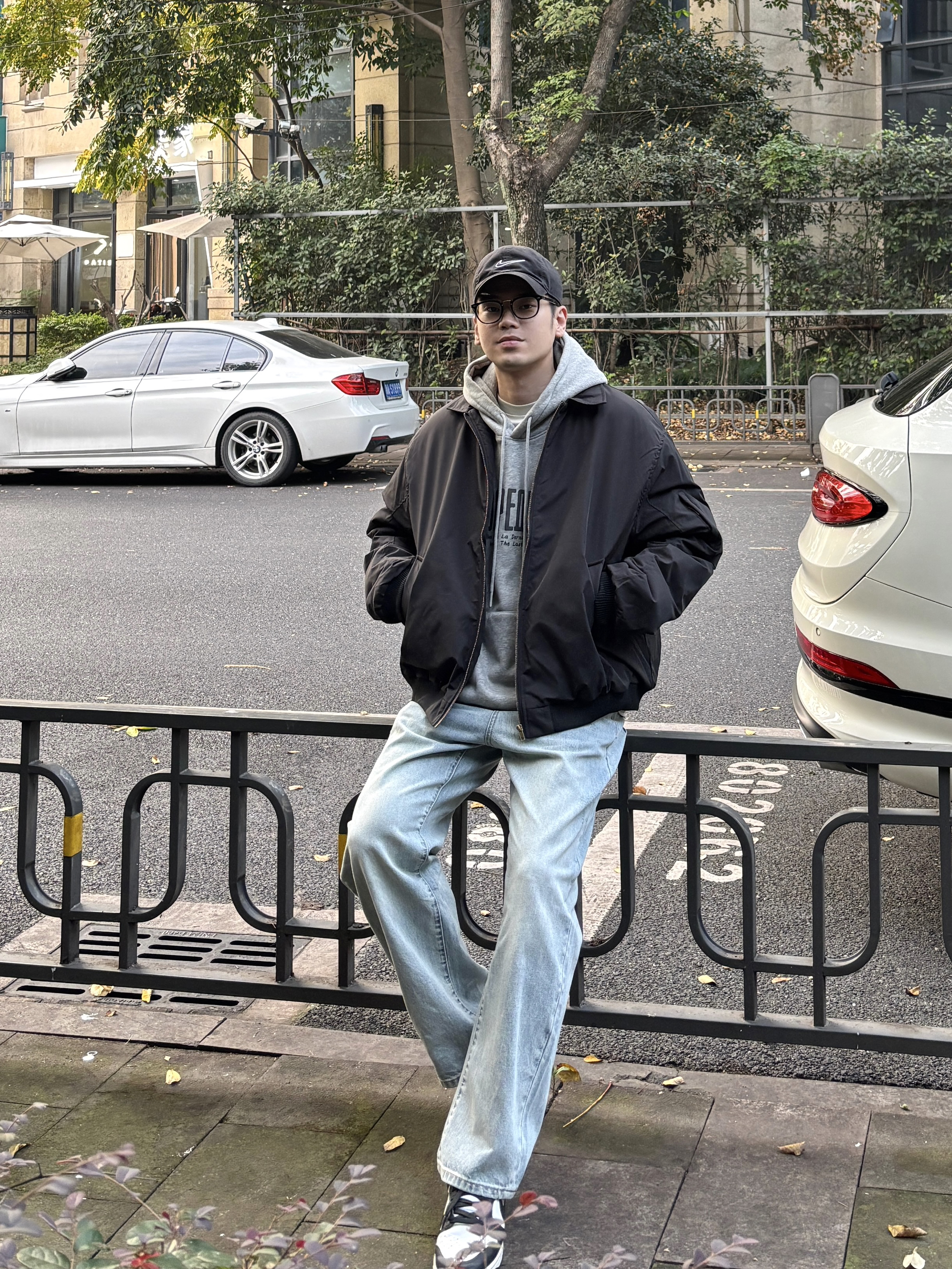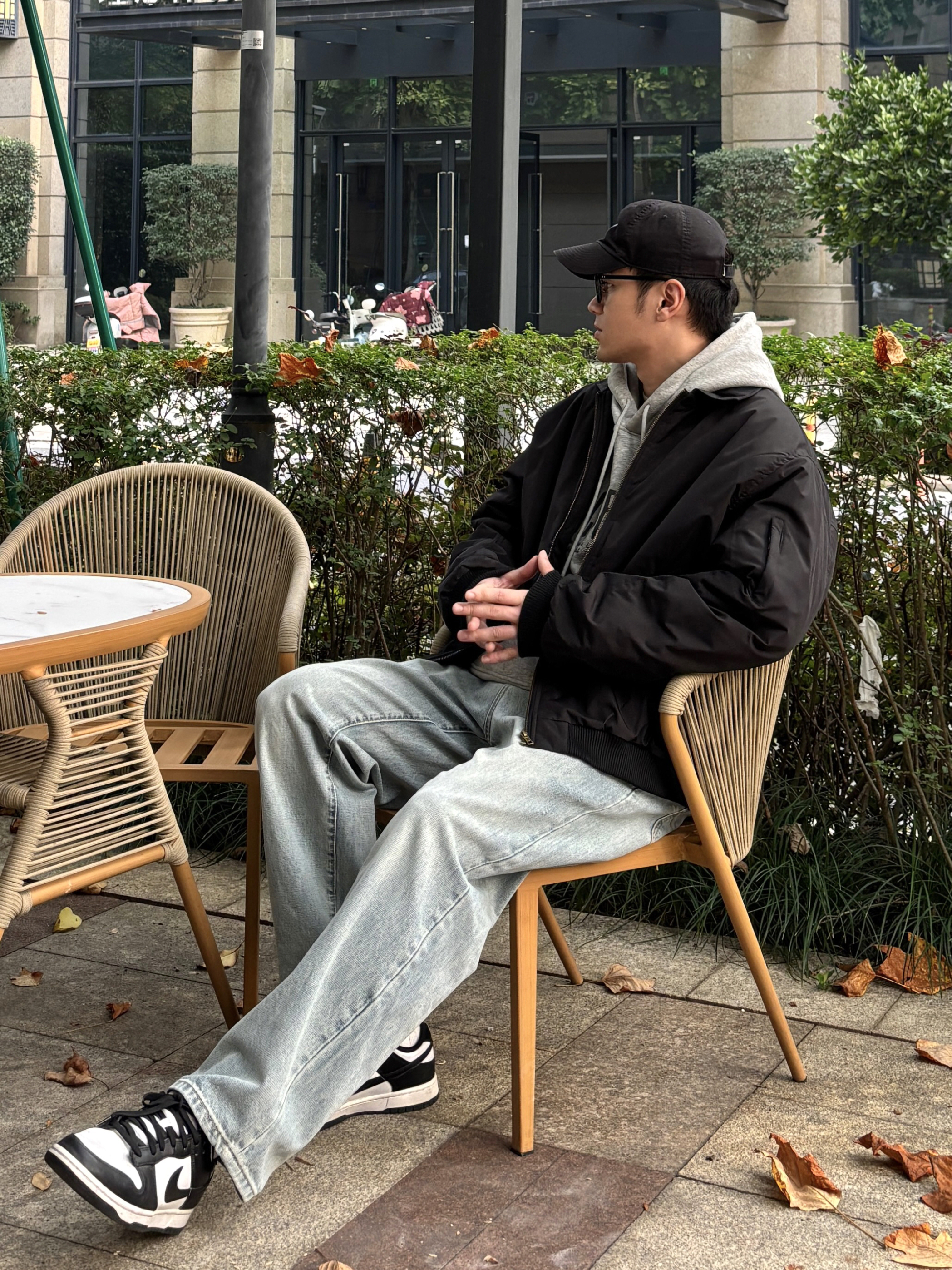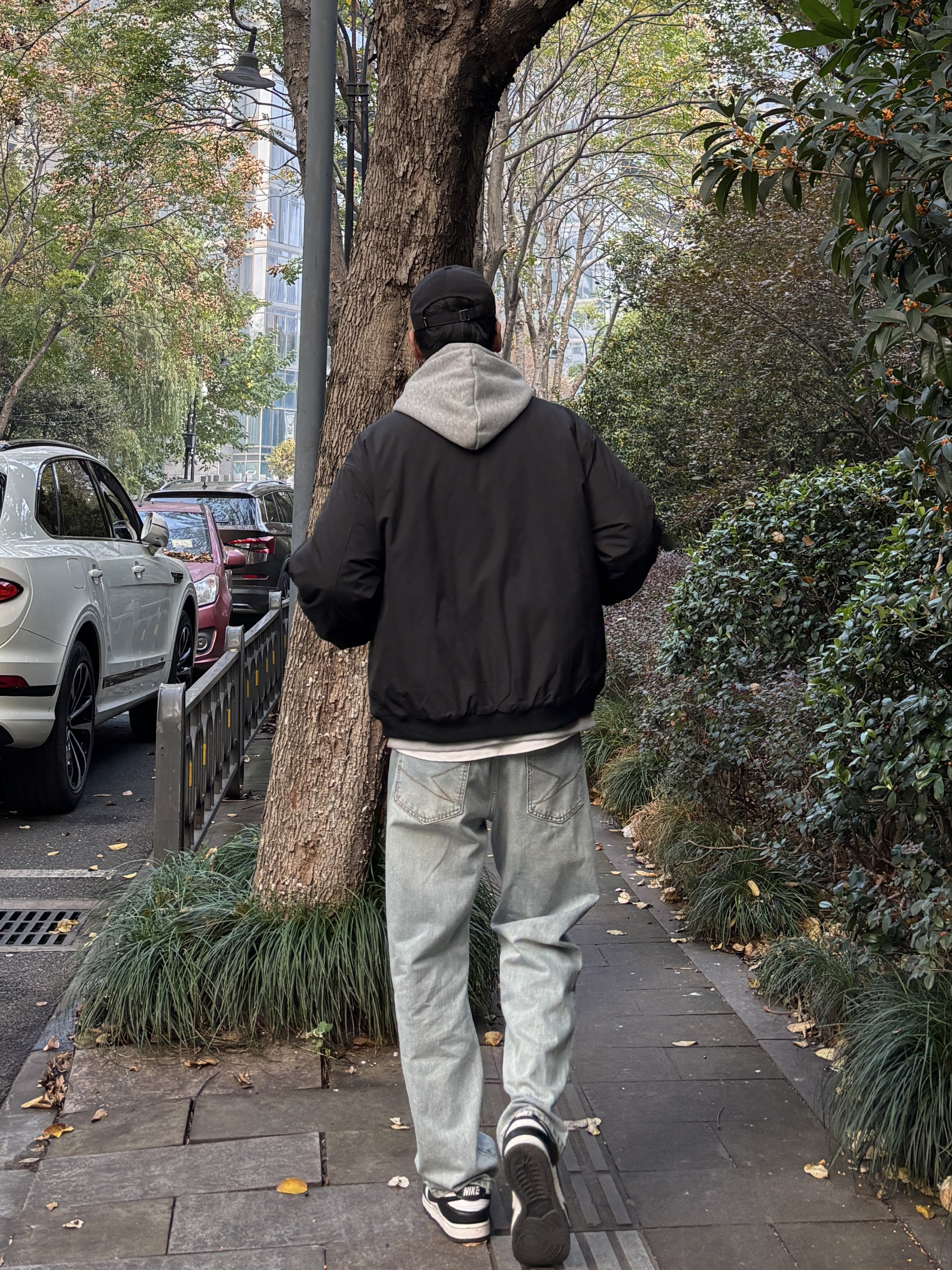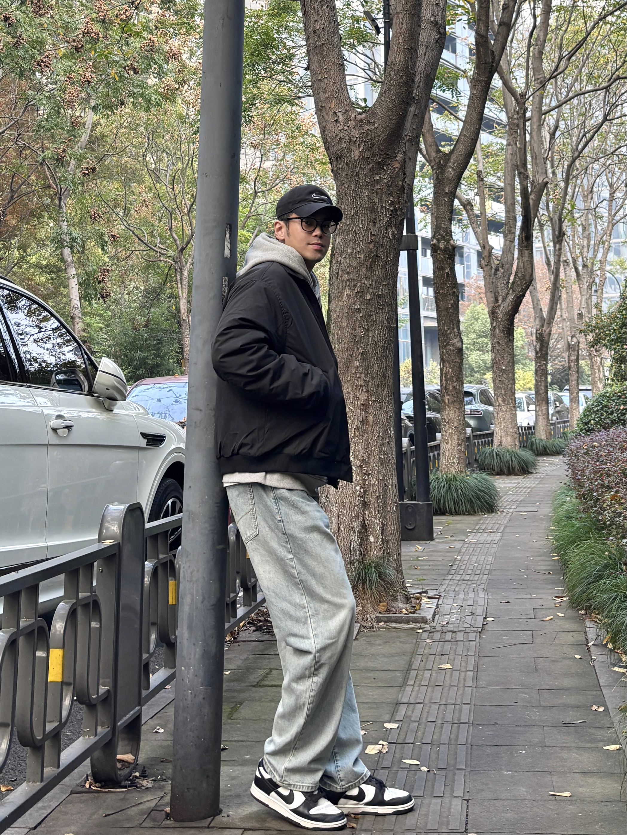 冬季懒人穿搭公式被我找到啦! 黑色翻领飞行员棉服夹克自带酷感buff,硬挺版型很显精神!内搭浅灰字母卫衣中和硬朗,浅蓝色直筒水洗牛仔裤慵懒感十足,黑白板鞋清爽利落,黑色棒球帽收尾超点睛。日常出街舒适又上镜,通勤休闲这样穿都👌 有没有和我一样喜欢这种简约风搭配的?快来评论区集合呀🙋♂️ - 今日穿搭 衣服裤子:NICE LILI 鞋子:nike dunk黑白