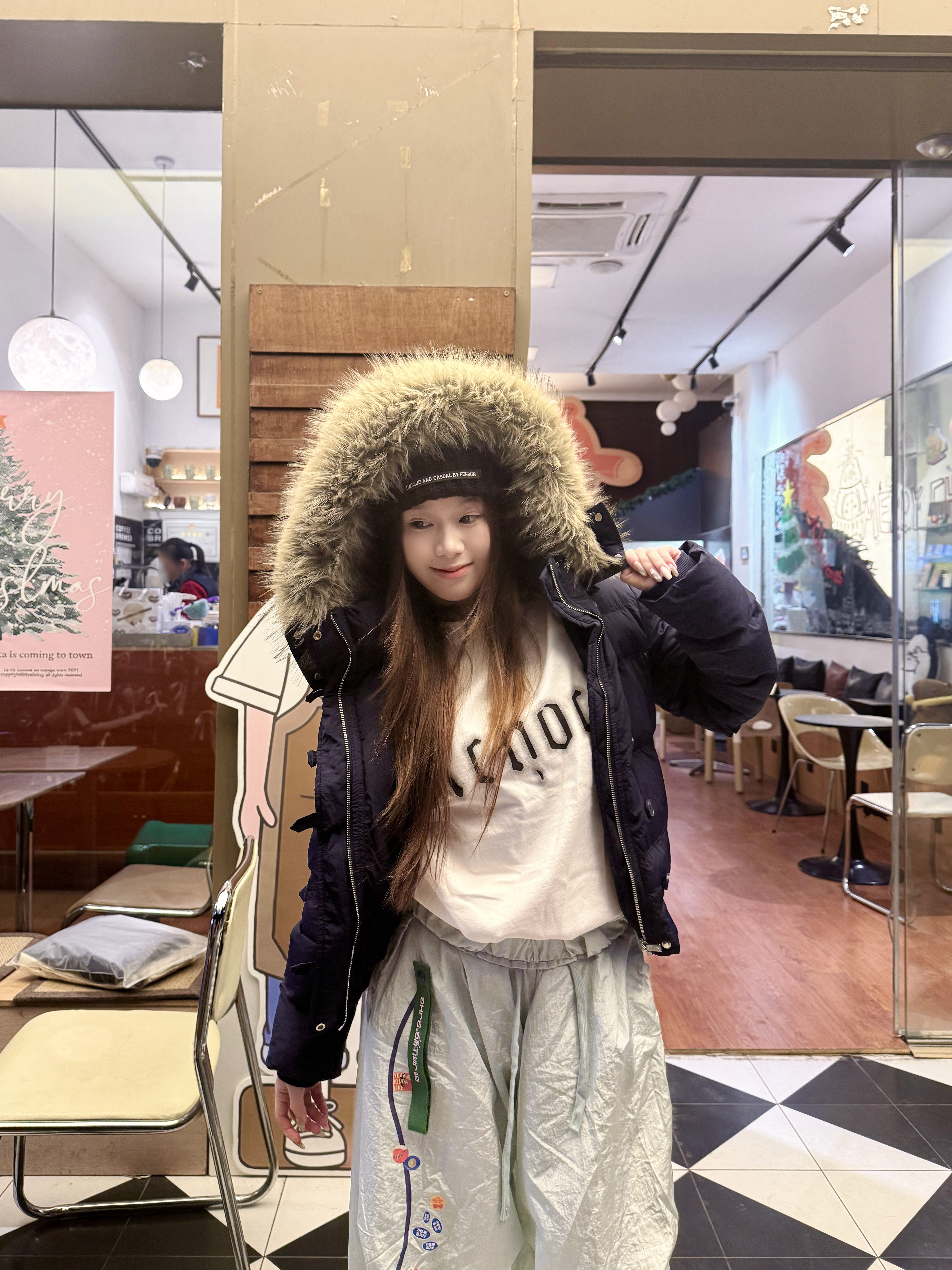 ac这款藏青色羽绒服也太显白噜 短款更能拉长比例 属于是小个子的安全区了 我160/45kg穿s 衣服刚好卡在腰线上 穿条微喇裤,就显得腿很长了 帽子上有大毛领 现在冬天出门风很大 带上帽子刚好稳稳挡住~