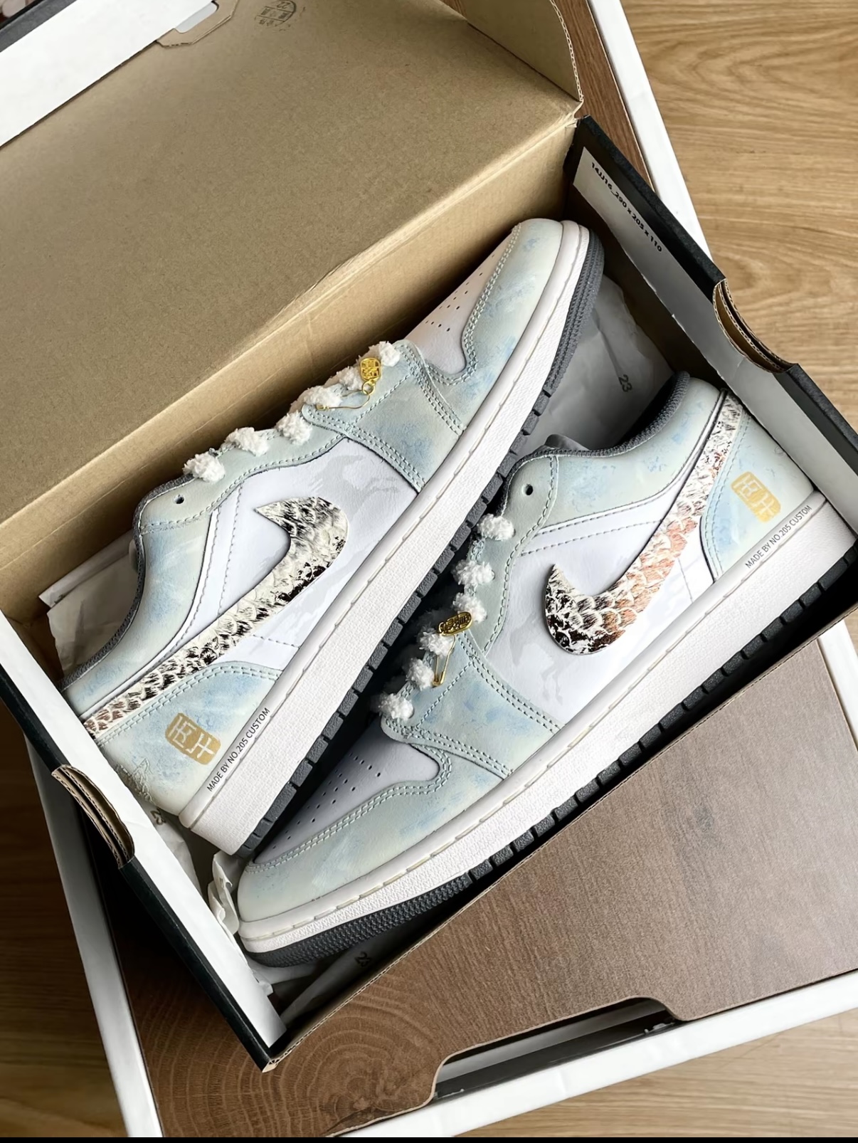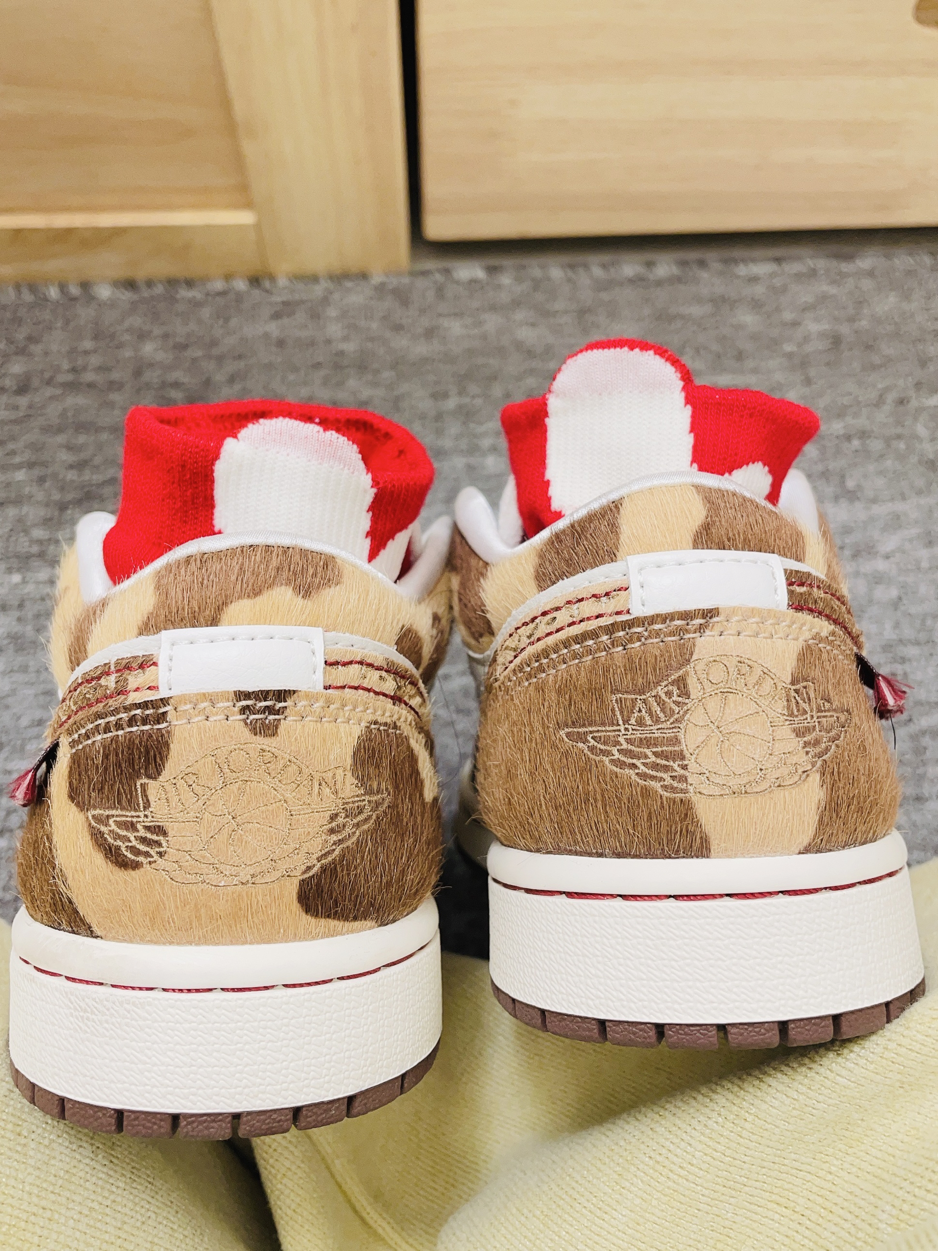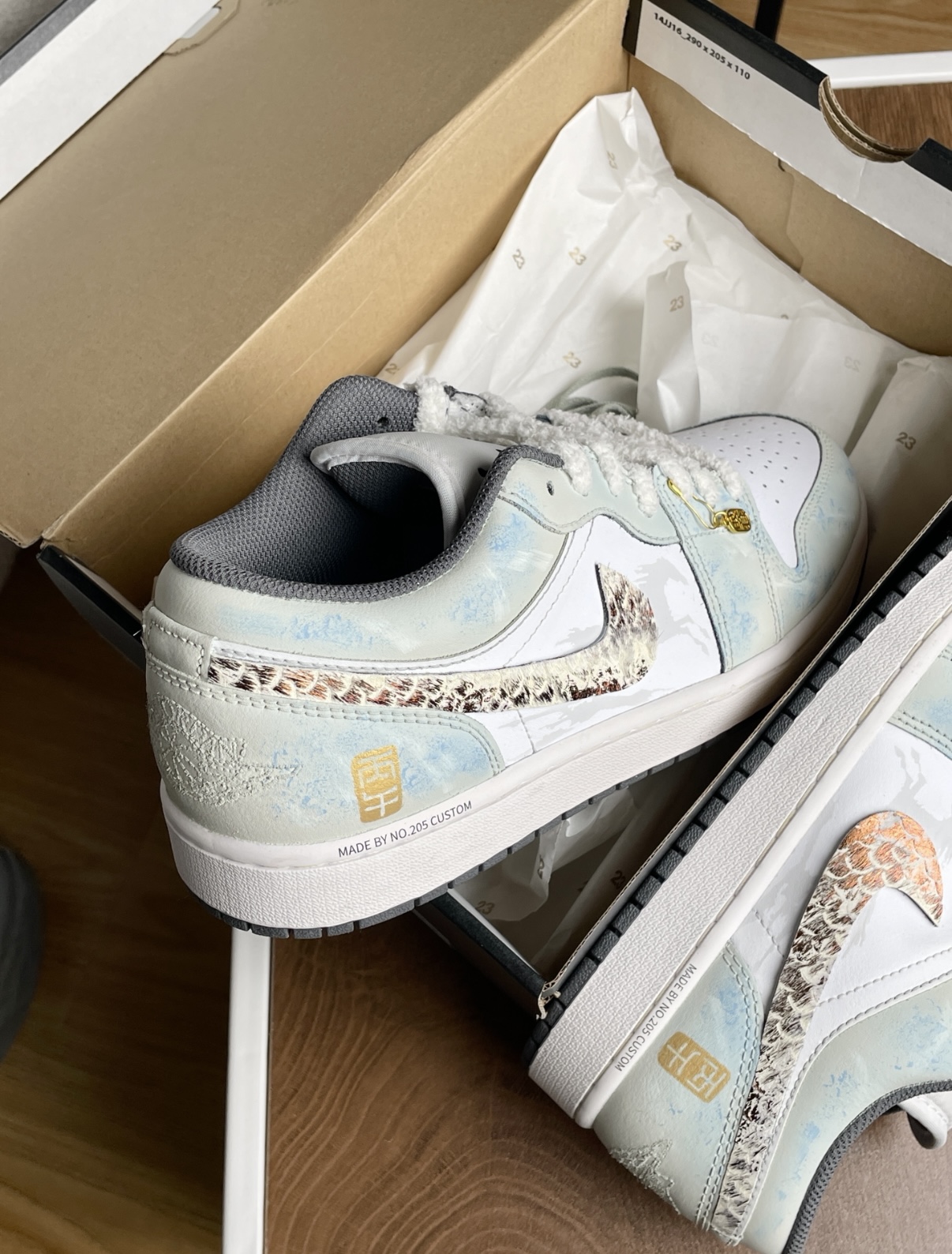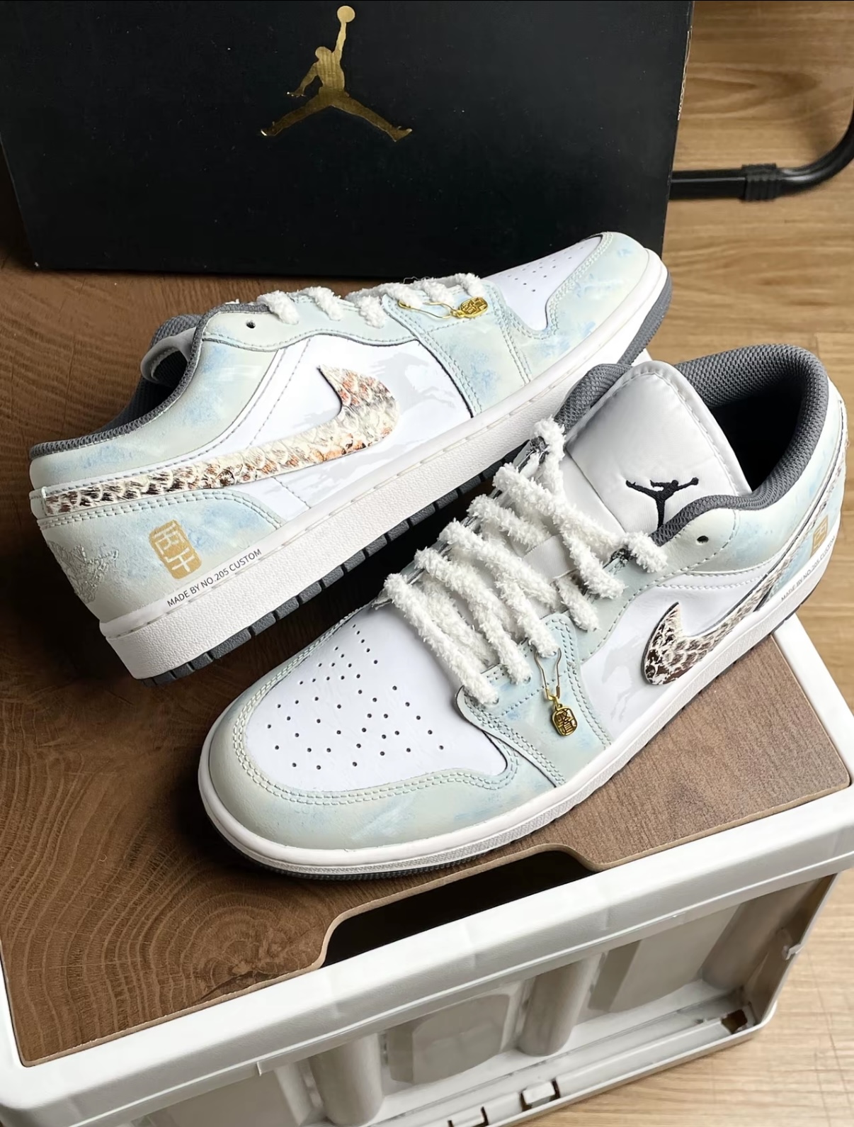 新年第一双本命鞋必须是这双AJ1流沙之马定制款!灰蓝色调的鞋身晕染出流沙纹理,马毛质感的Swoosh搭配金色金属标,把马年新春的国潮氛围感拉满,情侣款配色还能和对象搭情侣鞋,甜到齁💕 上脚体验超惊喜,低帮设计对女生超友好,不压脚踝还显腿细,鞋床的缓震垫踩起来软乎乎的,通勤走一天路都不累脚。头层皮的鞋面耐磨又有质感,弯折也不容易留折痕,搭卫衣、大衣、牛仔裤都百搭,新年出街穿它回头率直接拉满!