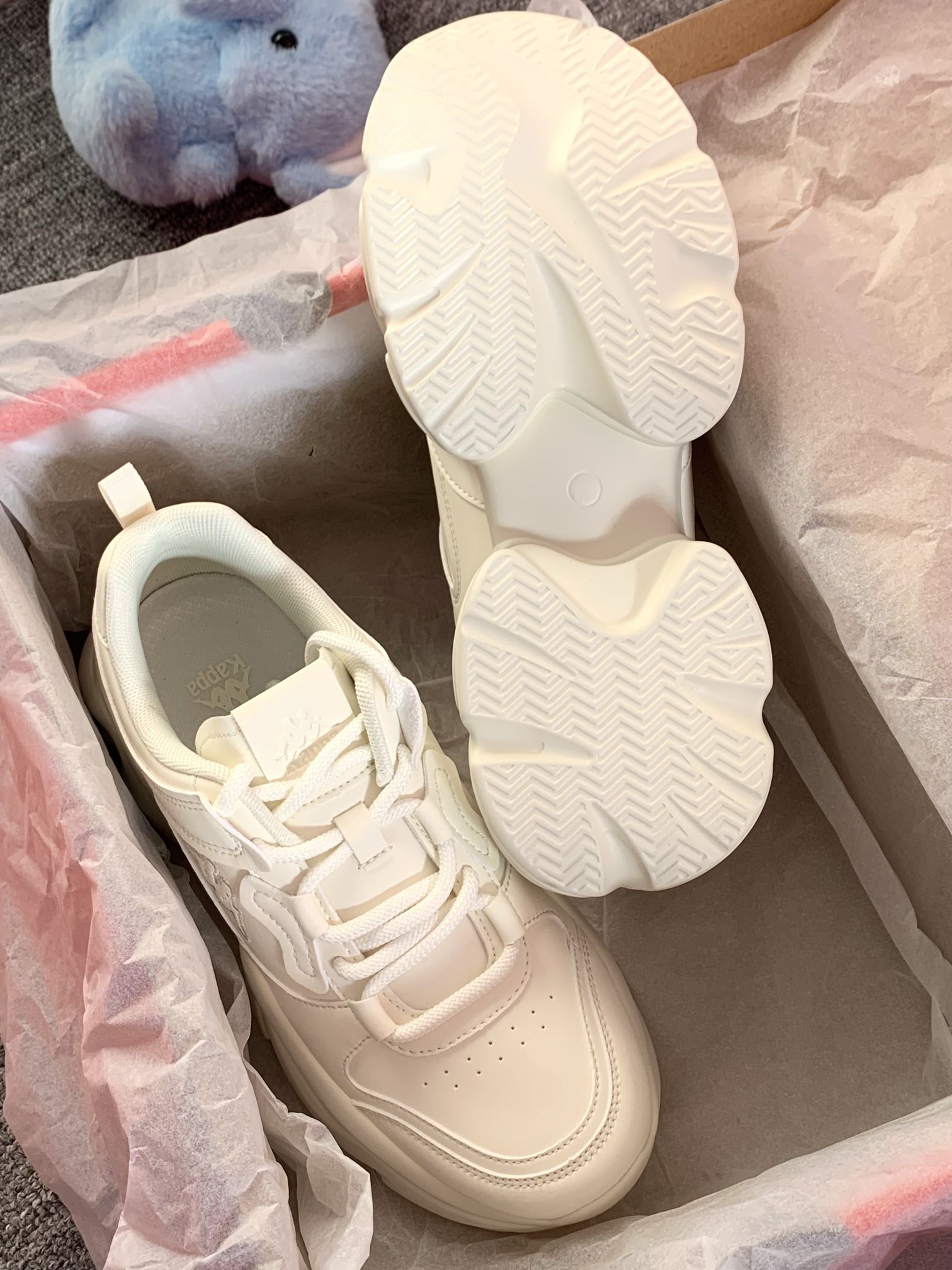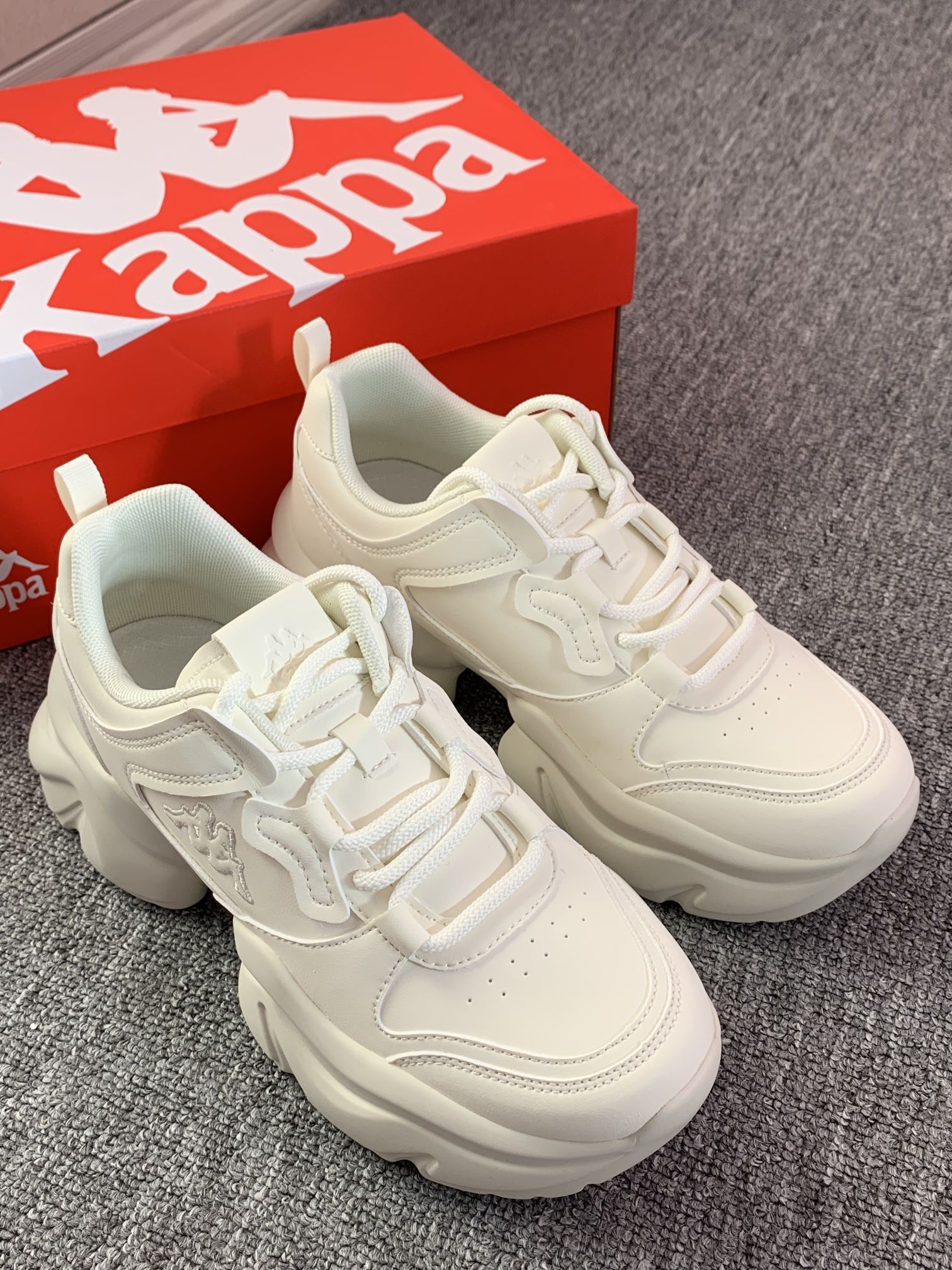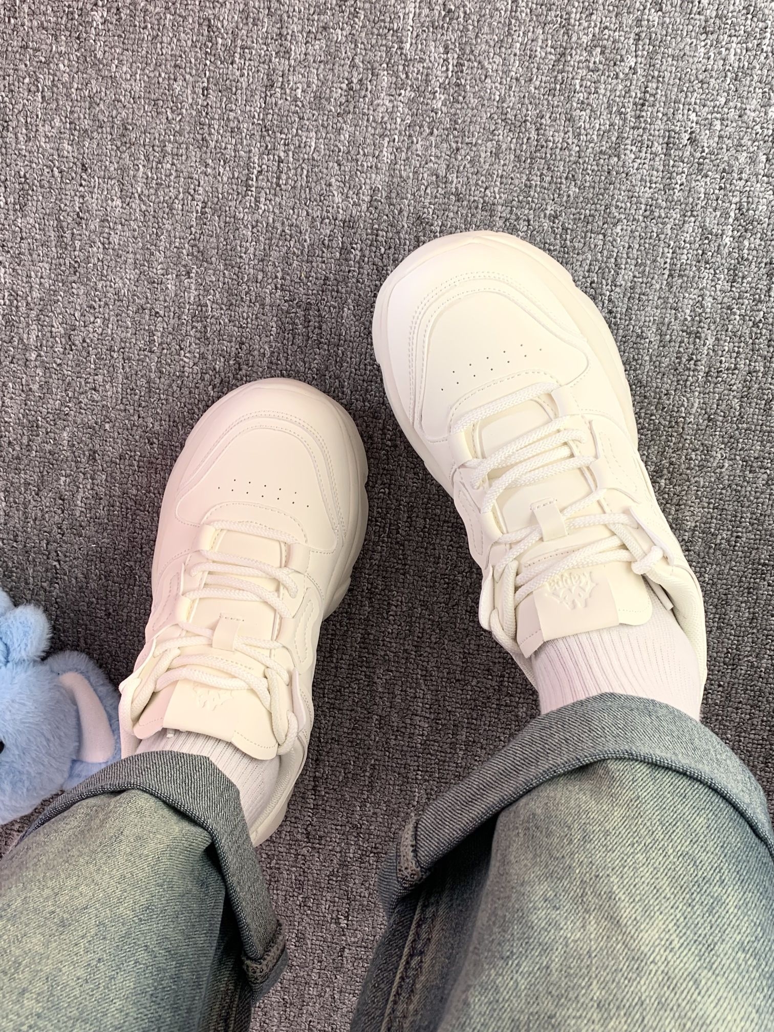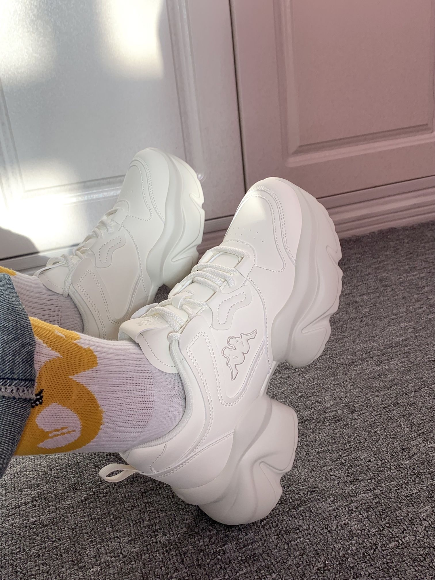 一年四季可穿的白色老爹鞋 增高有6厘米左右厚底走路稳当 对小个子蛮友好的还显腿长 Kappa 的鞋子属于街头感满满偏潮流 鞋子上脚软呼呼的,穿着还蛮舒适 我自己亲测逛街一上午不累脚,也不闷脚 关键随便一搭配就可以出门啦