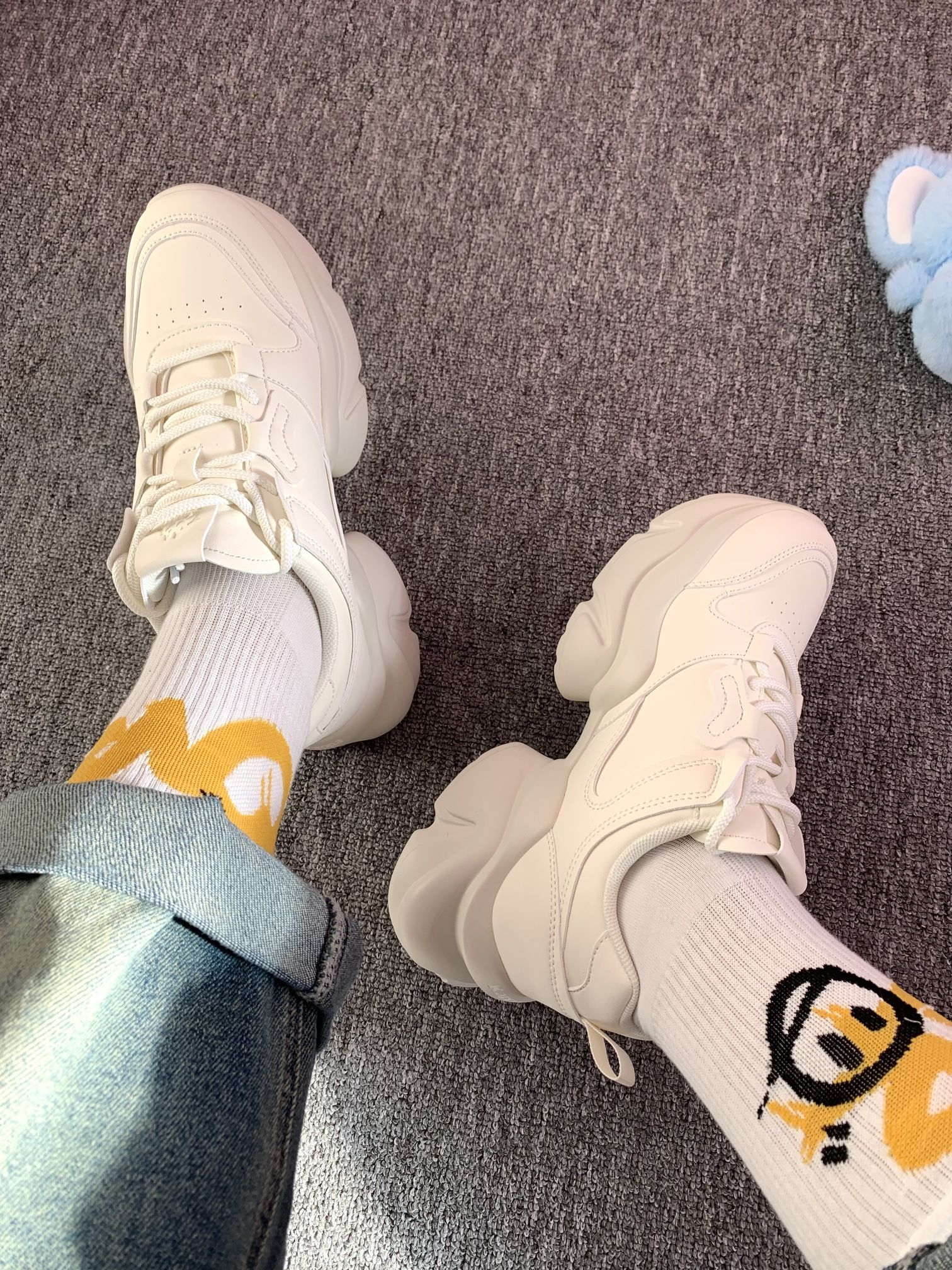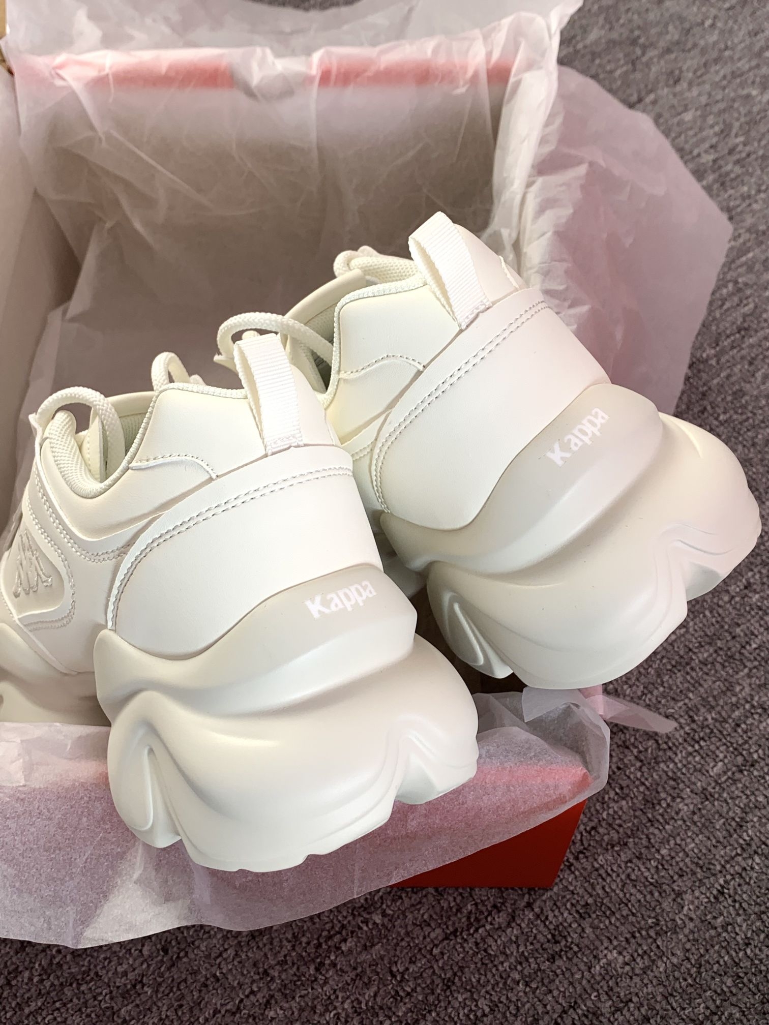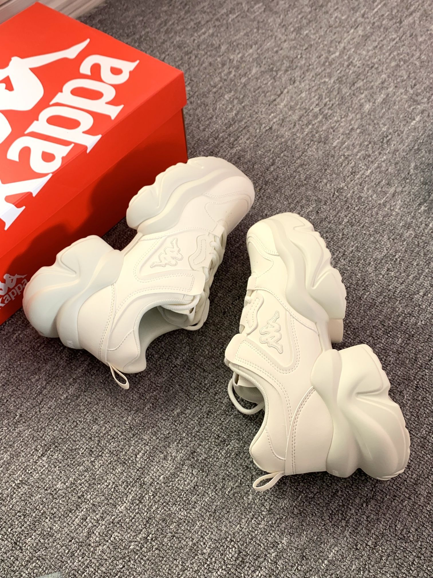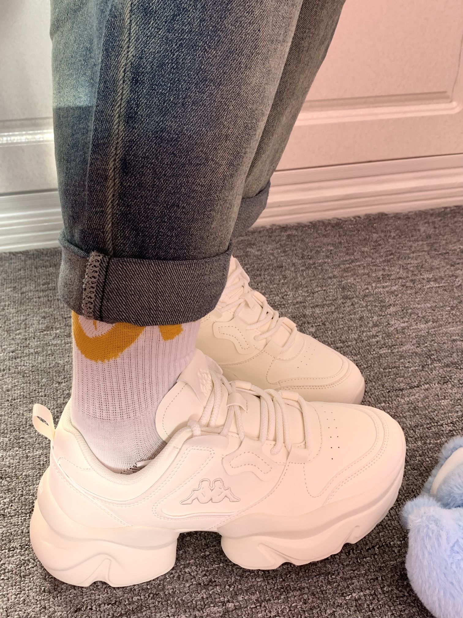 一年四季可穿的白色老爹鞋 增高有6厘米左右厚底走路稳当 对小个子蛮友好的还显腿长 Kappa 的鞋子属于街头感满满偏潮流 鞋子上脚软呼呼的,穿着还蛮舒适 我自己亲测逛街一上午不累脚,也不闷脚 关键随便一搭配就可以出门啦