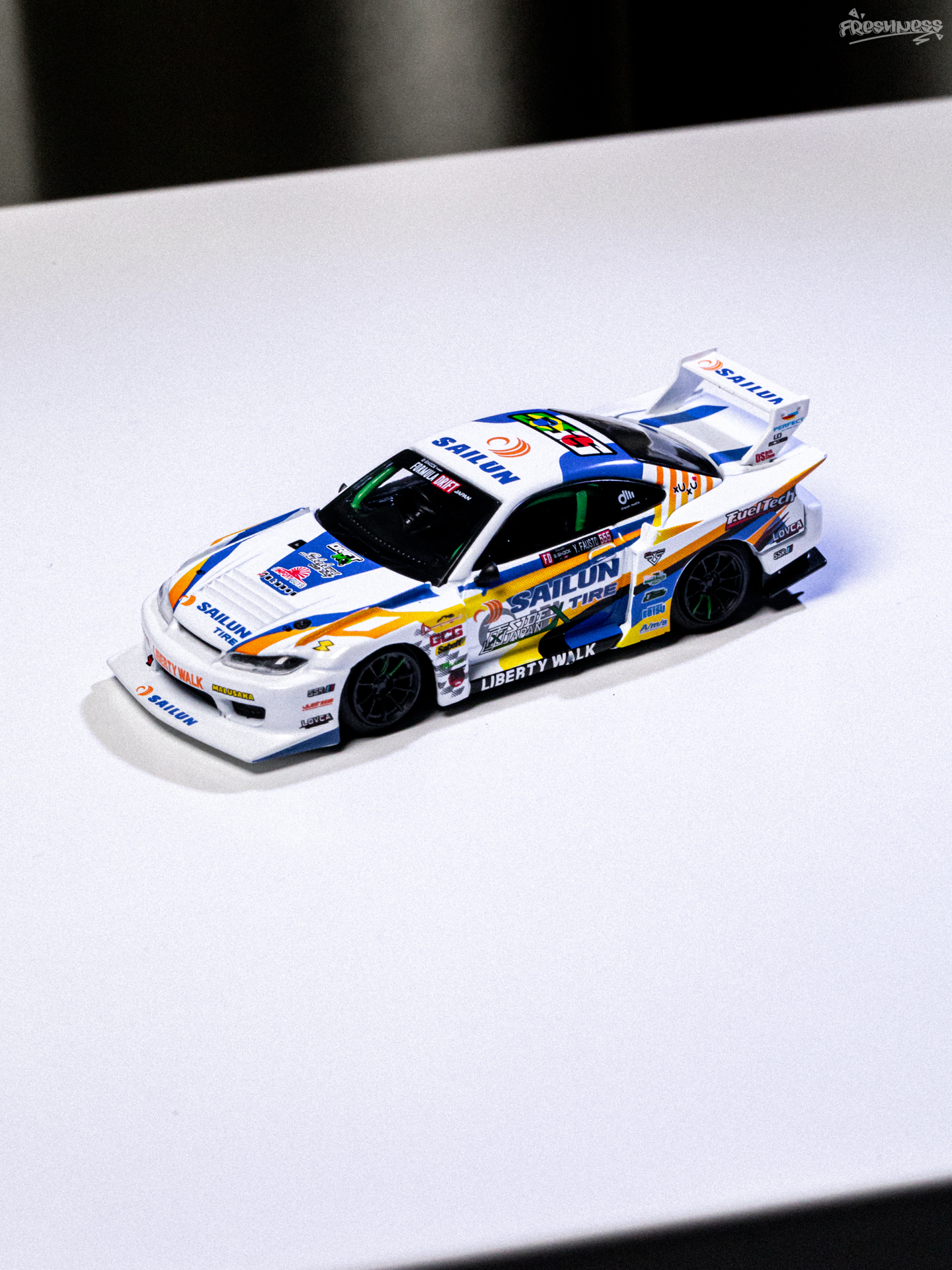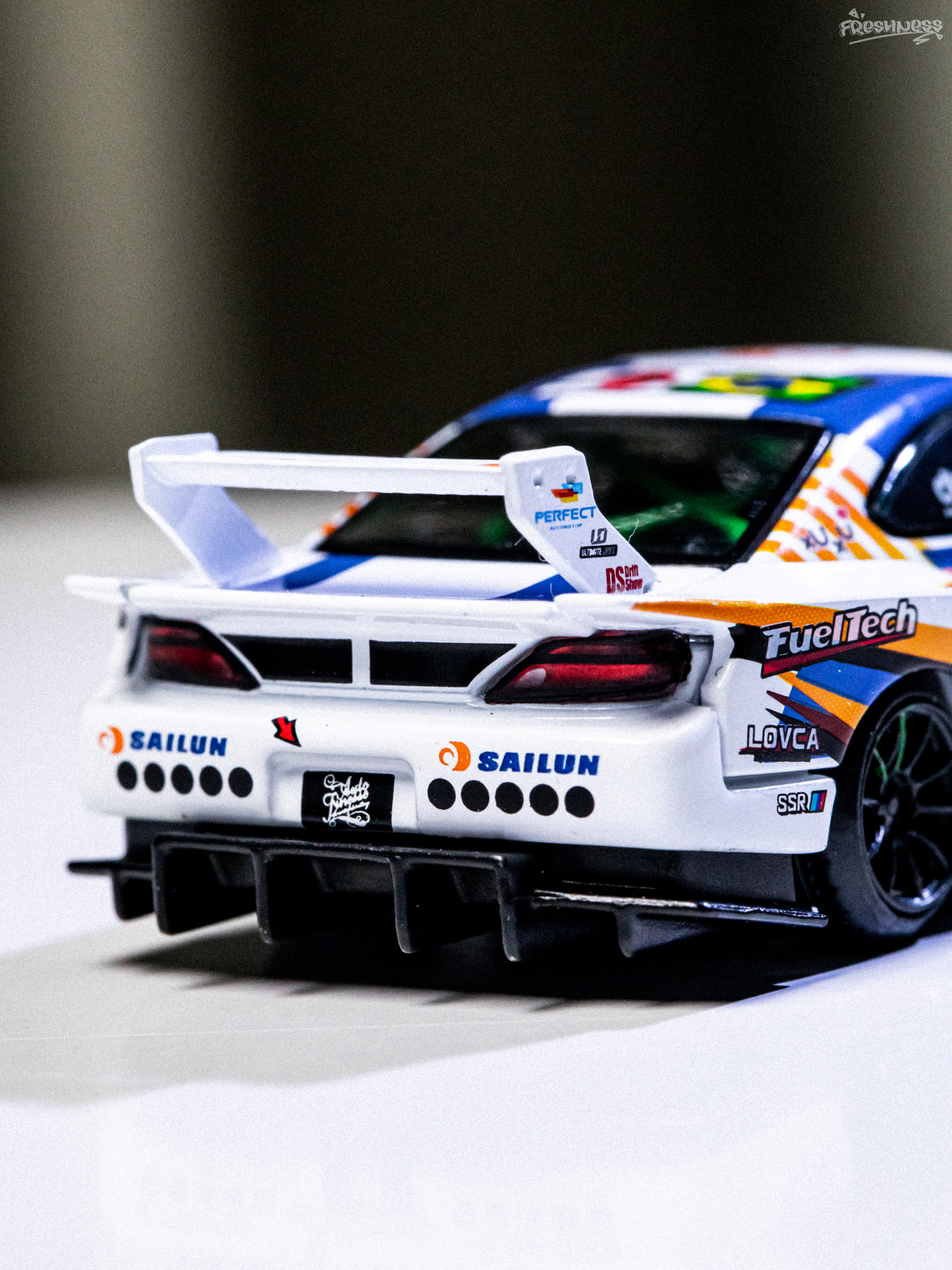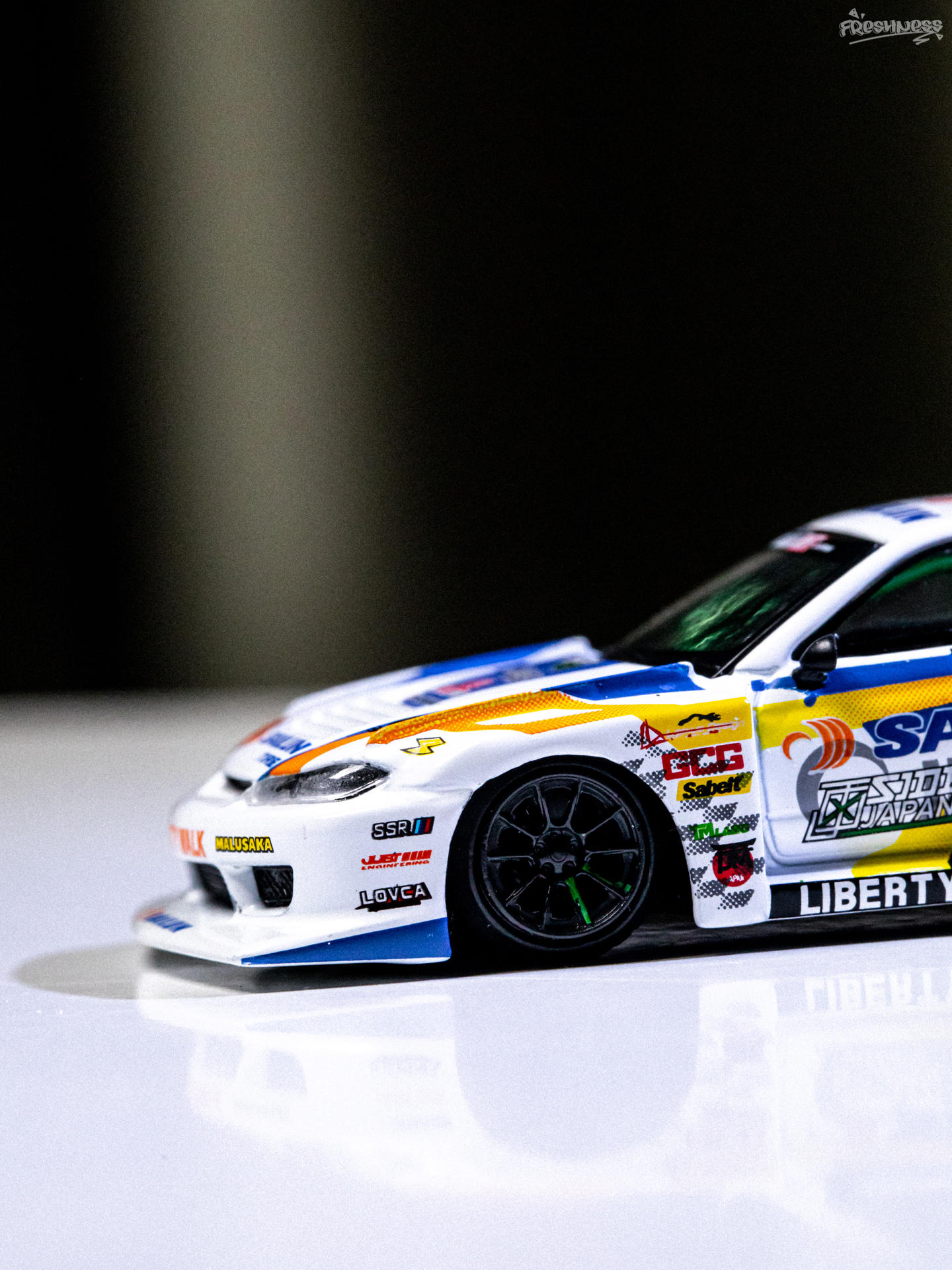 今天拍照练习的是最近入手的MINI GT的895号小车——日产NISSAN推出的SILVIA 15,是由LB改装推出的超级剪影系列,S15也是MINI GT的传奇刷色王了。超级剪影的S15我也一直在收,最近正好有刷到好价的老涂装,想想也把之前的一些还不贵的慢慢补上吧。这款赛事涂装我也是盯了挺久了,入手前就看了实车展示看着挺不错。虽然整体是采用了白色素漆,但车身上的拉花水贴看着是真好看,搭配起来真的...