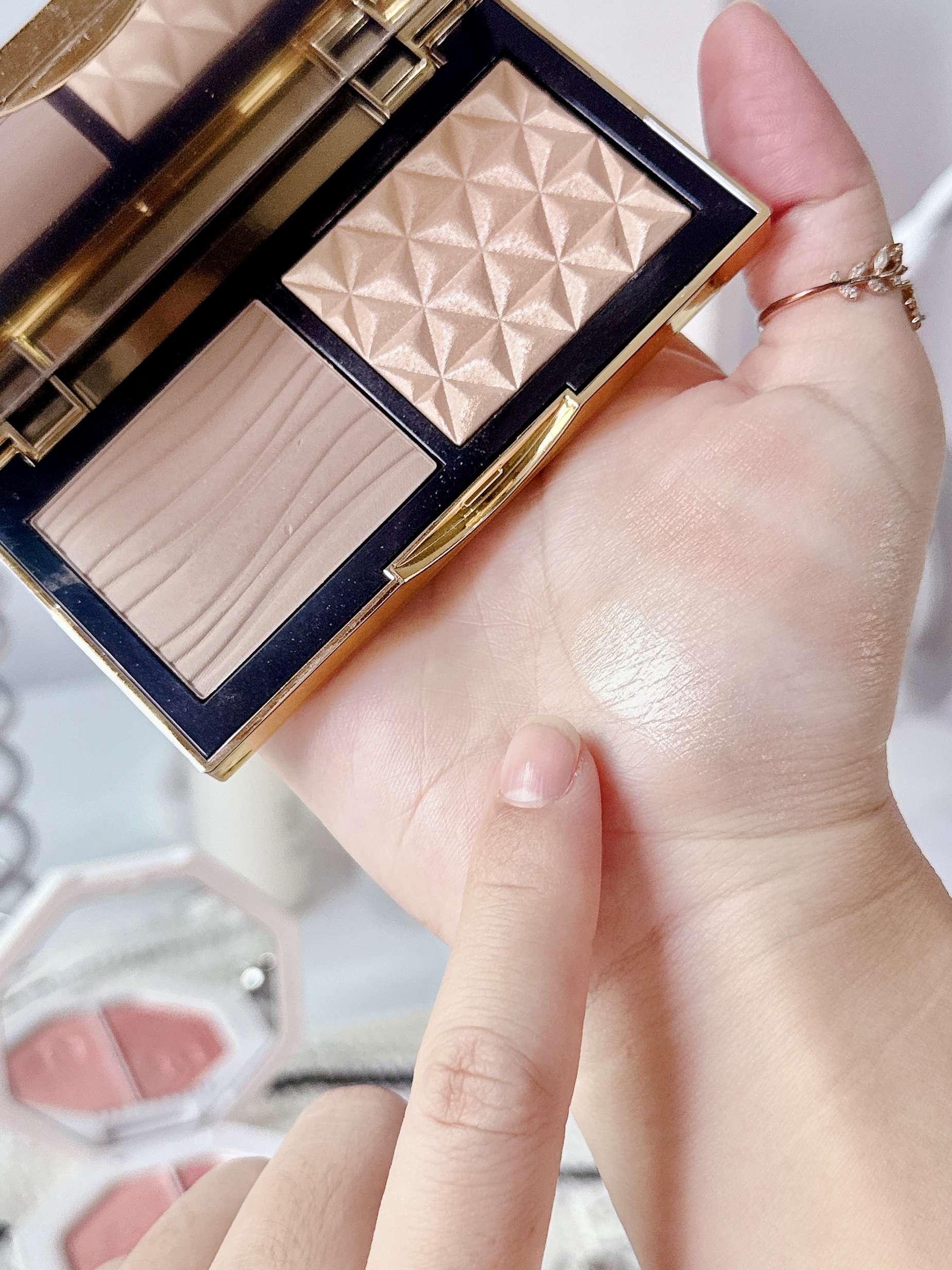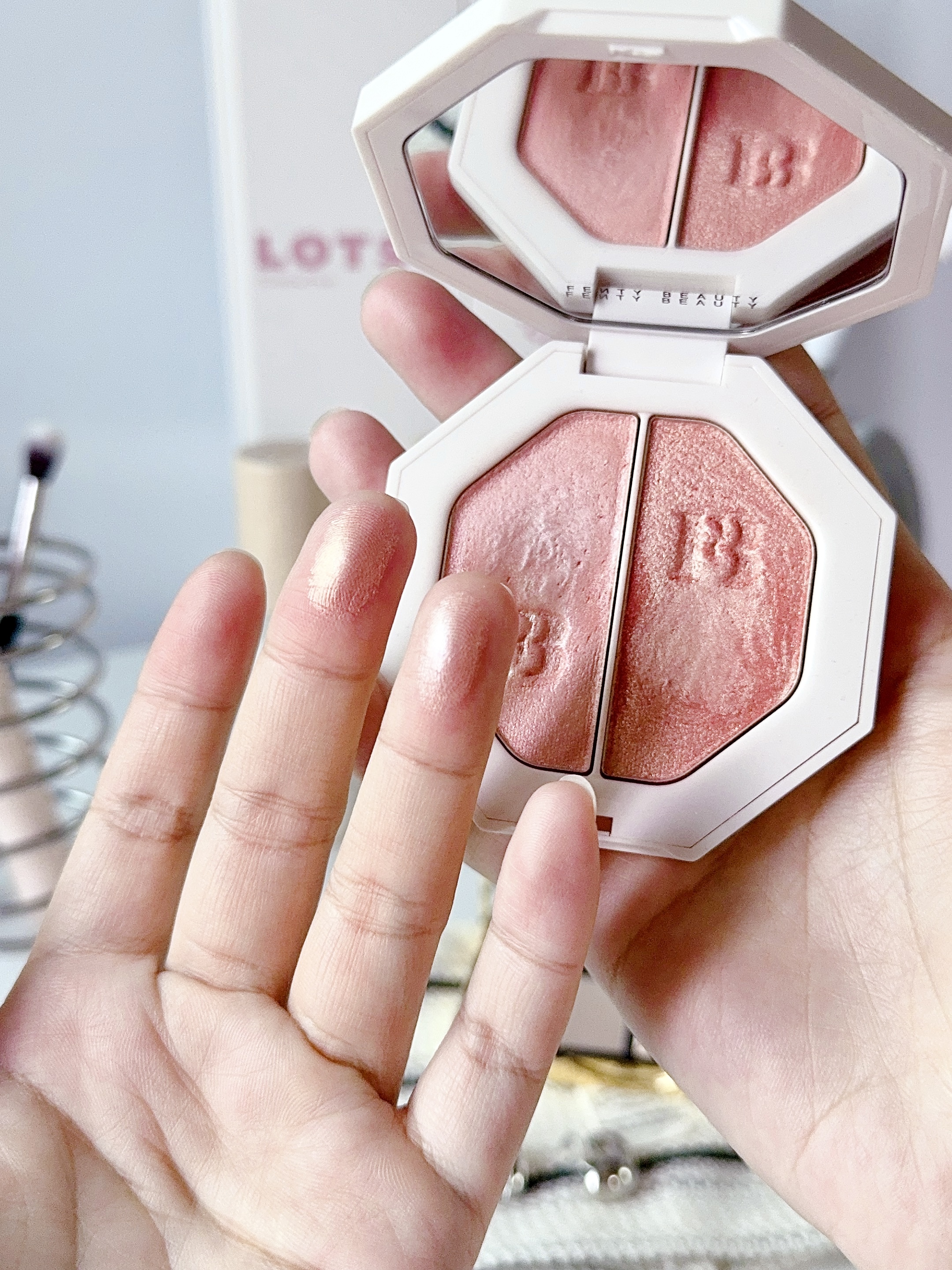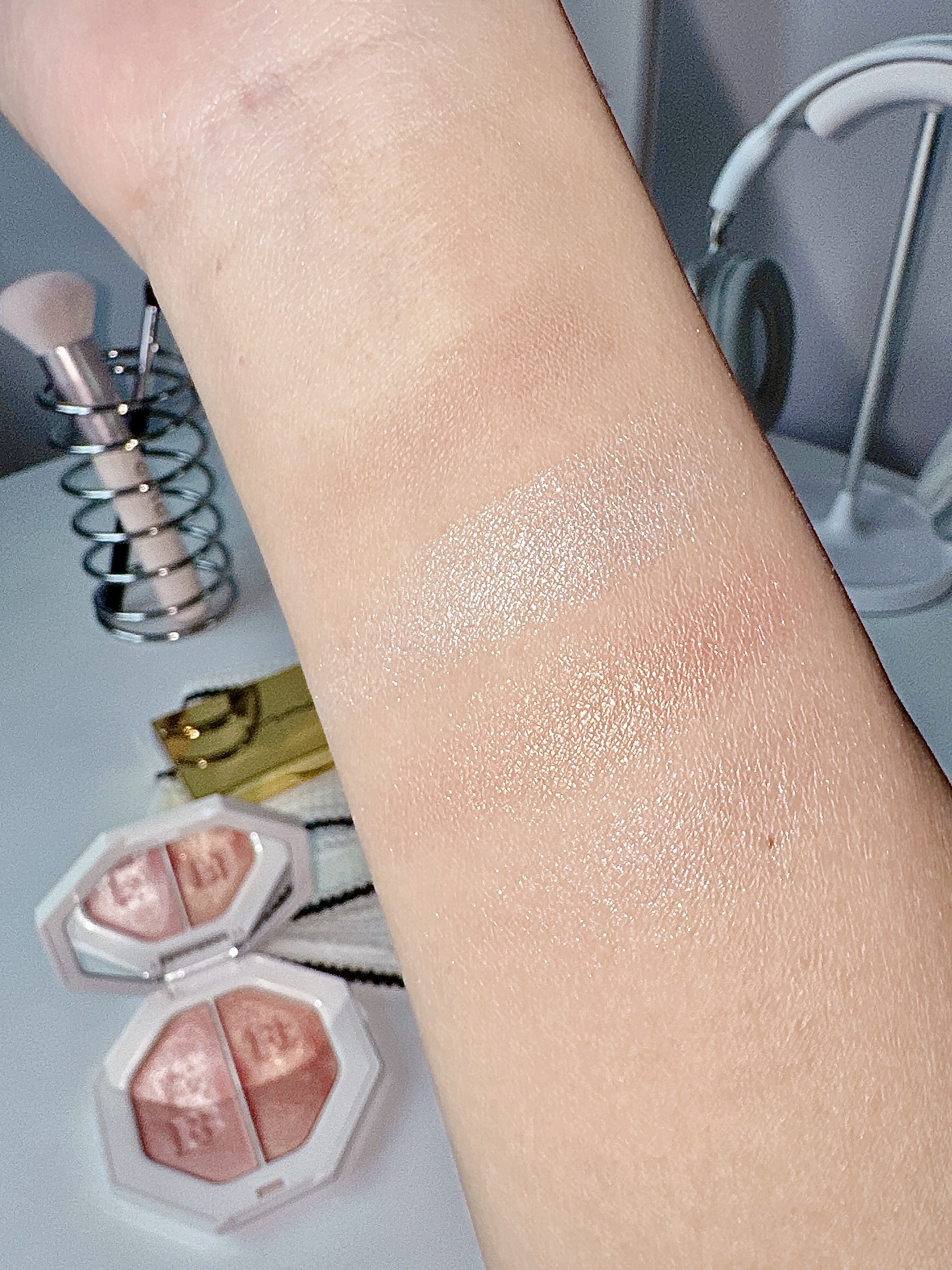 年底聚会妆容怎么化 试了这两块热门高光 给纠结的姐妹一点参考~ FENTY这块是双色电光粉饼 闪电裸桃光是暖调香槟 烈焰冰粉晶是冷调偏光 手指抹几下就很闪很亮了 粉质是明显的碎钻颗粒感 适合年会或派对这种场合 灯光下拍照真的好好看! MAC生姜高光比较日常 细腻的香槟金细闪 上脸是自然的水光肌,用着不会夸张 粉质压得很实不飞粉 怎么刷都不会显得手重~ 我一般年会用FENTY聚会用MAC高光 你们更...