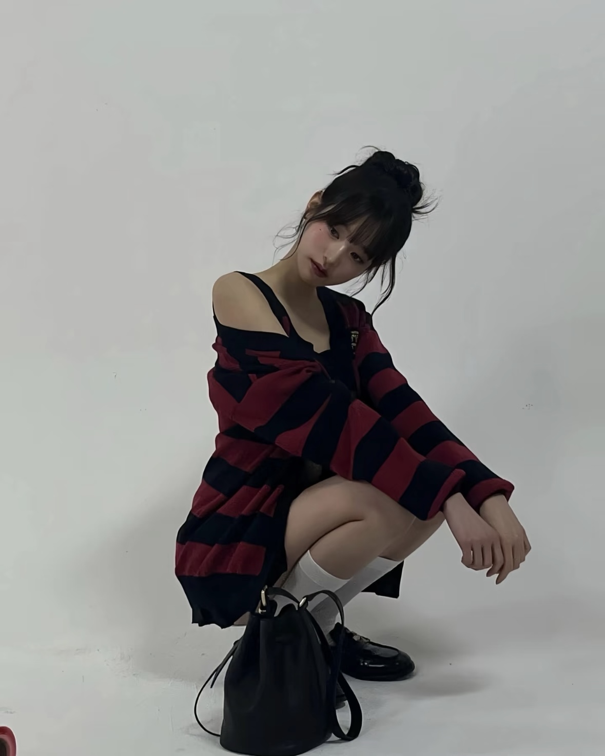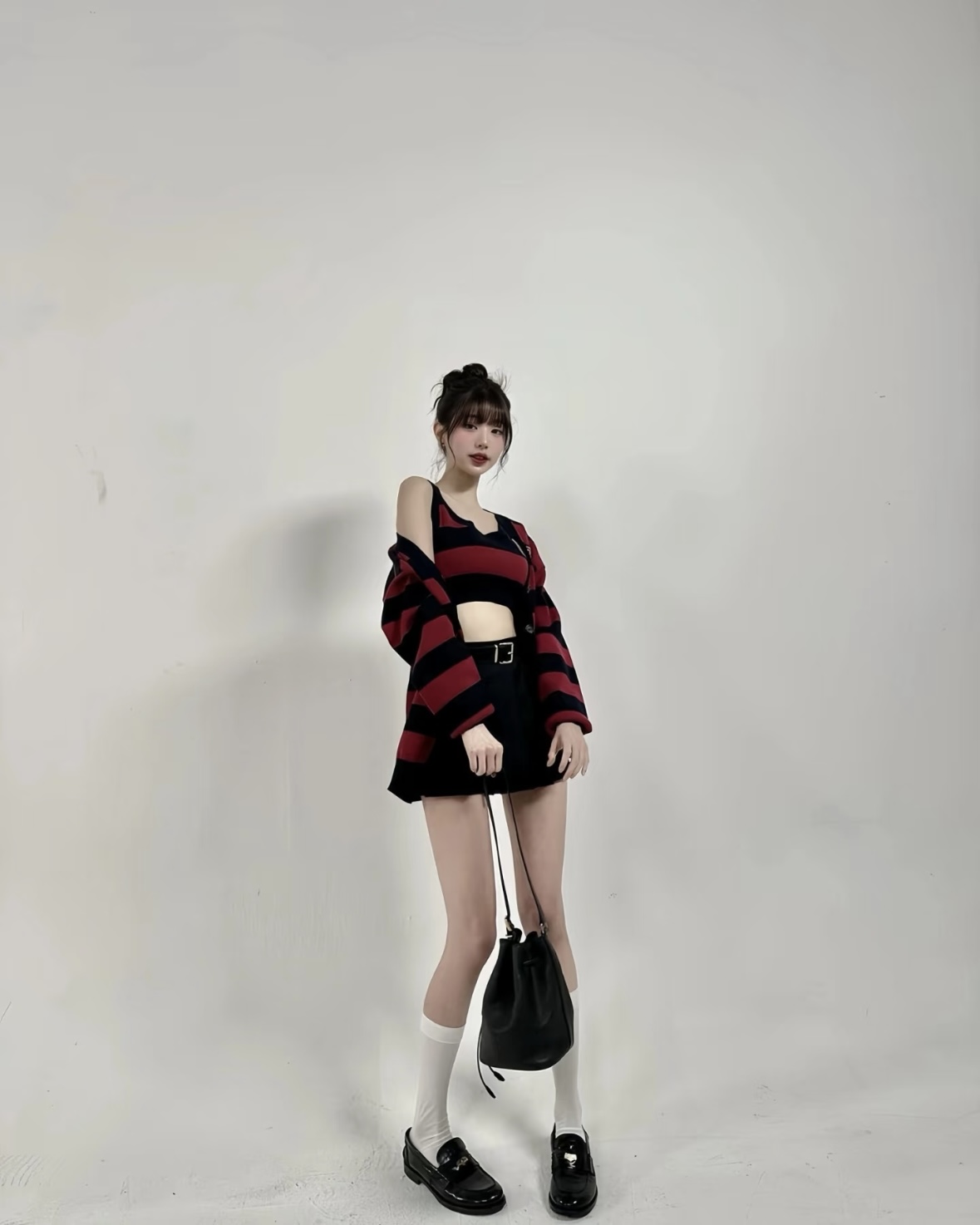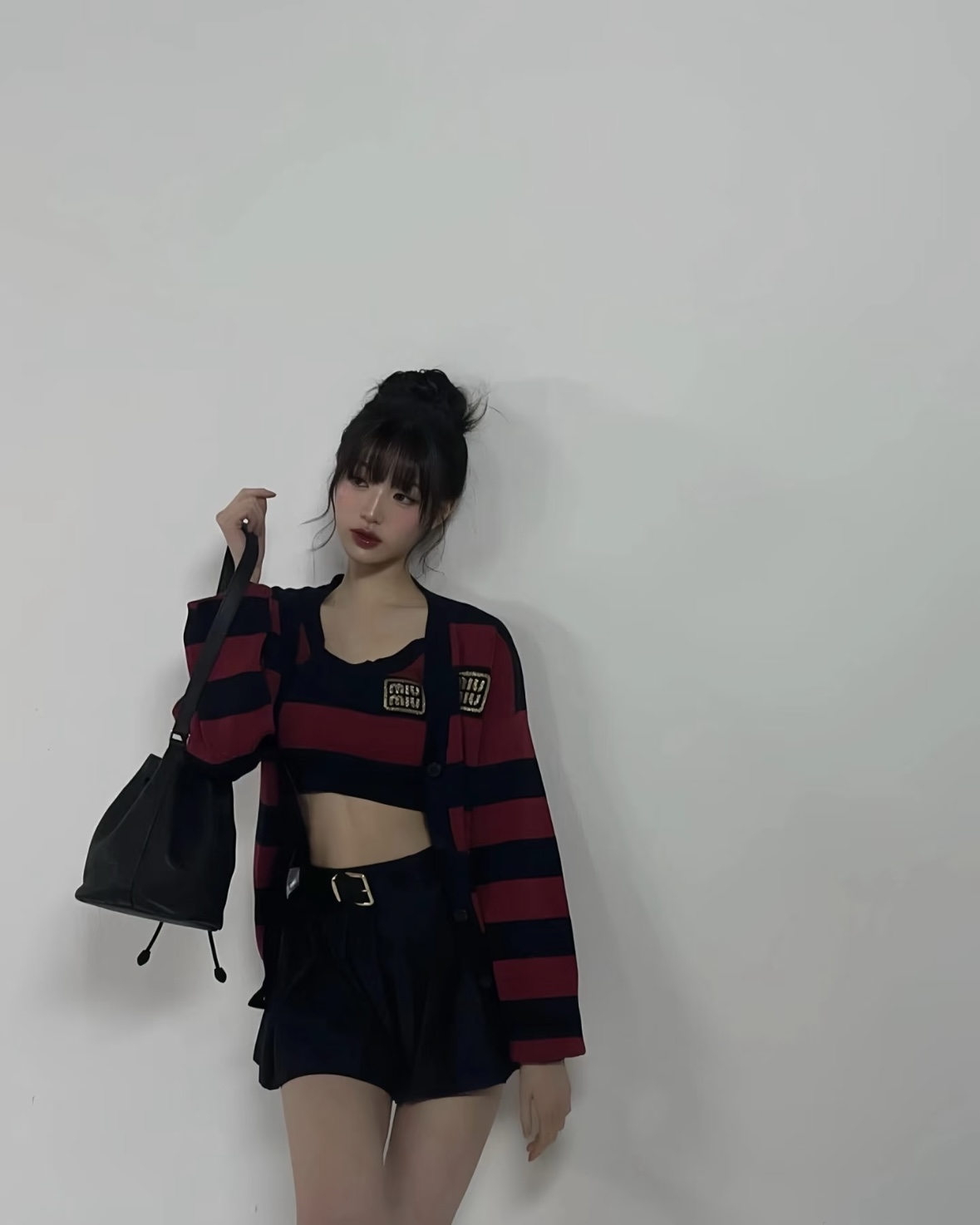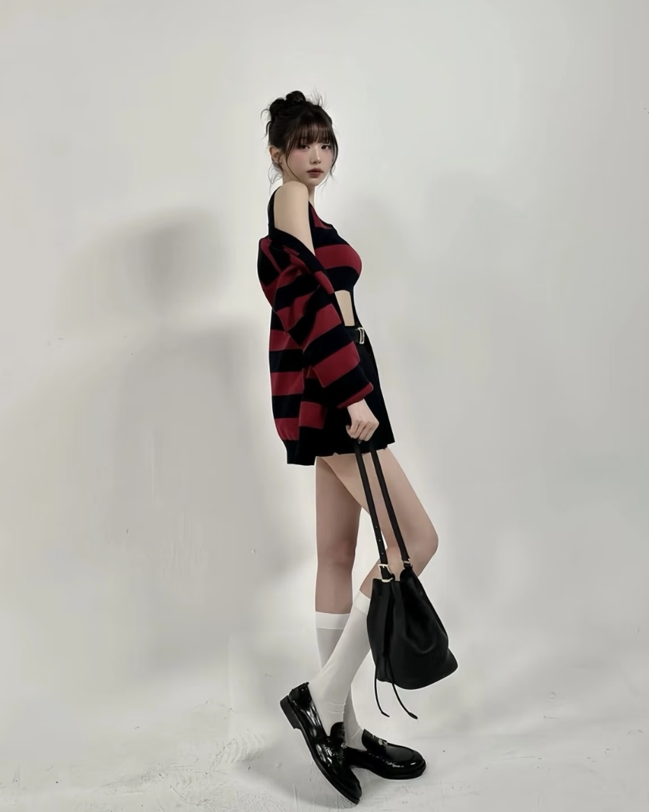 宝子们,谁懂啊!张元英这套红黑条纹穿搭直接把甜酷学院风焊在了身上✨ 宽松针织开衫叠穿短款背心,露腰设计又纯又欲,下搭百褶裙和乐福鞋,一整个青春活力美少女既视感! 红黑配色经典又吸睛,慵懒中带着小性感,不管是上学还是和朋友出街都超合适~ 水桶包一挎,氛围感直接拉满,谁穿谁是人间芭比! 💡 穿搭小Tips: • 叠穿是精髓,背心+开衫的组合显瘦又有层次 • 百褶裙+长白袜+乐福鞋,完美复刻元气...