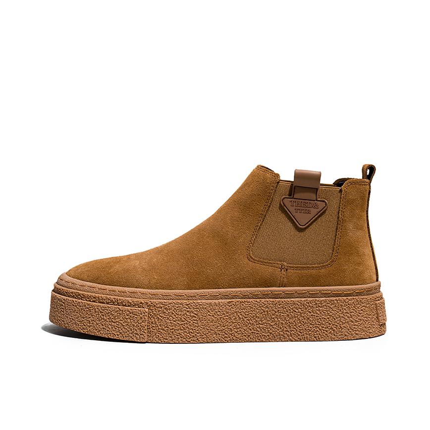 焦糖色切尔西靴太好看了! 牛反绒面料软乎乎 脚感柔软舒适 厚底还能悄悄增高 一脚蹬的设计很方便脱穿 省去了系鞋带的烦恼搭配休闲裤+姜黄夹克 上下呼应 痞帅感拉满 宽松的版型 简约不失层次感 和今天这套很适配哦 轻松帅气出门吧!