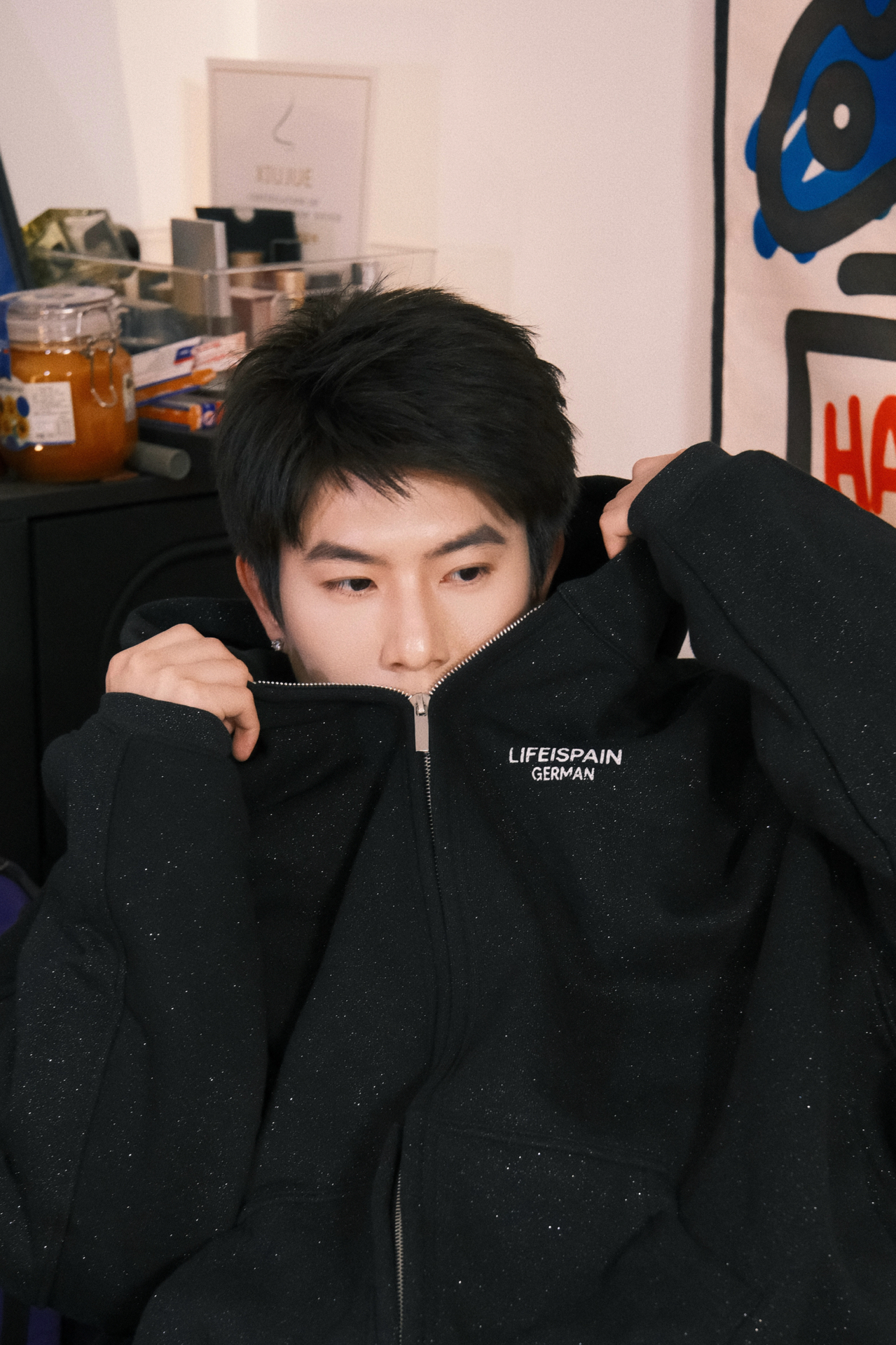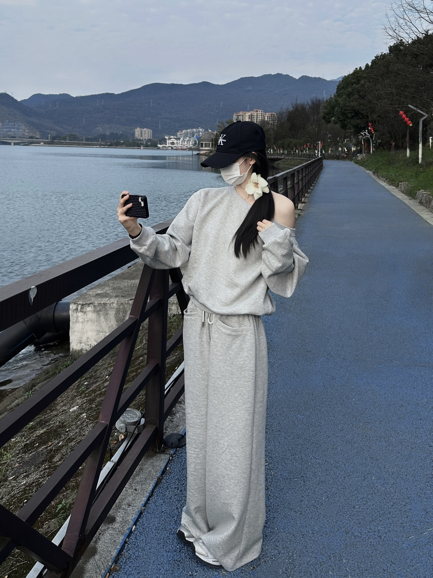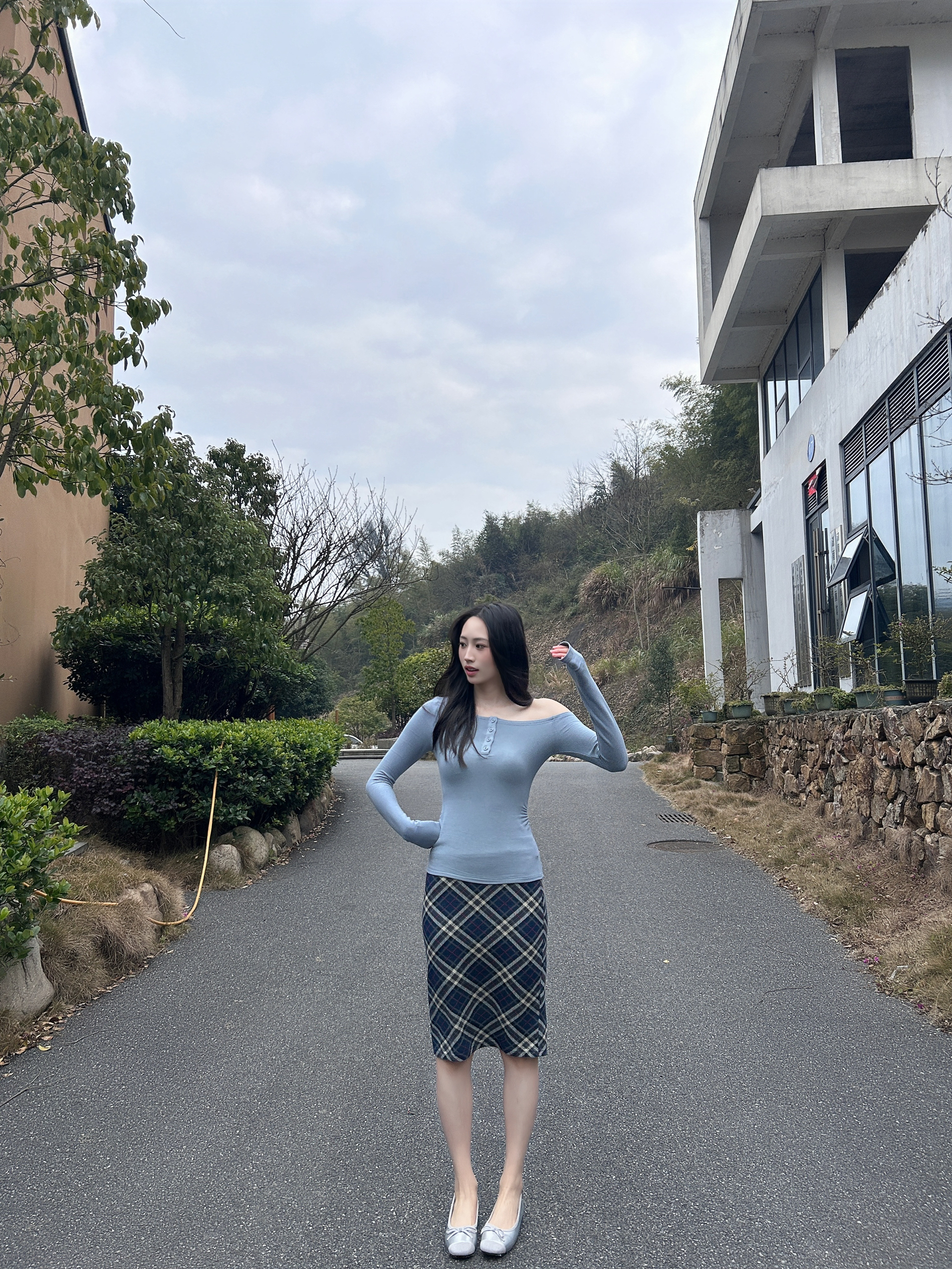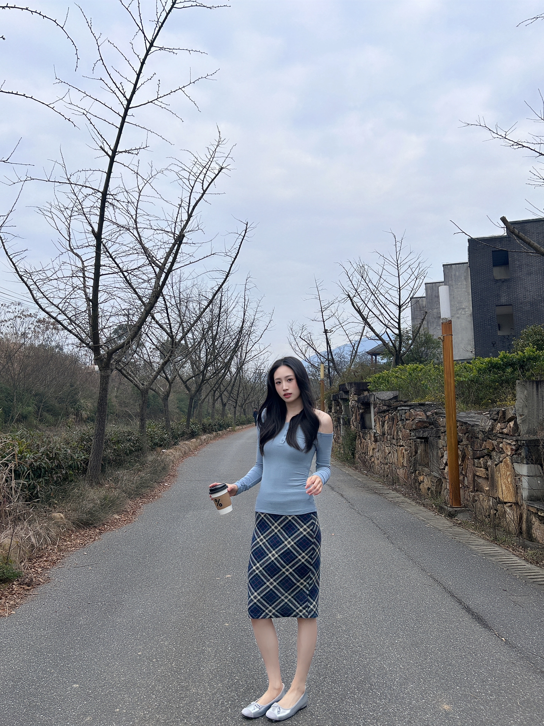 160/84数据参考 上身是一件斜肩的蓝色半开领打底衫,下半身搭配了一个很特别的蓝色格子,带点秋冬的复古,配上元气的蓝 特别吸睛波浪的卷发给整套穿搭增添了温柔的氛围!