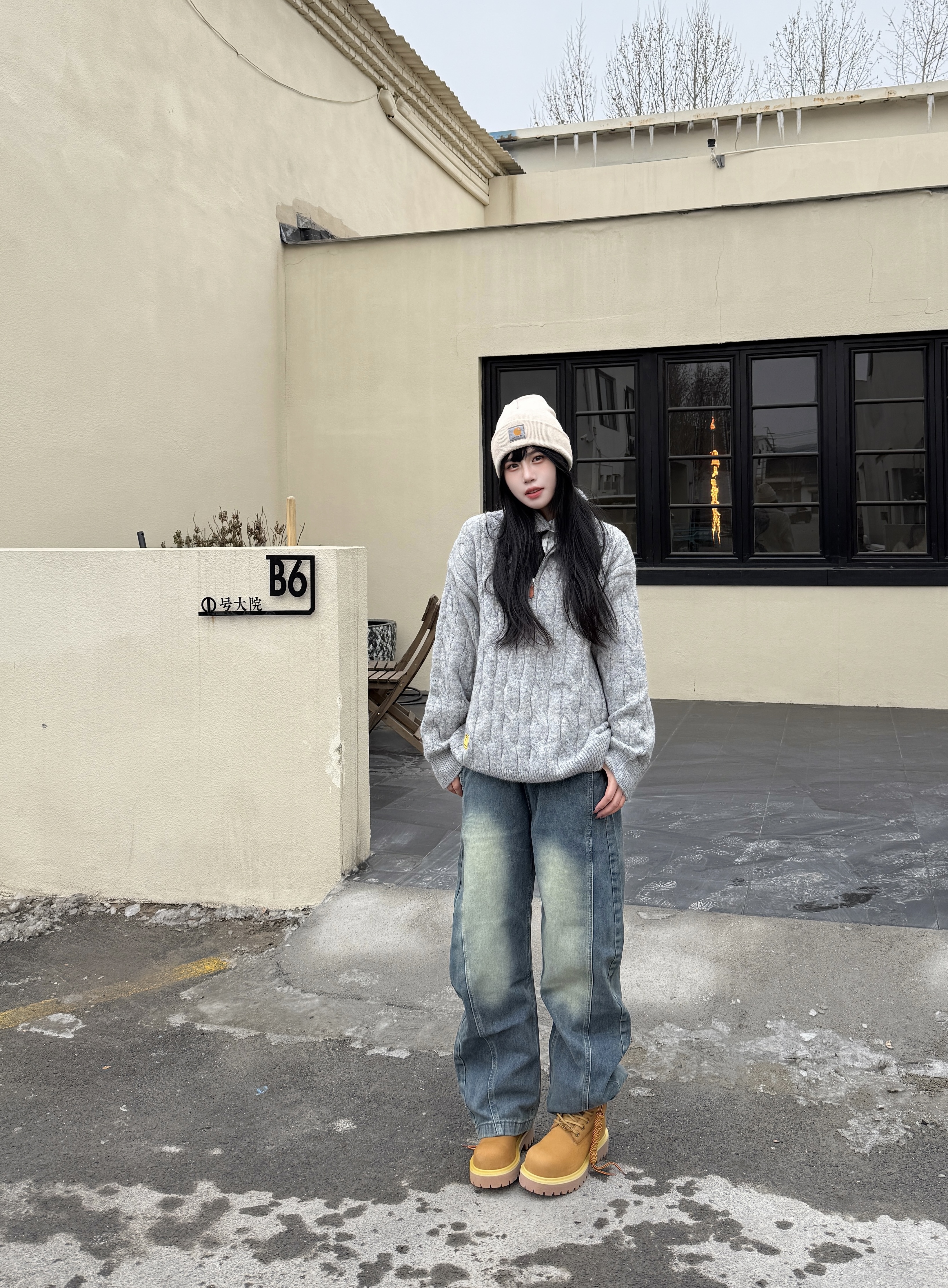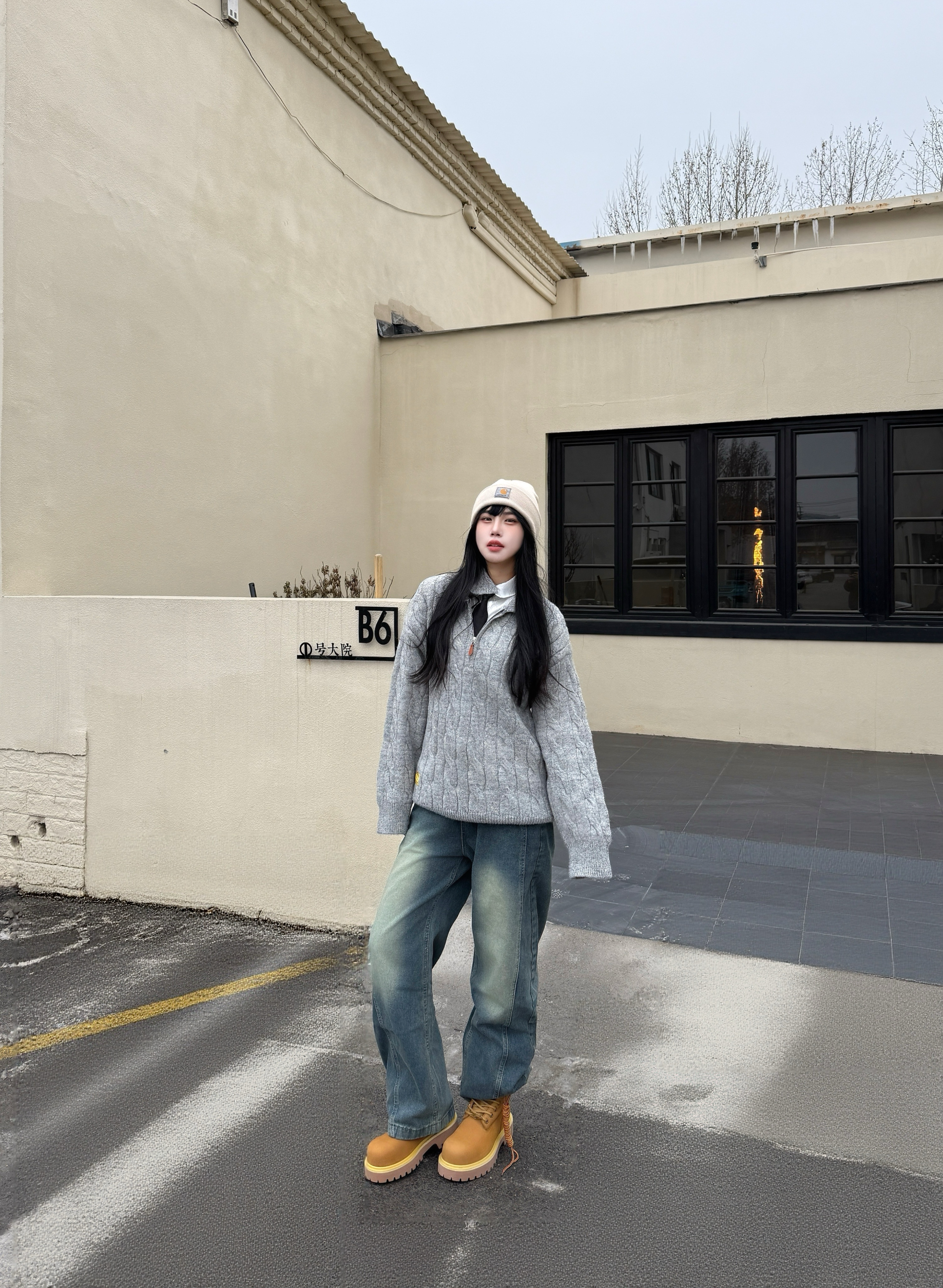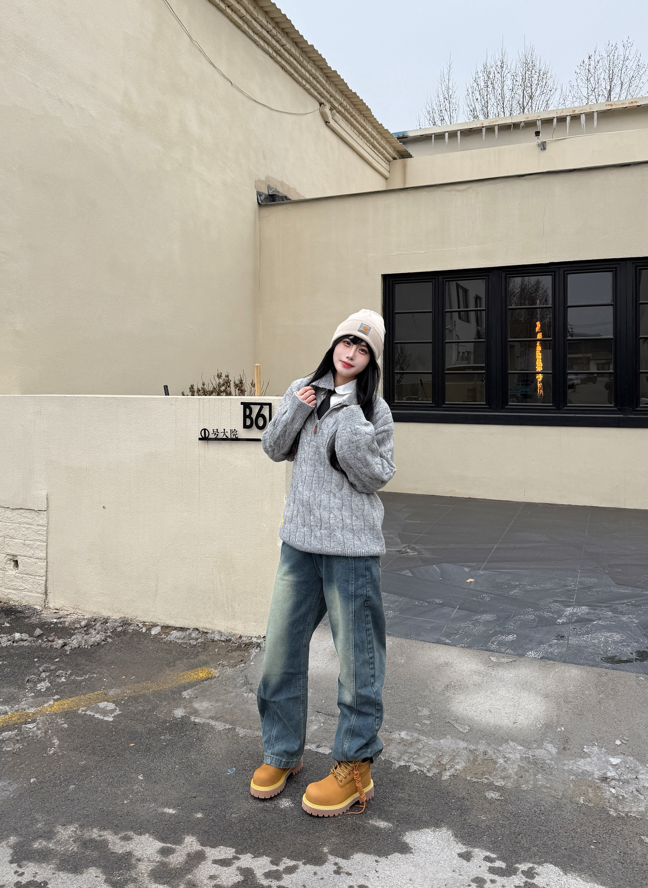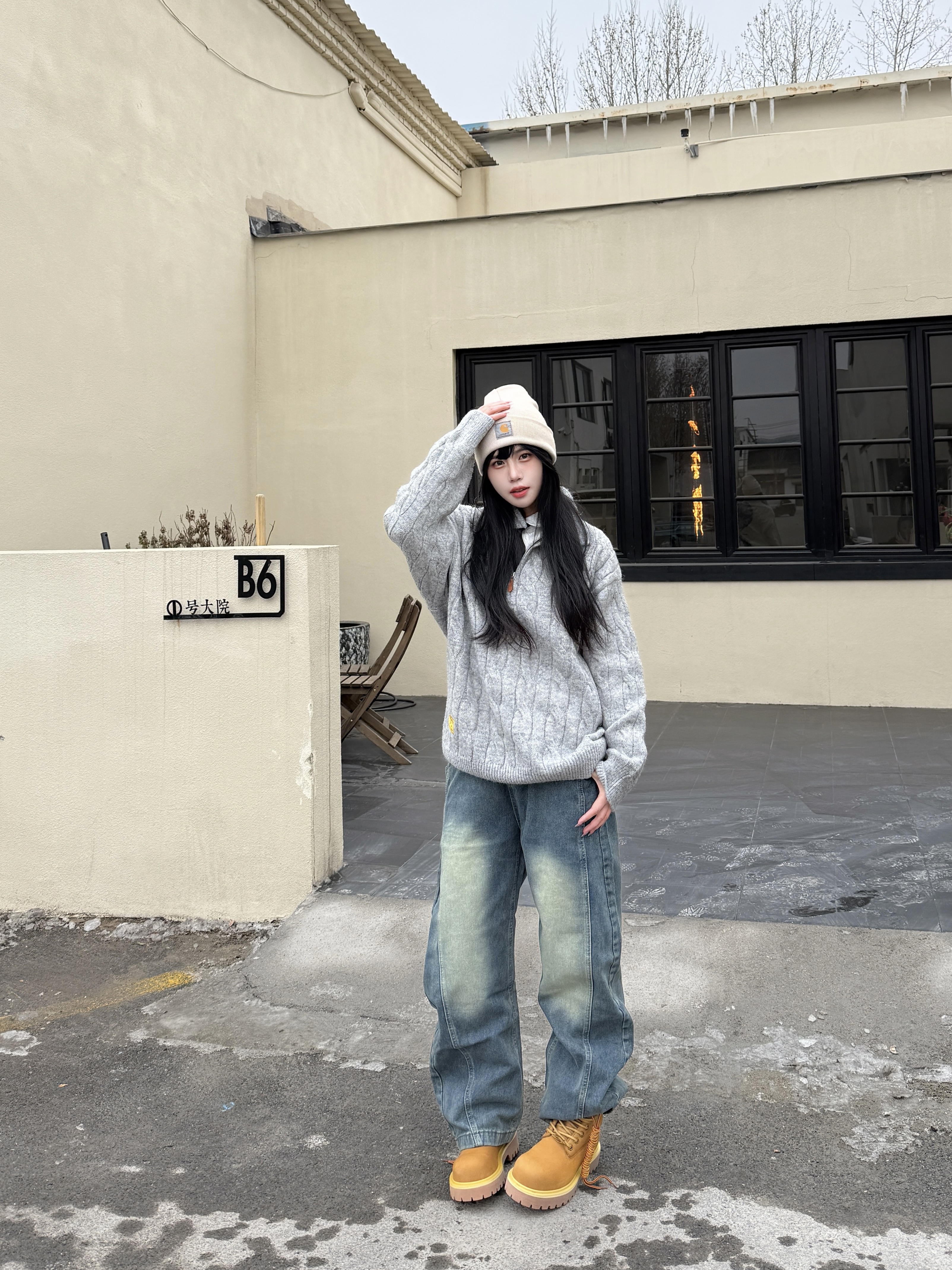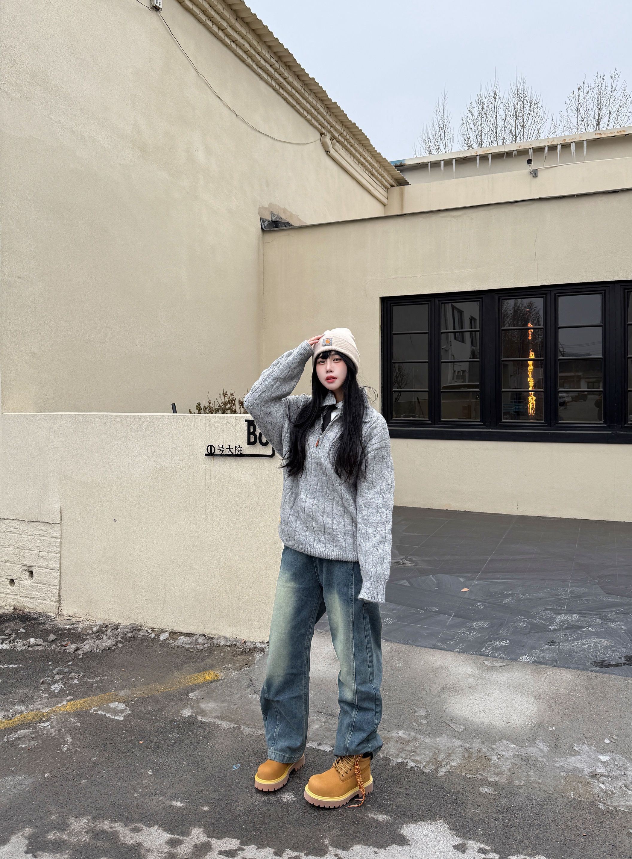 LOOK一下我的新年出街潮搭 内搭穿了一件白色衬衫➕黑色👔 灰色麻花钩织毛衣搭配慵懒感满满 再配上的 XFKN 牛仔弯刀裤 一整个潮流感满满的街头感 再穿上一双复古时尚感大黄靴 整体搭配青春活力保暖 最后戴一个冷帽增加氛围感