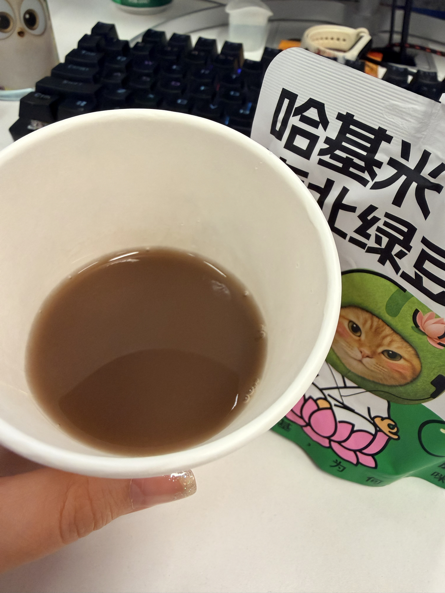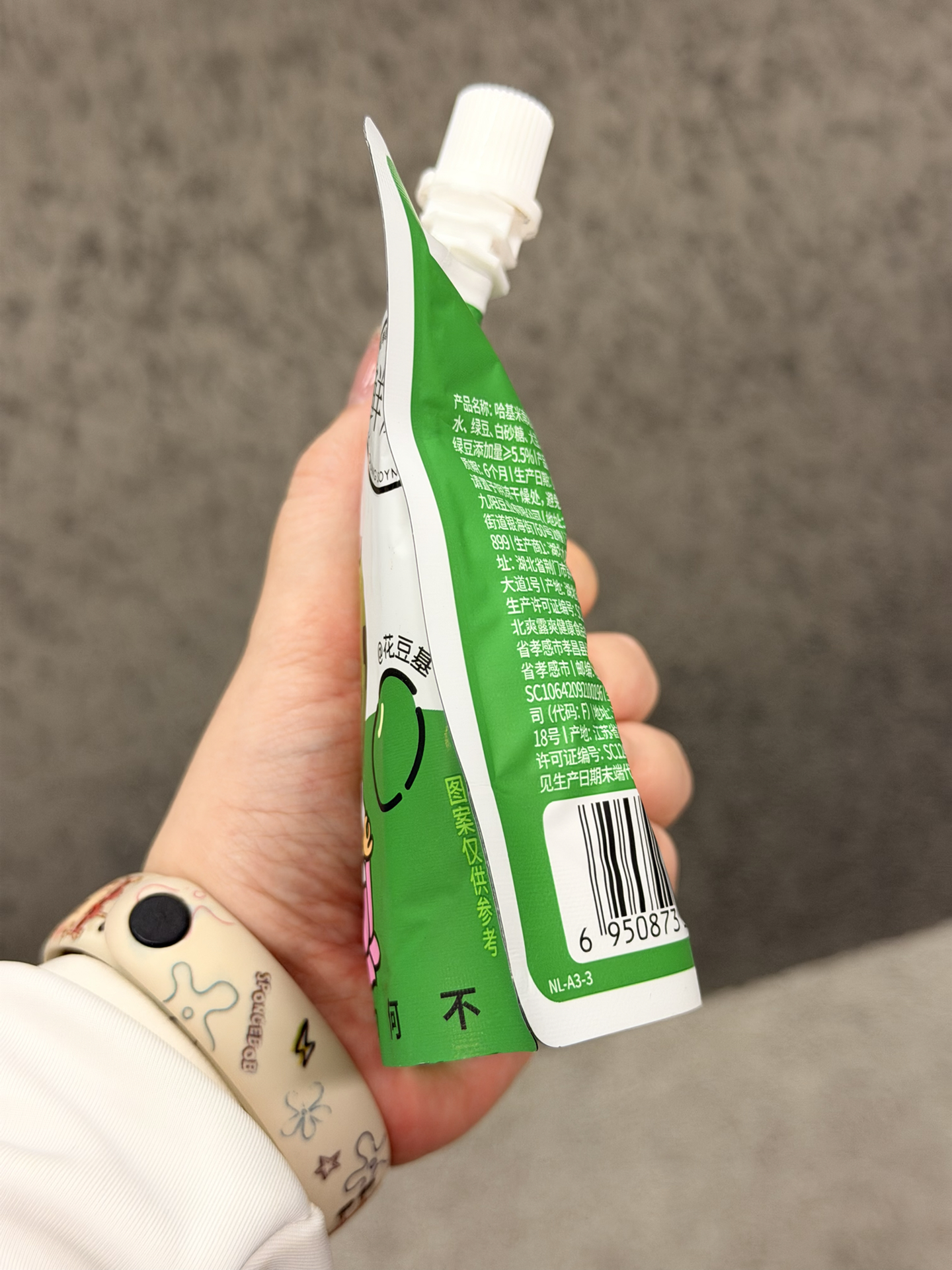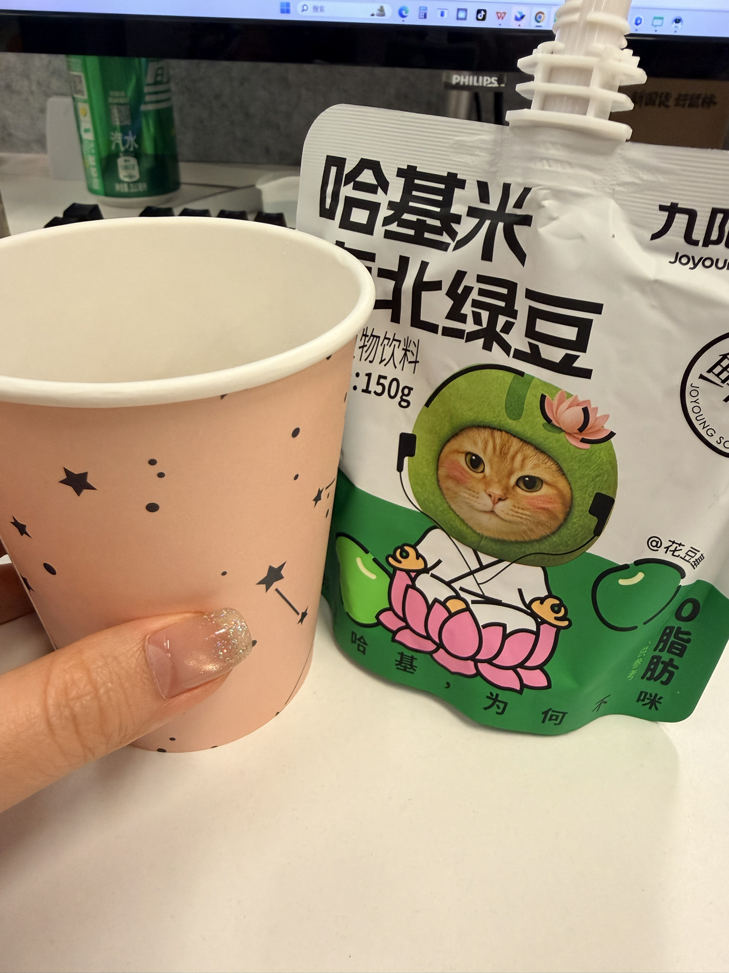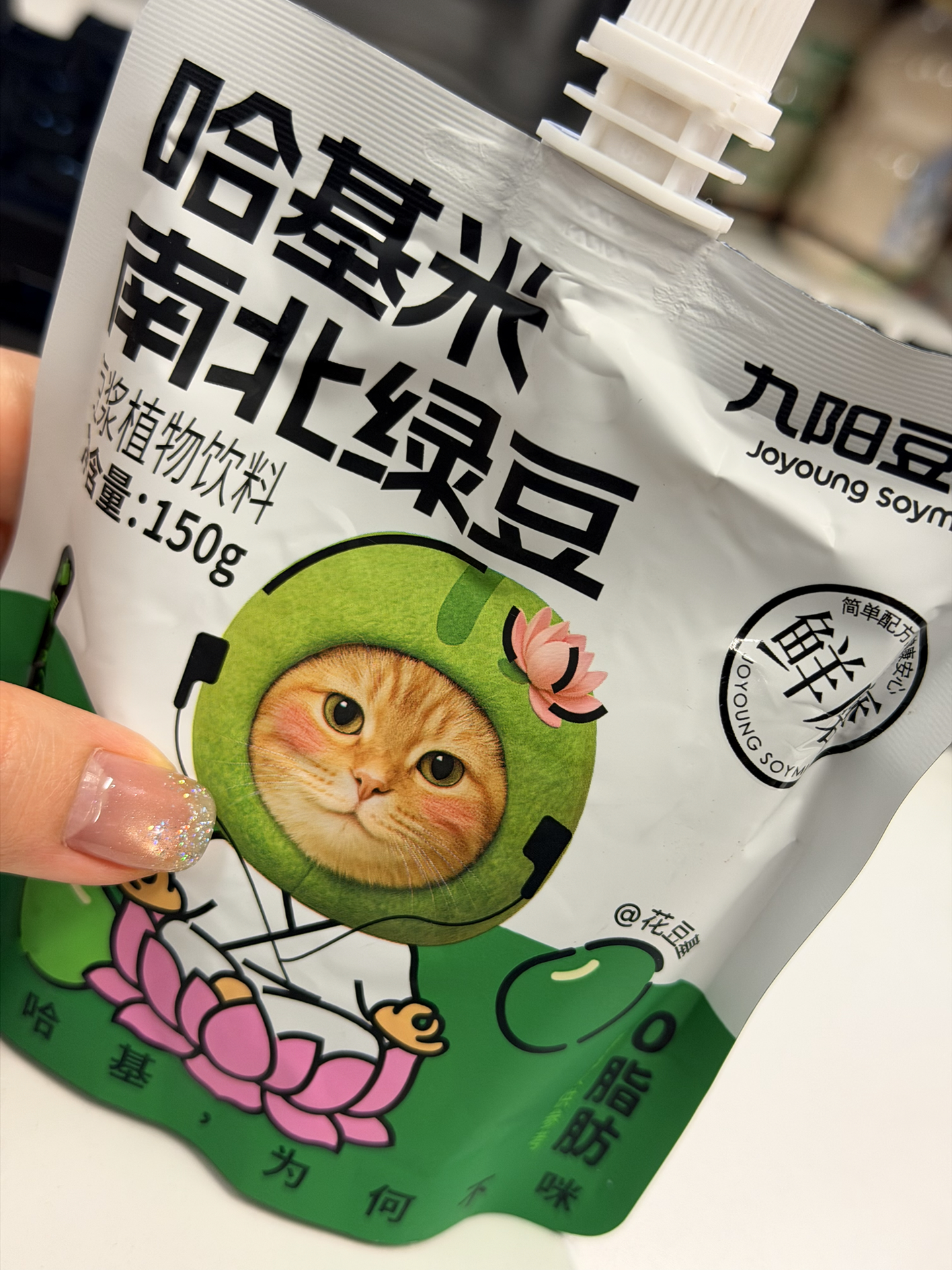 我挖到款有意思的绿豆味饮品!它是九阳的哈基米南北绿豆豆浆,一袋150g,热量低,减脂期能喝~口感上没有糖水那种豆渣沙沙感,也没那么甜,我喝着有广东绿豆糖水那味,不过同事觉得不好喝,口味这东西还得自己尝~