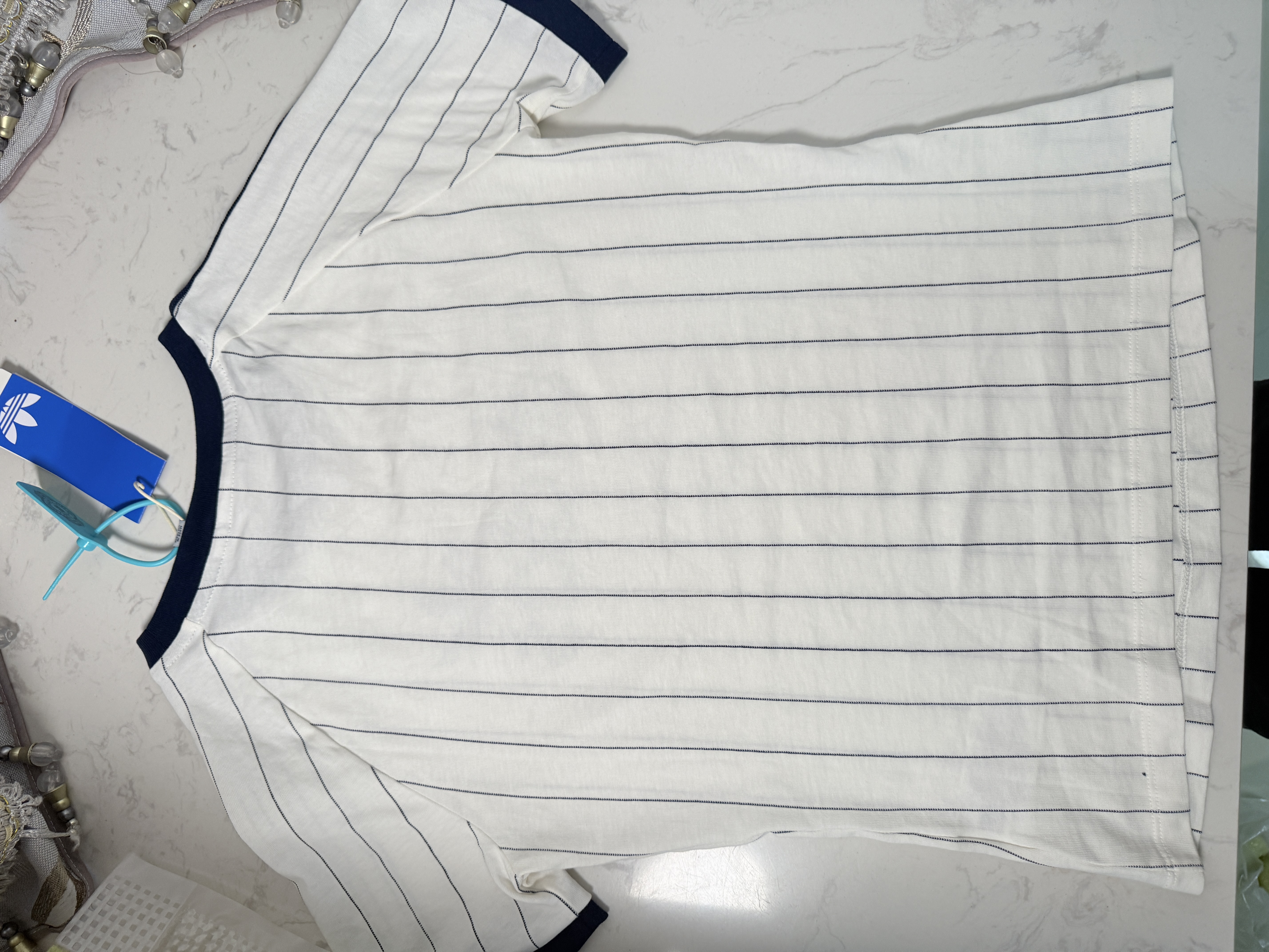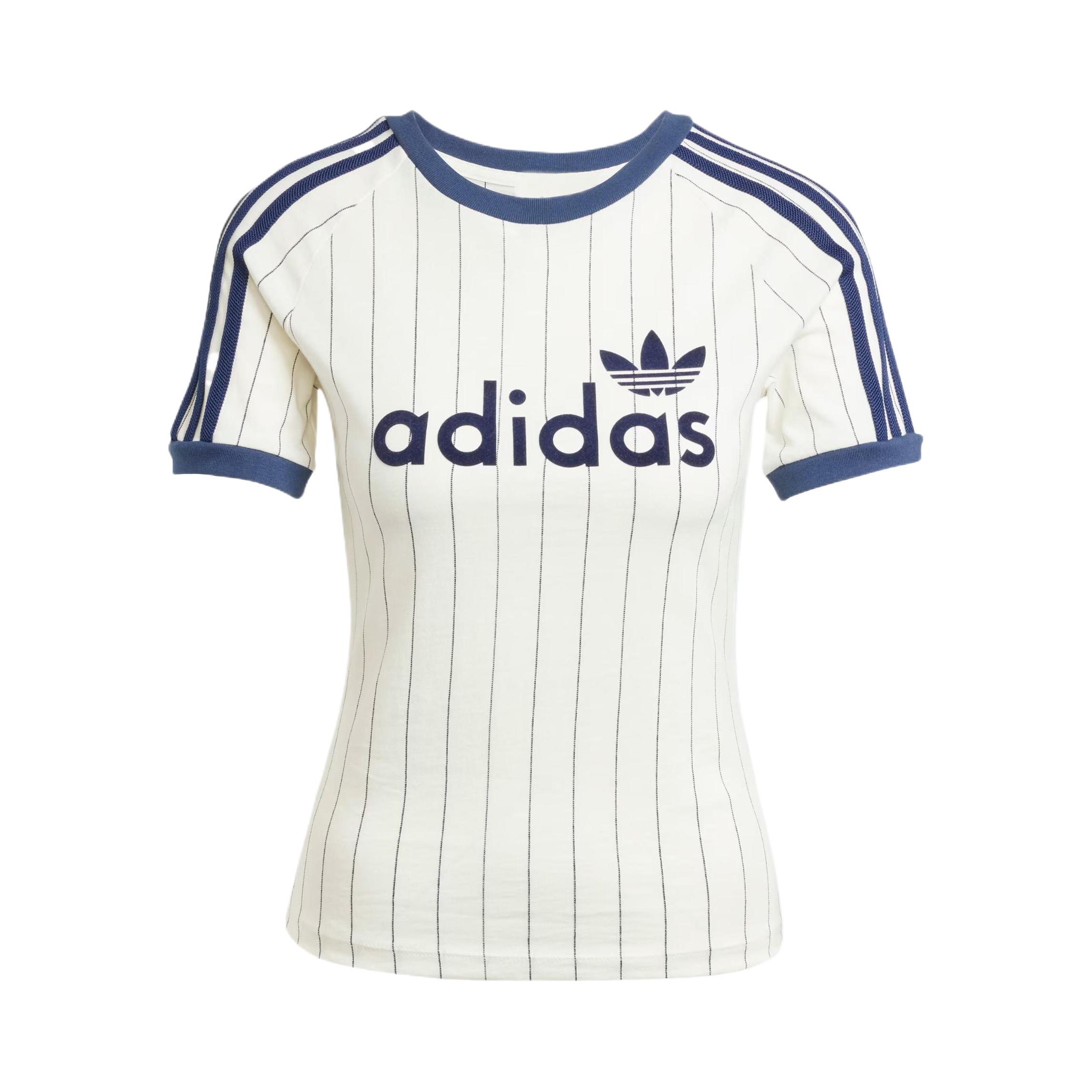 谁懂啊!这件三叶草条纹短袖直接把复古辣妹风焊在身上了✨ 藏蓝撞白的竖条纹自带显瘦buff,圆领+三条杠细节狠狠戳中复古DNA 胸前的印花带点小俏皮,紧身版型把腰臀比掐得刚刚好,搭低腰裤或百褶裙都超绝 软乎乎的棉感贴身穿巨舒服,夏天单穿、秋天叠穿都百搭