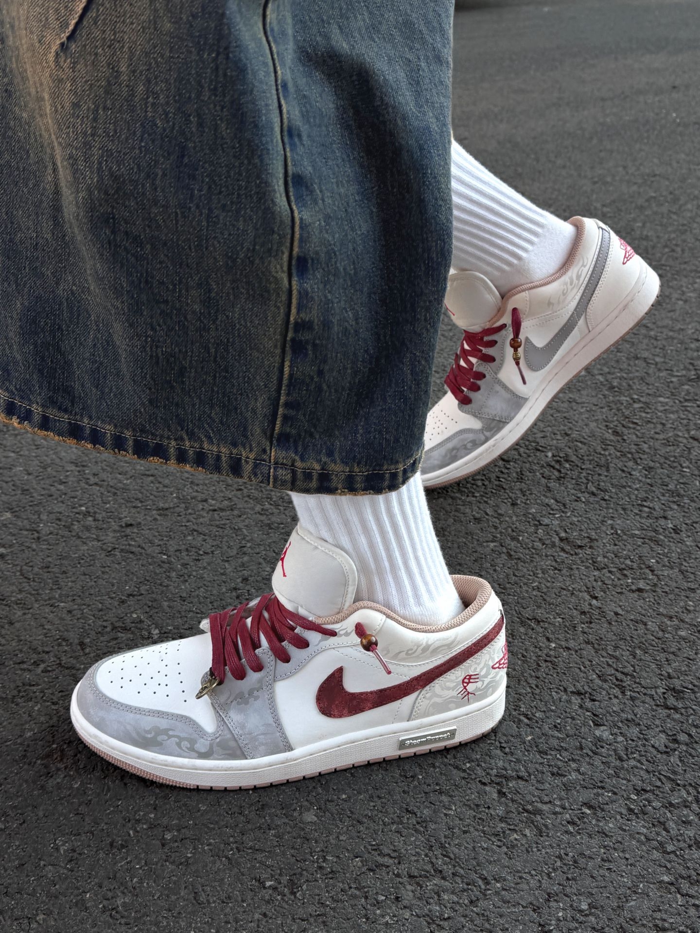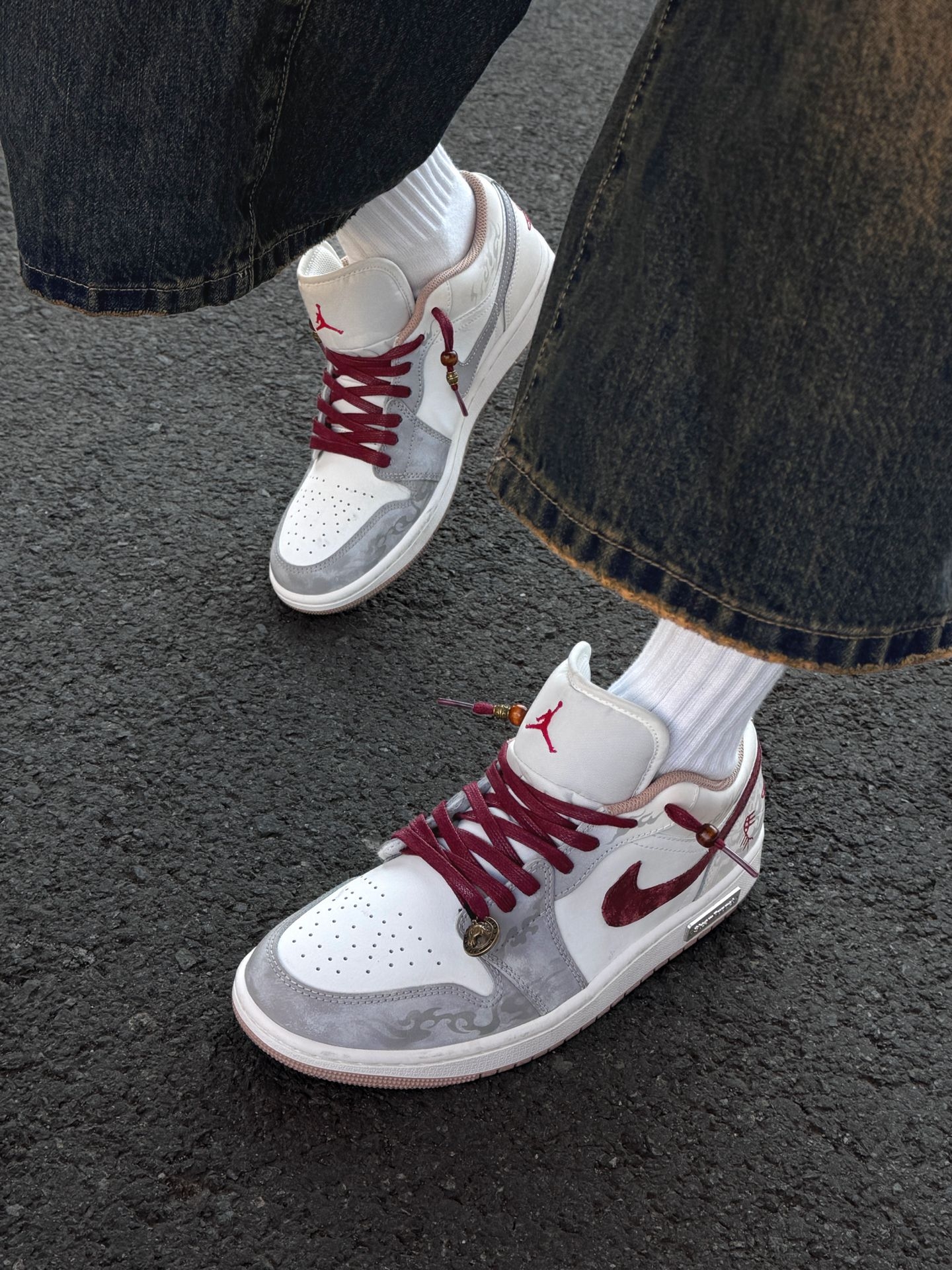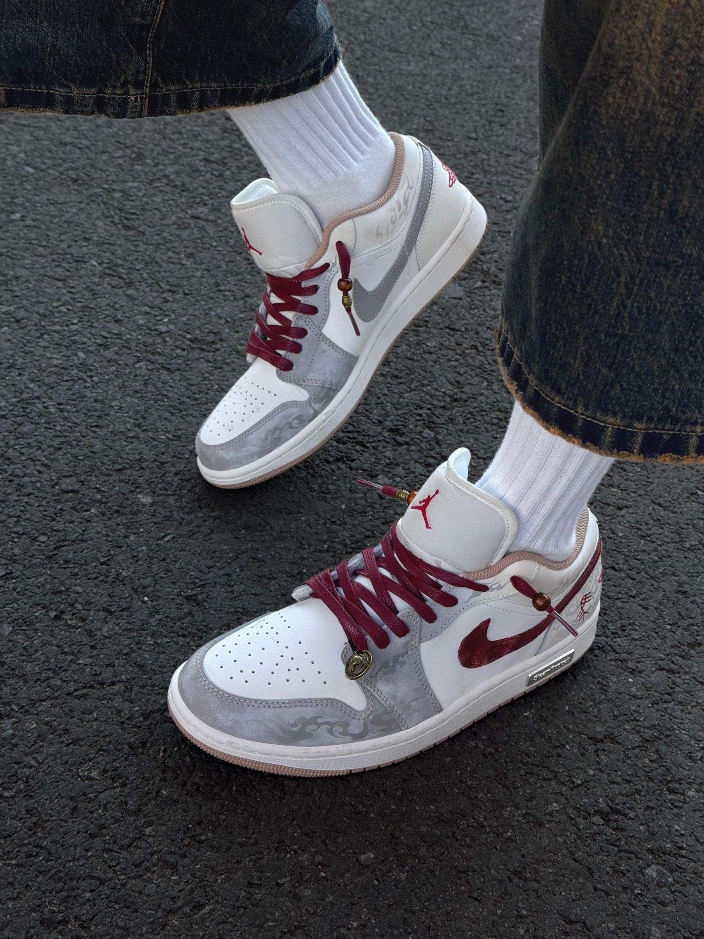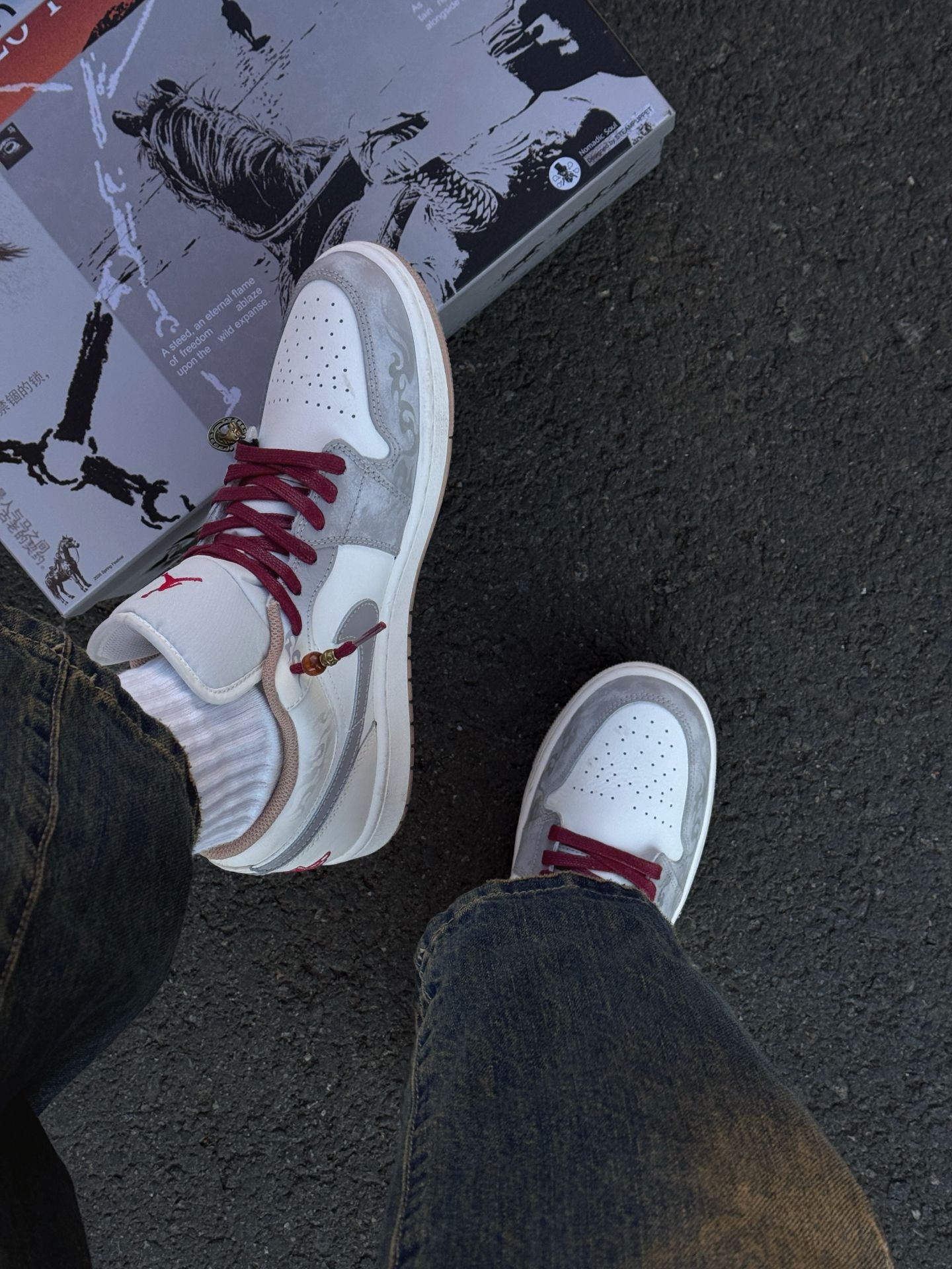 介双马年CNY限定配色也泰帅啦!上脚就是满满的少年感 外侧的酒红钩敲吸睛点缀,搭配上鞋身白灰主色看着更加协调一些 鞋面上的手绘花纹也好个性别致 上脚的脚感也很舒适,属于这种韧弹的脚感 通勤走一天路都没有觉得累 个人感觉平时搭配牛仔裤或者工装裤更帅气一些~