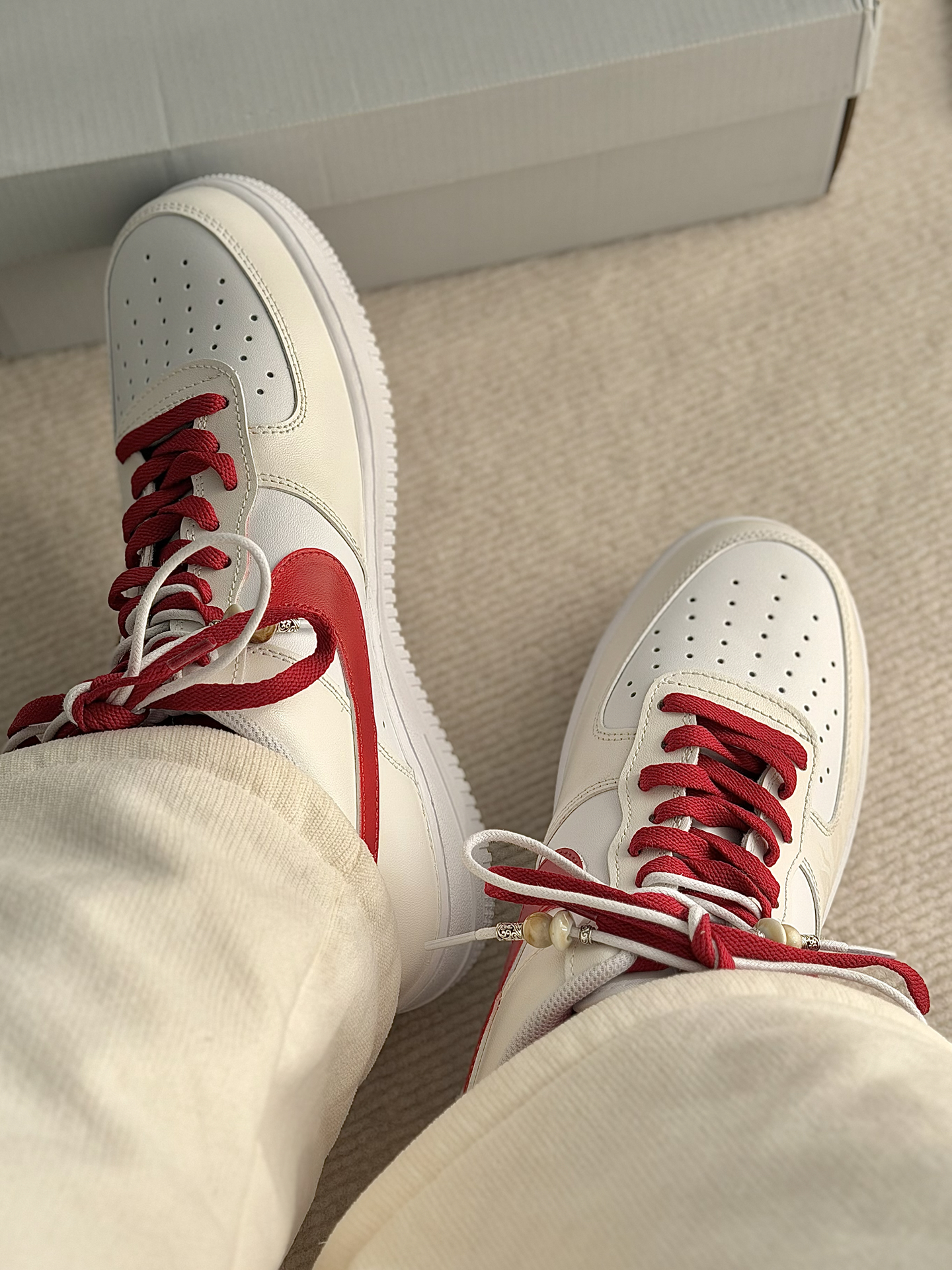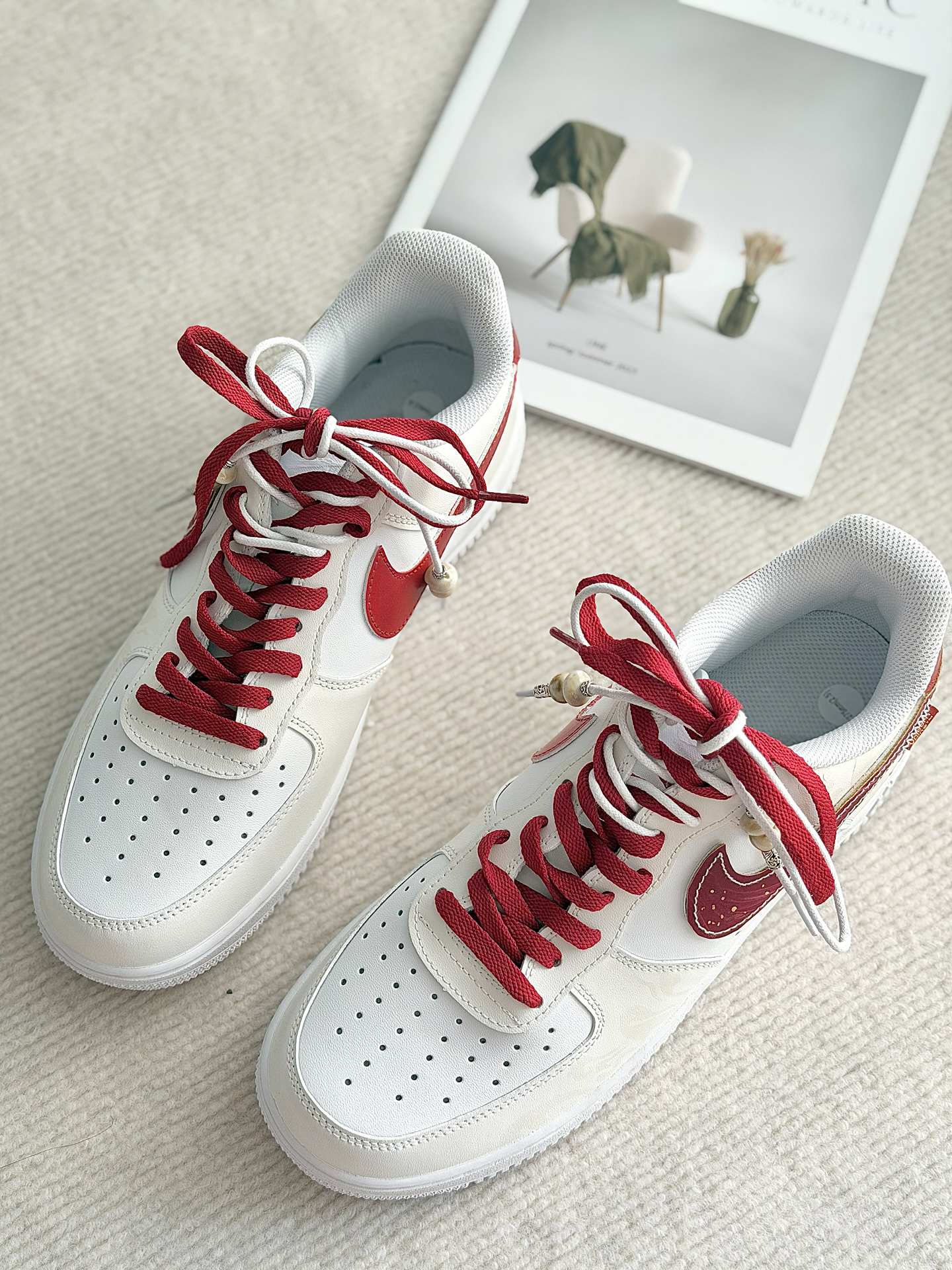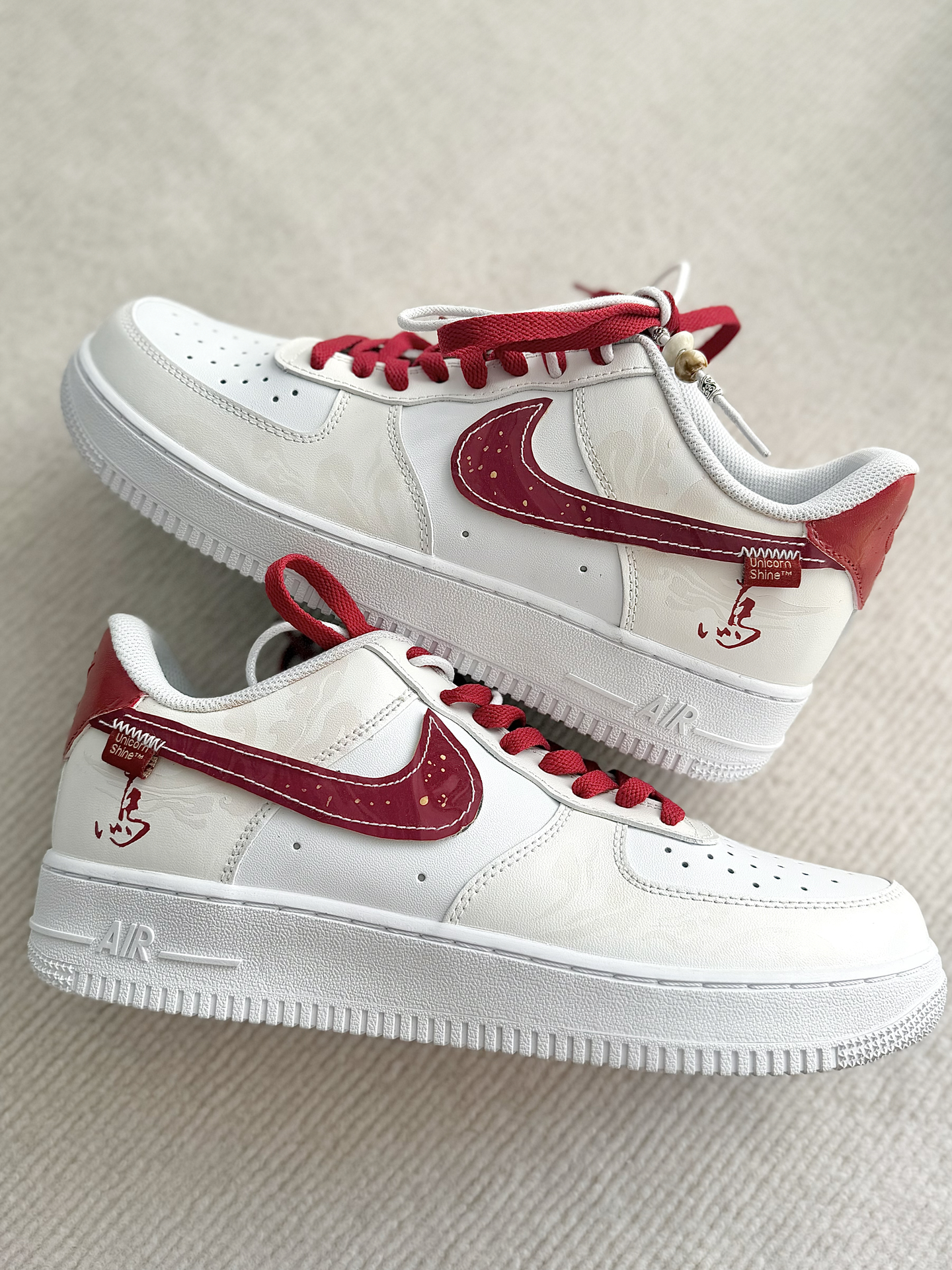 这双定制款马年限定的AF1米红 白红的配色看上去很喜庆 适合在过新年的时候穿着 米白色的鞋面上有云纹的图案 鞋面之上有马的汉字 马年限定的身份直接拉满啦 鞋带加上了珠子的点缀 看上去高级感十足 这双鞋子搭配牛仔裤 卫裤 我觉得都很好看的! #马年限定穿这双 #当我以为穿得很潮 #当我以为穿的很潮 #韩味超浓的冬日穿搭 #春节就穿这套战袍