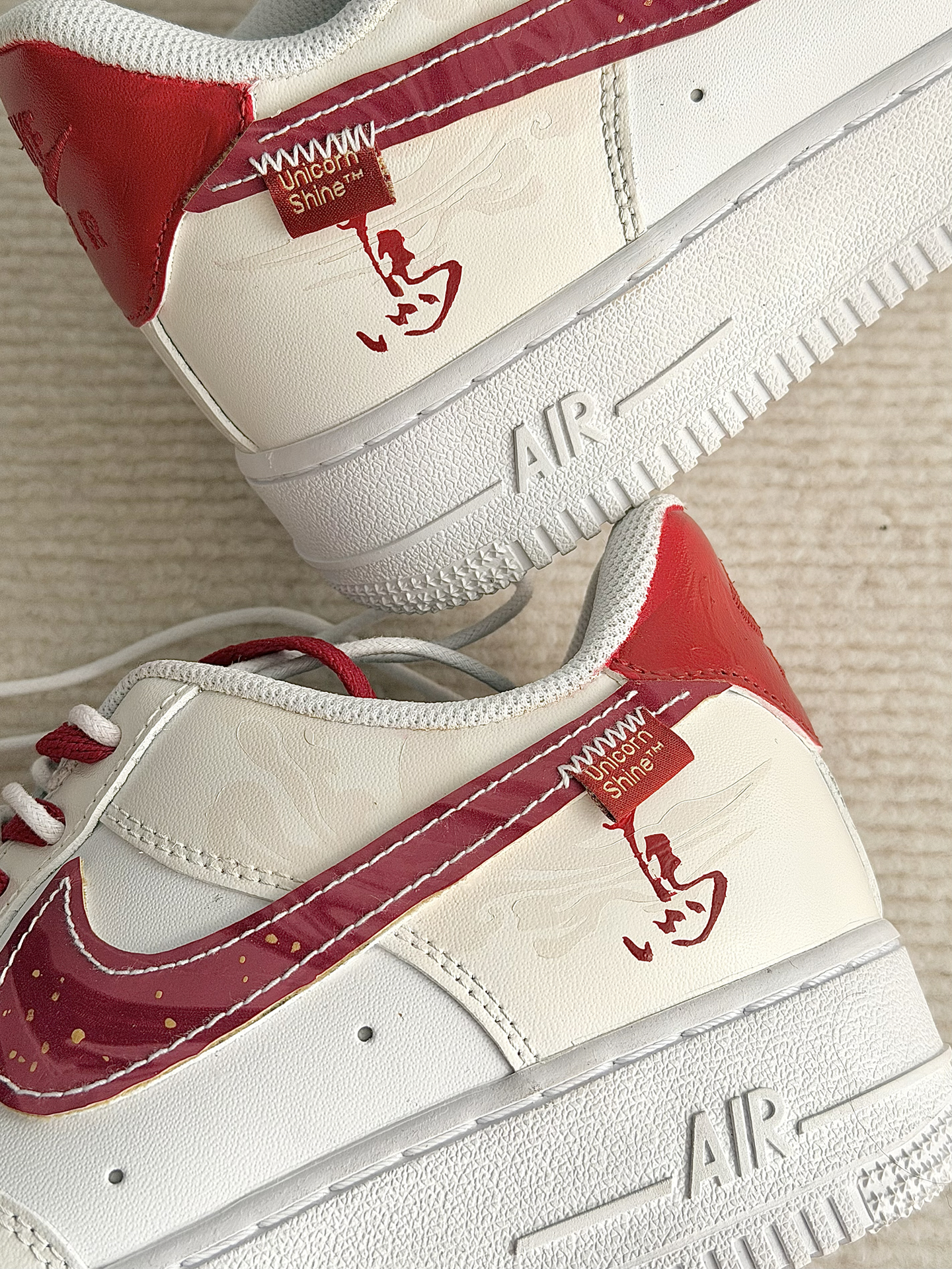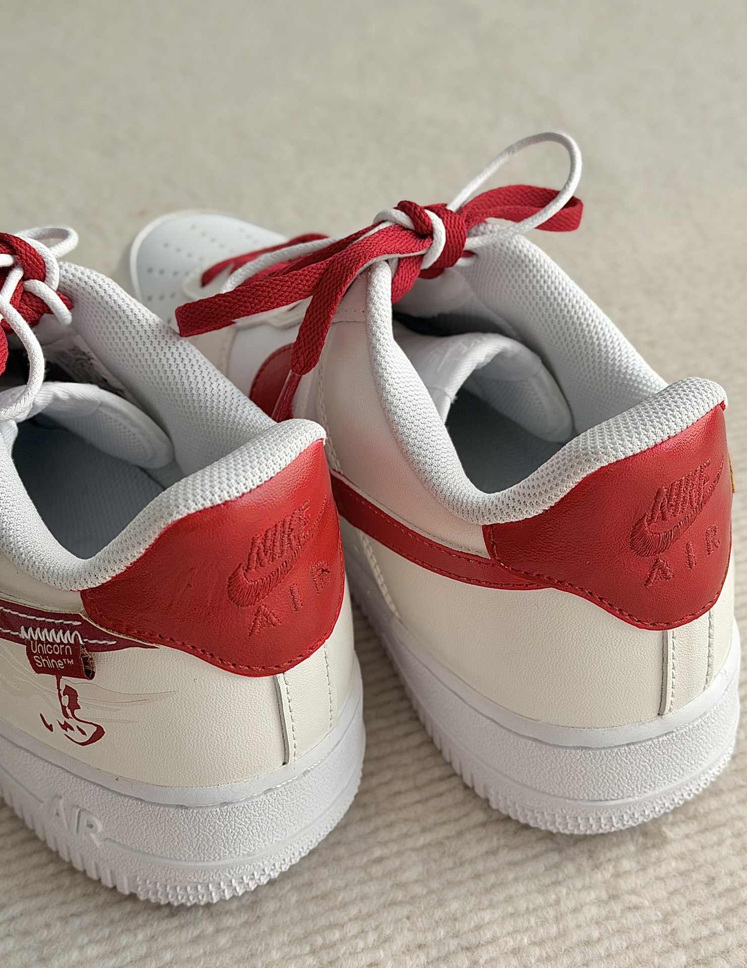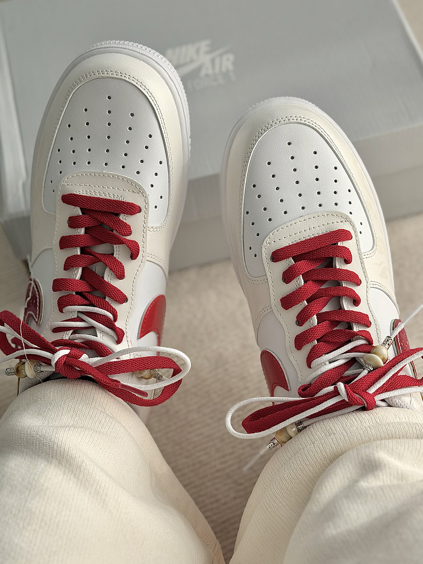 这双定制款马年限定的AF1米红 白红的配色看上去很喜庆 适合在过新年的时候穿着 米白色的鞋面上有云纹的图案 鞋面之上有马的汉字 马年限定的身份直接拉满啦 鞋带加上了珠子的点缀 看上去高级感十足 这双鞋子搭配牛仔裤 卫裤 我觉得都很好看的! #马年限定穿这双 #当我以为穿得很潮 #当我以为穿的很潮 #韩味超浓的冬日穿搭 #春节就穿这套战袍
