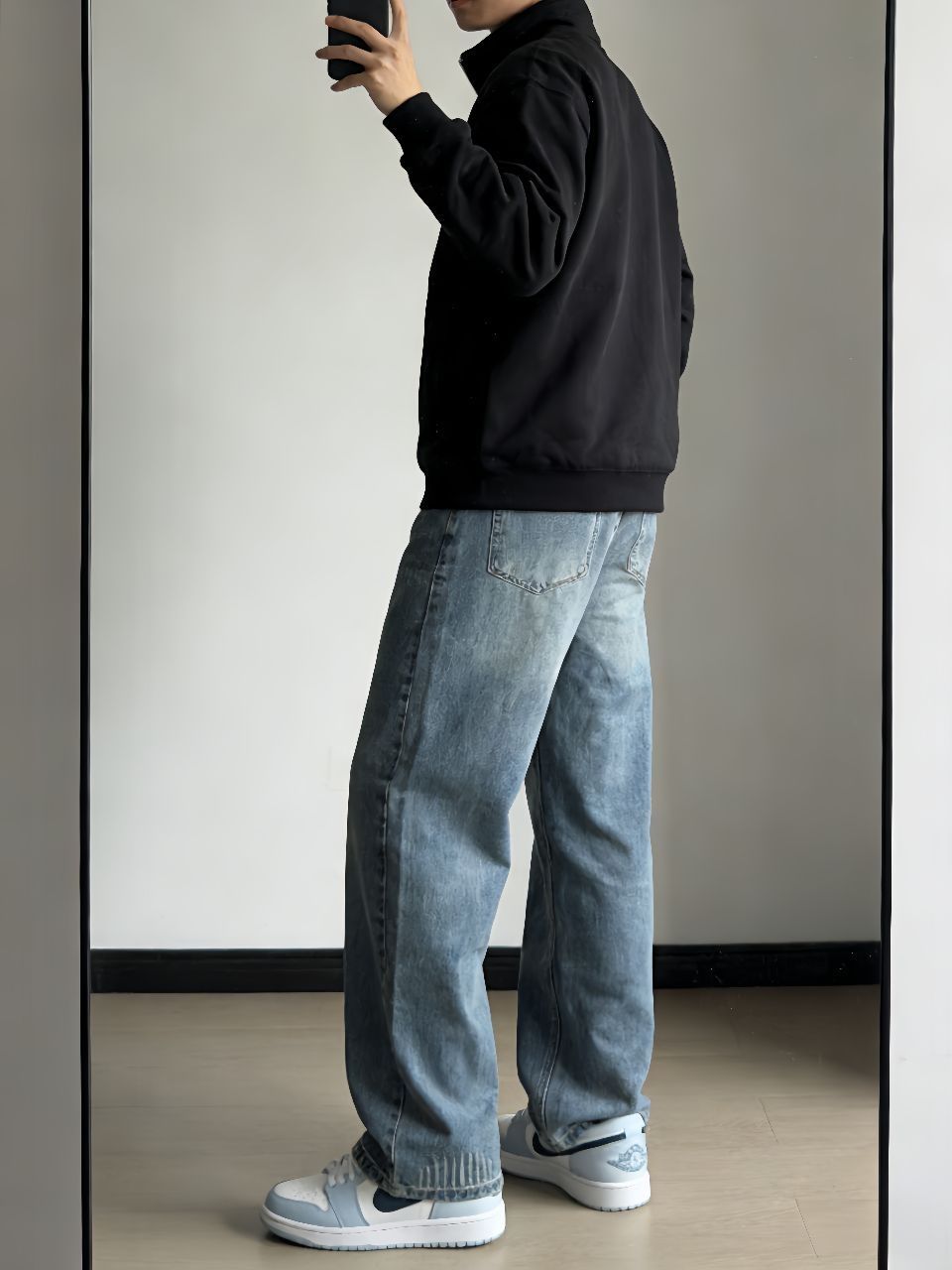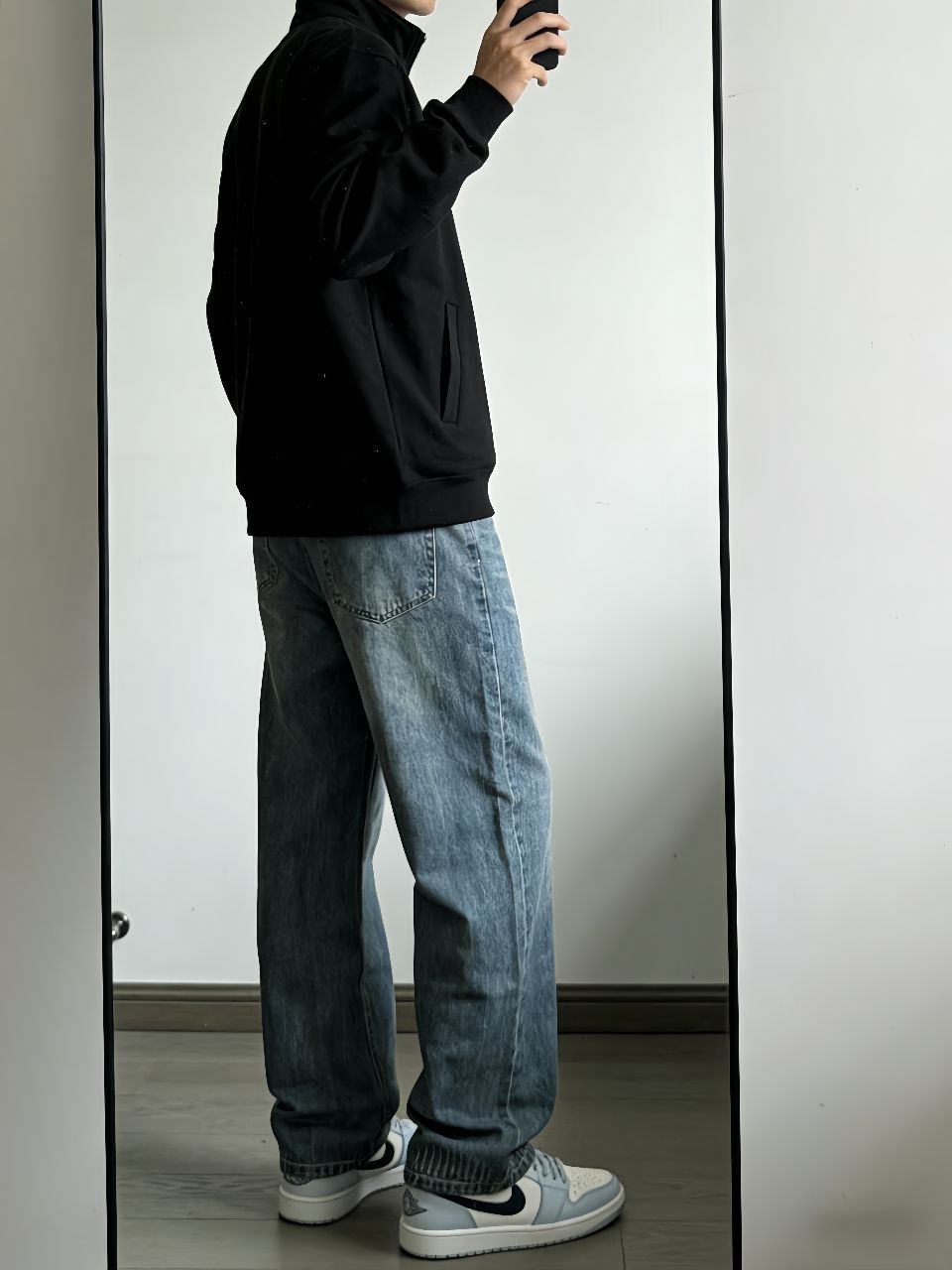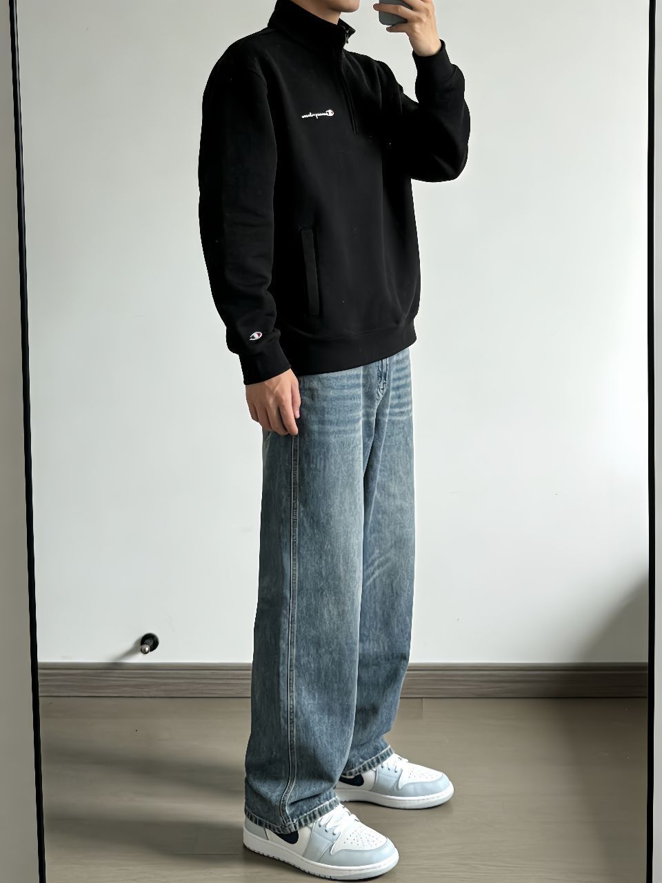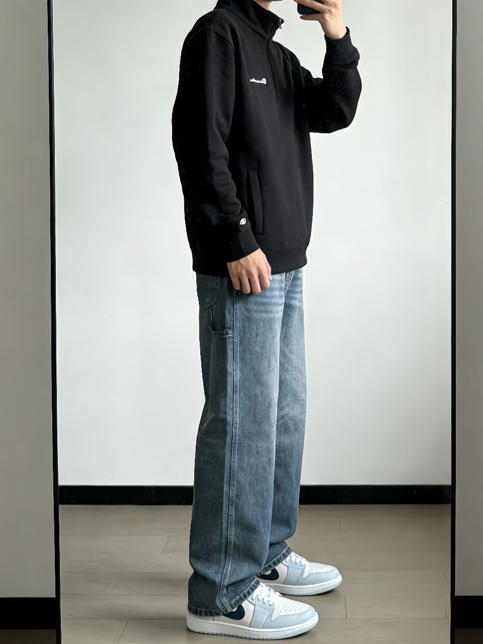最近出门就爱这套,抗风又随性! 里头是Champion半拉链卫衣,加绒的贴身穿超软,草写logo简单好看。下身配这条Route66牛仔裤,版型真绝了,垂感显腿直,洗水颜色复古得很自然。脚上AJ1低帮蓝白刚好提亮,和上衣刺绣小呼应。这一身从早到晚都不累脚,通勤逛街裹上外套就走,保暖不臃肿,懒人必备了!