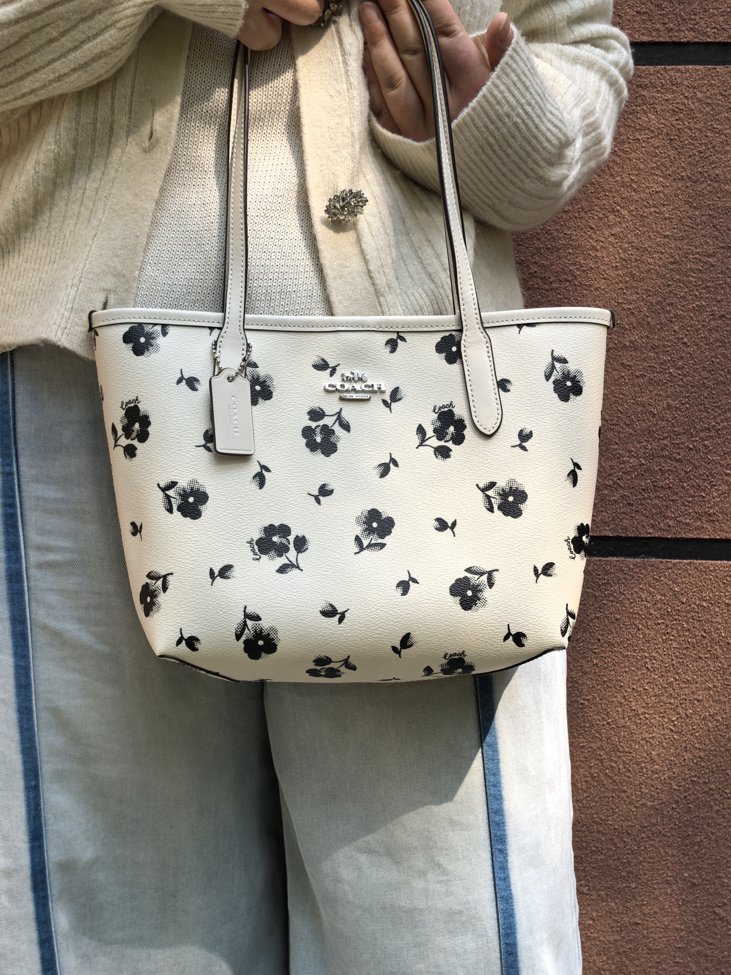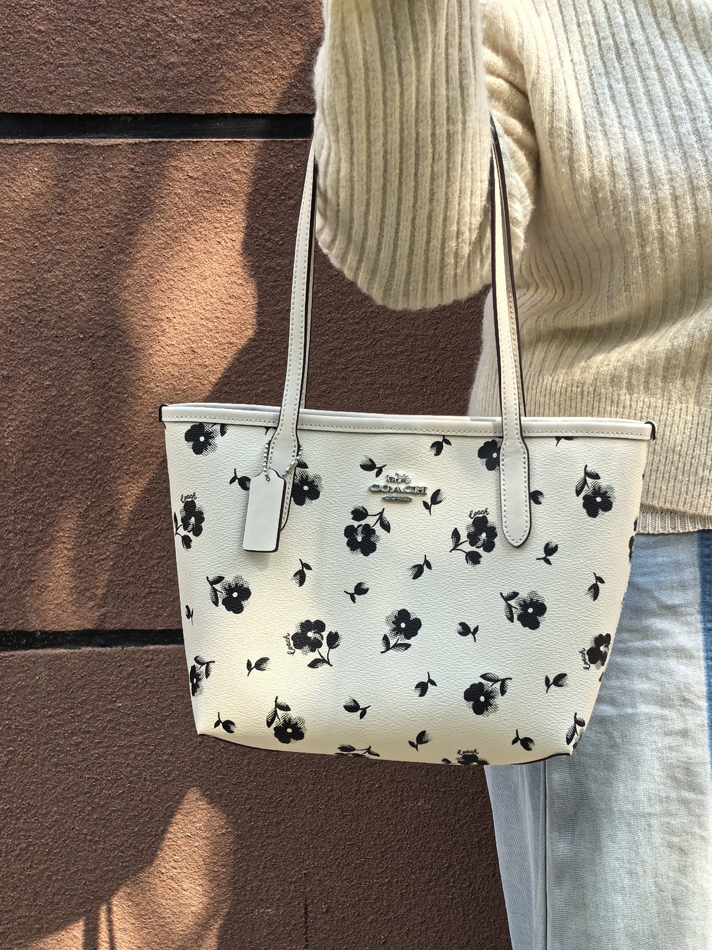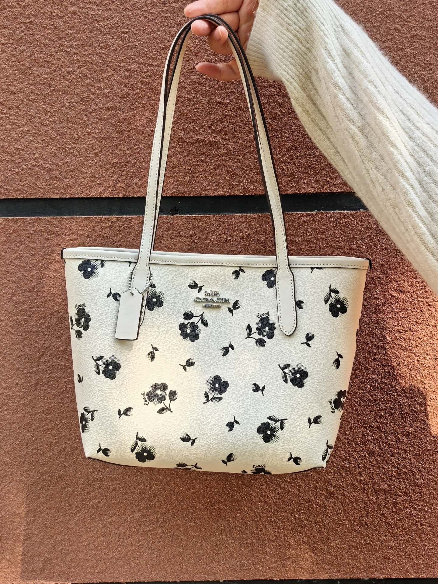 我发现个适合甜妹通勤的托特包!纯白底配渐变黑花,还有银色金属标,风格和老花满印不一样,蛮独特的~皮质软乎乎,我162背着肩带长度刚好,小个子应该也能驾驭。24尺寸装笔记本、防晒伞这些上班东西够使,就是没有夹层,找东西得翻一翻🤔 黑白配色搭衣服也省心,浅深都能配,日常背很合适~